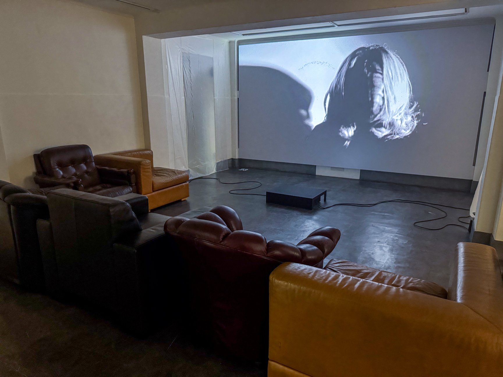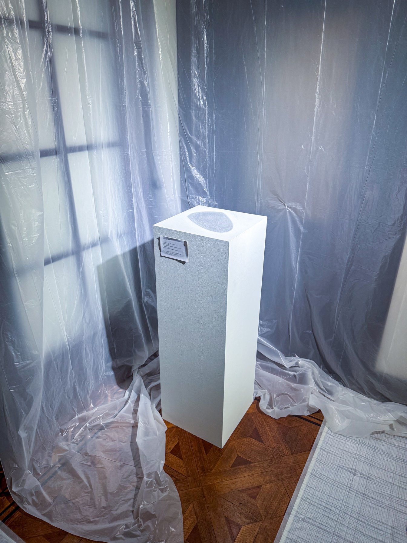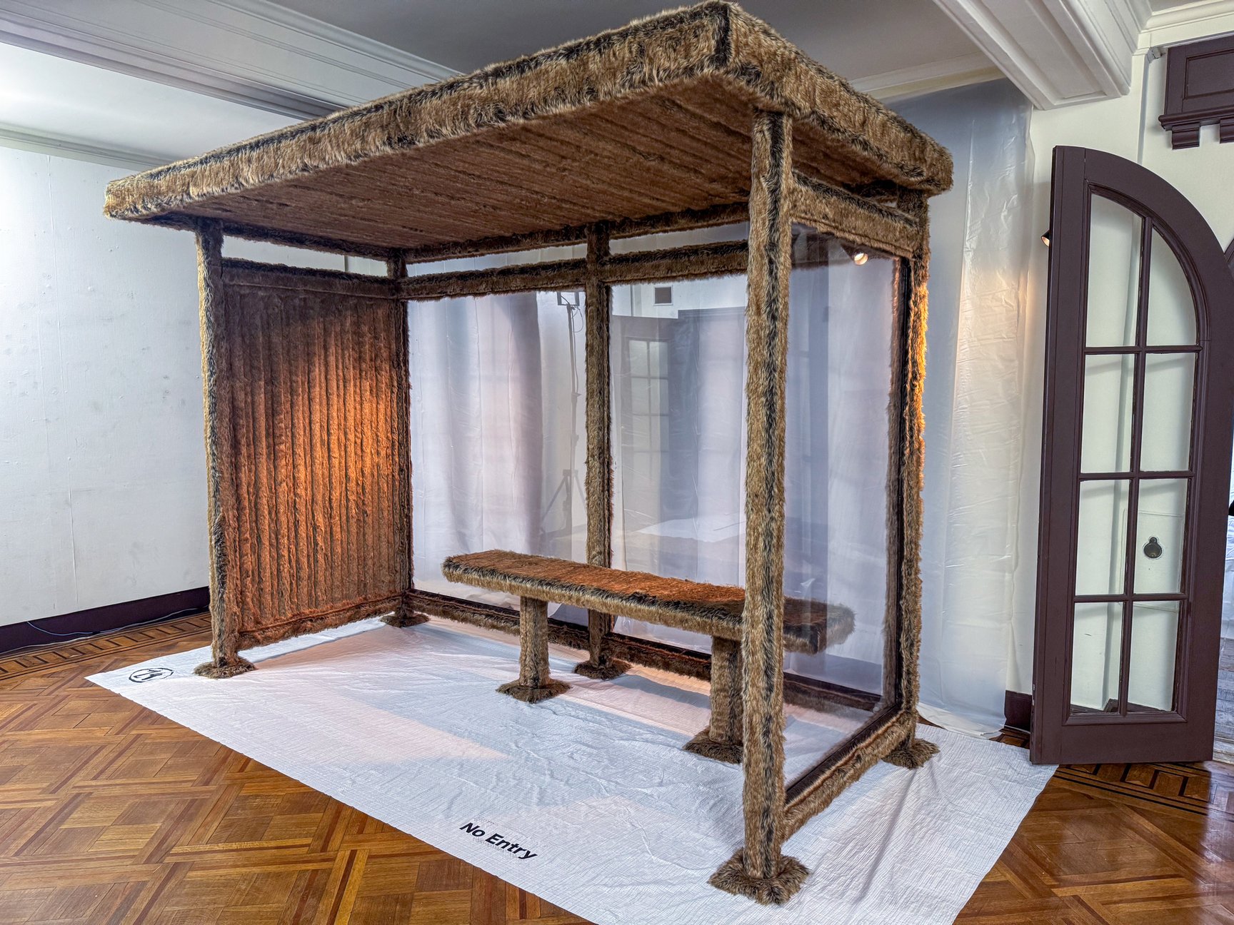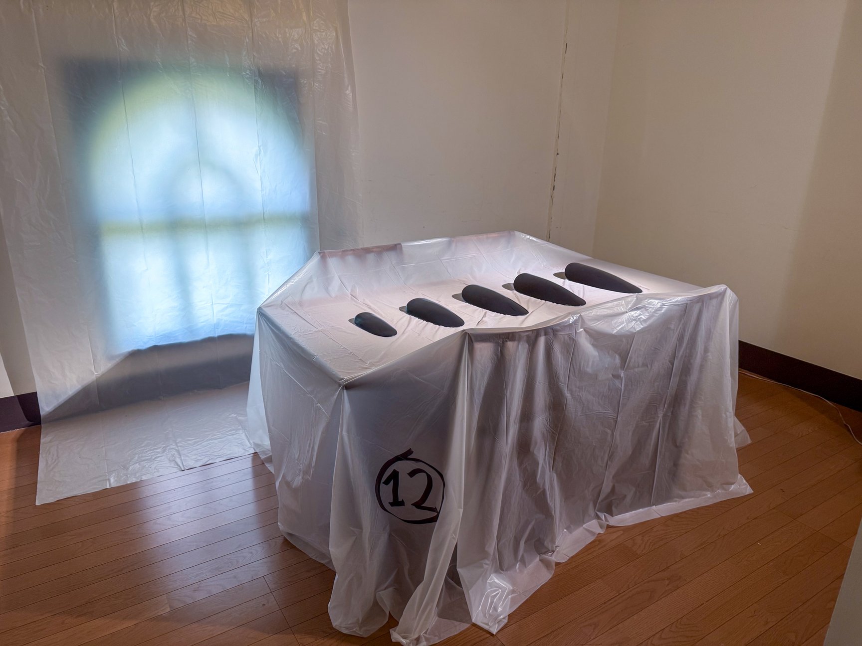 展覧会の空間演出とキュレーションは全てマルジェラ本人が担当。今回展示されている全作品には、「オブセッション(執着/obsession)」と「世界は仮固定である」という2つの概念が通底している。また、会場内の床や壁、家具などが半透明のビニールシートで覆われ養生テープが貼られていたり、作品が箱に入った状態で展示されていたりするなど、多様な形で「ワーク・イン・プログレス(進行中、未完成)」の状態を表現。それぞれが完成した作品でありながらも、常に変化し続ける世界の中での「未来への汎用性」を示しているという。