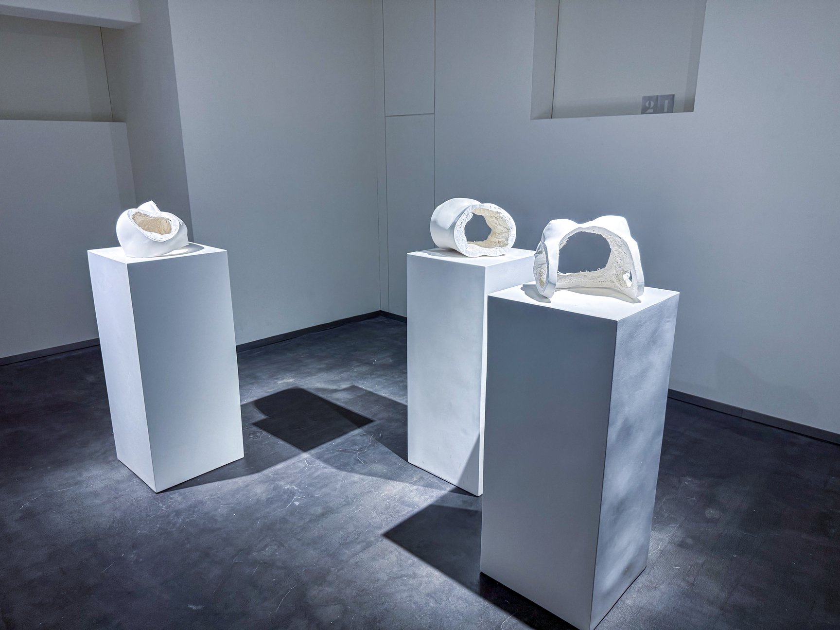 会場内では、マルジェラの長年の“執着”の対象の一つである人間の髪を用いた作品群をはじめ、痕跡から存在を想像させる彫刻シリーズ「Phantom」や、キャンバス上にカーペット素材で階段を描いた「Grey Steps」、保護バリケードをフェイクファーで覆った「Barrier Sculpture」など、多彩な作品を披露。マルジェラ自身がルーヴル美術館の鋳造倉庫を訪れた際に、まるで亡霊のように大量に収蔵されていた鋳造型から着想を得た「Mould(S)」と、その鋳造型から生み出された彫刻シリーズ「Torso」をともに展示するなど、完成形とそのプロセスの双方を作品として見せている点にも、マルジェラらしさが表れている。