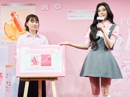 また、会場にはロムアンドのモデルを10年務めているソン・ジヨンも登場。ブランドの魅力について「10年間モデルを務めて感じたのは、単に色彩をうまく作るだけでなく、消費者と絶えずコミュニケーションを取り、その意見を真摯に反映しながら消費者と一緒に成長してきたブランドだということ。みなさんが本当に求めている製品を考え続ける姿が印象的です」と賞賛した。