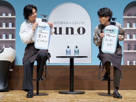 メンズビューティブランド「ウーノ(uno)」が、今年発売した「4D オールインワンシャンプー」の世界観を体現するCMを4月20日から放映する。CMに出演した俳優の山﨑賢人と藤木直人が発表会に登壇。撮影時のエピソードや商品の魅力を語った。
