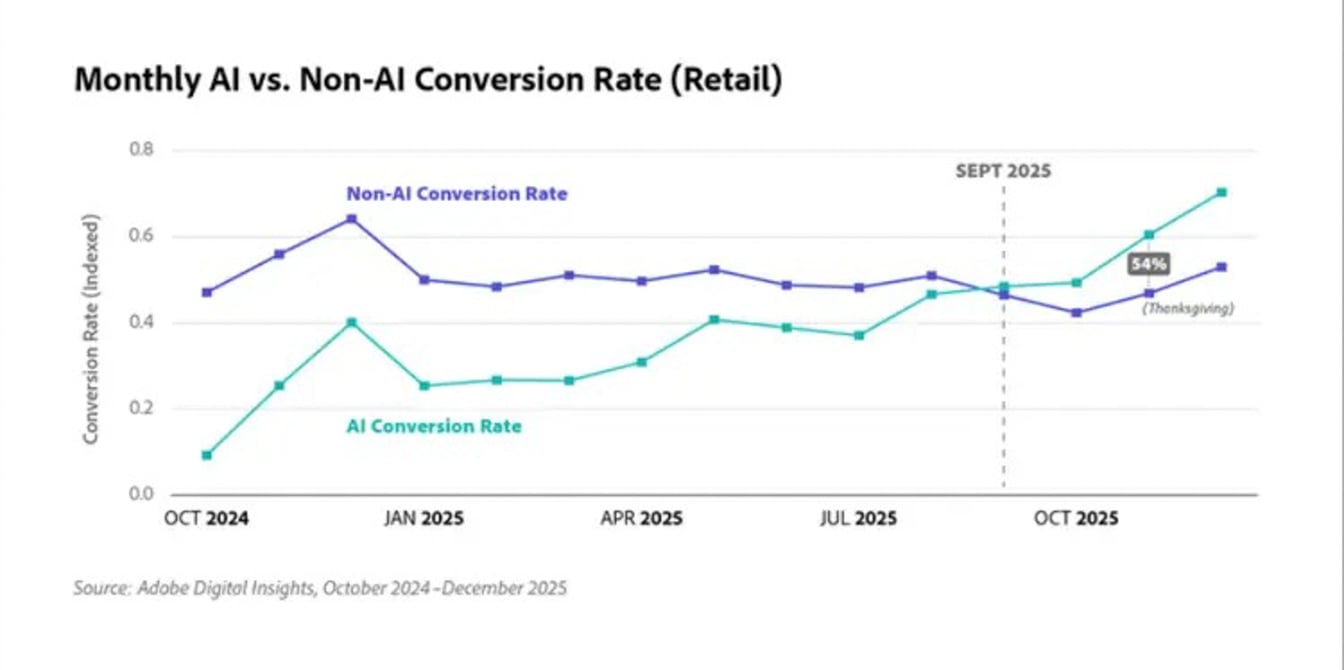 2025年ホリデーシーズンで明らかになった、より深いエンゲージメントは、コンバージョン率の増加にも直結しています。これまで他のトラフィック起点に後れを取っていたAI経由のトラフィックは、他の経路より 31%高いコンバージョン率 を記録し、今回前年比2倍近く成長しました。これに加え、生成AI経由の訪問あたりの収益(RPV)も、今シーズンにおいて年初来254%の増加を示しています。主要ショッピングイベントではその差がより顕著で、感謝祭ではAIコンバージョンが非AI比54%増、ブラックフライデーでは 38%増 となりました。