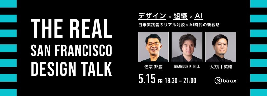 当日は、Brandon K. Hill(btrax)、佐宗 邦威氏(BIOTOPE)、太刀川 英輔氏(NOSIGNER)が登壇し、日本とアメリカにおけるデザインの役割の違いや、AI時代に求められるデザインのあり方について議論します。