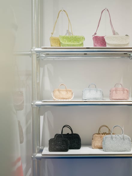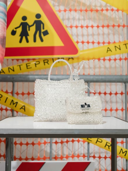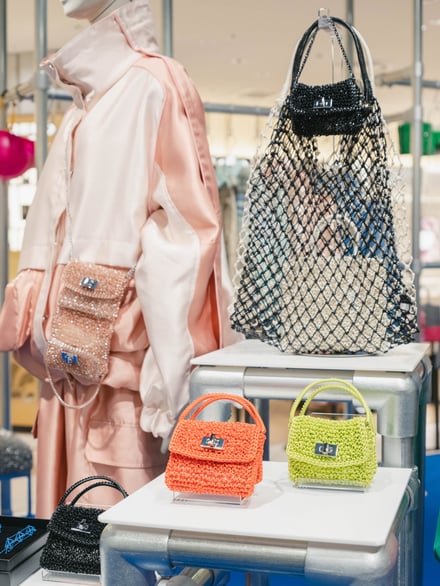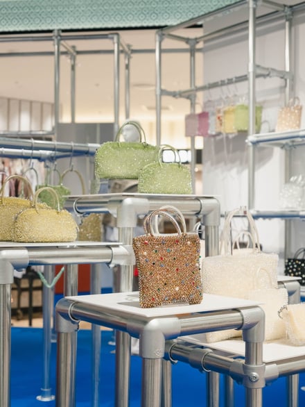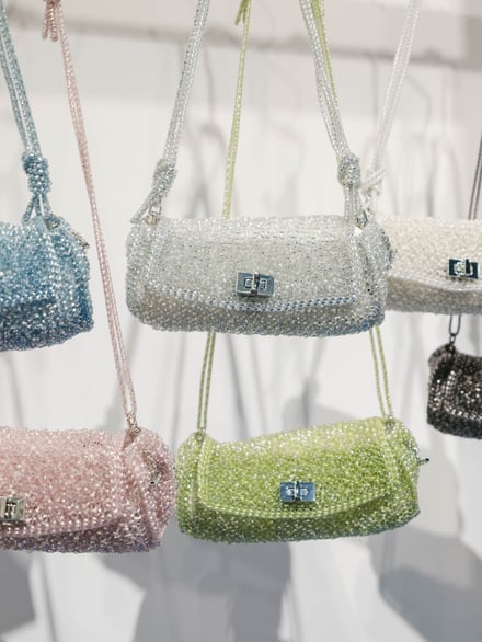 ポップアップでは、岩崎とのコラボレーションバッグをはじめとする、さまざまなビジューデザインの新作ワイヤーバッグをラインナップ。ワイヤーコードにビーズやパールを編み込んだ華やかな輝きが特徴の「ペルラ グリッター」や、ハート型のビーズを編み込んだ「テゾーロ」、マルチカラーのビーズをランダムに配した「ジェンメ」は、間口にジッパーが付いたチェーンバッグタイプの新型を先行販売している。