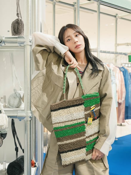 堀田は、ホワイトとグリーンでまとめた爽やかなスタイルに、ピュアシルバーカラーの岩崎とのコラボバッグを合わせた。「アンテプリマのワイヤーバッグは、一つ持つだけでスタイリングを華やかにしてくれて、使い勝手が良くて大好き」と堀田。コラボバッグは、鉄塔やクレーンといった工業的なモチーフを歯ブラシの毛を用いて表現した岩崎の作品をイメージし、ワイヤーバッグに編み込まれているものと同じビーズを使用して作ったクレーンがあしらわれている。「繊細でユニークな、春の装いのワンポイントになりそうな楽しいデザイン。色味を抑えたシックなスタイルに合わせて、バッグの遊び心が際立つようなスタイリングを楽しみたいです」(堀田)。