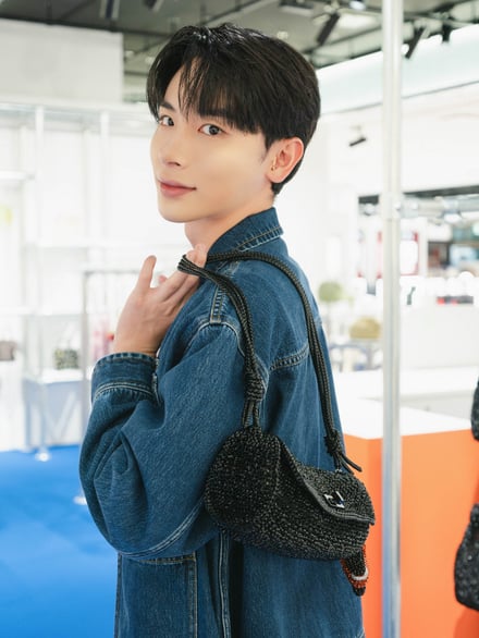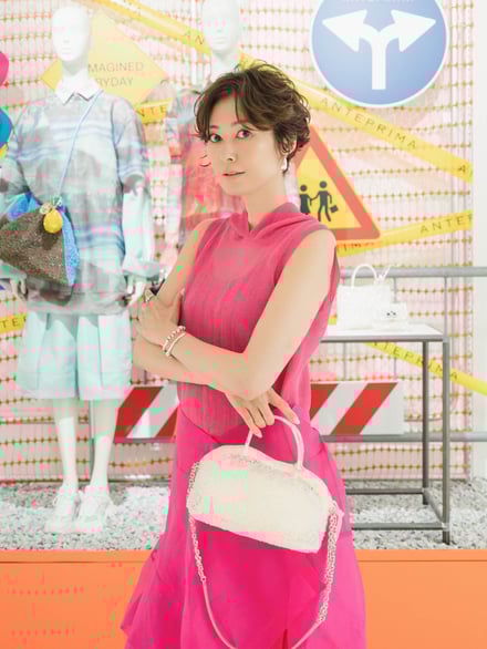 田丸は、鮮やかなピンクが目を惹くスタイリングを披露。建築物の「地上の実像」と「水面に映る虚像」を一体化させる岩崎の代表作から着想を得た、上下から複数の着方が楽しめる新作コレクションのシャツを腰に巻くことでアクセントに加えている。田丸がセレクトしたのはイタリア語で「アーモンドの砂糖菓子」を意味するオーバル型が特徴の「コンフェット」。田丸は「透明感があって美しく上品なのに、ジッパーやチェーンベルトが付属していているので、アクティブなシーンにも活躍しそう。夏のお着物から夏らしい爽やかなワンピース、ダメージジーンズとTシャツのような思い切りカジュアルなスタイルまで、さまざまなスタイルに似合いそうです」とコメントした。