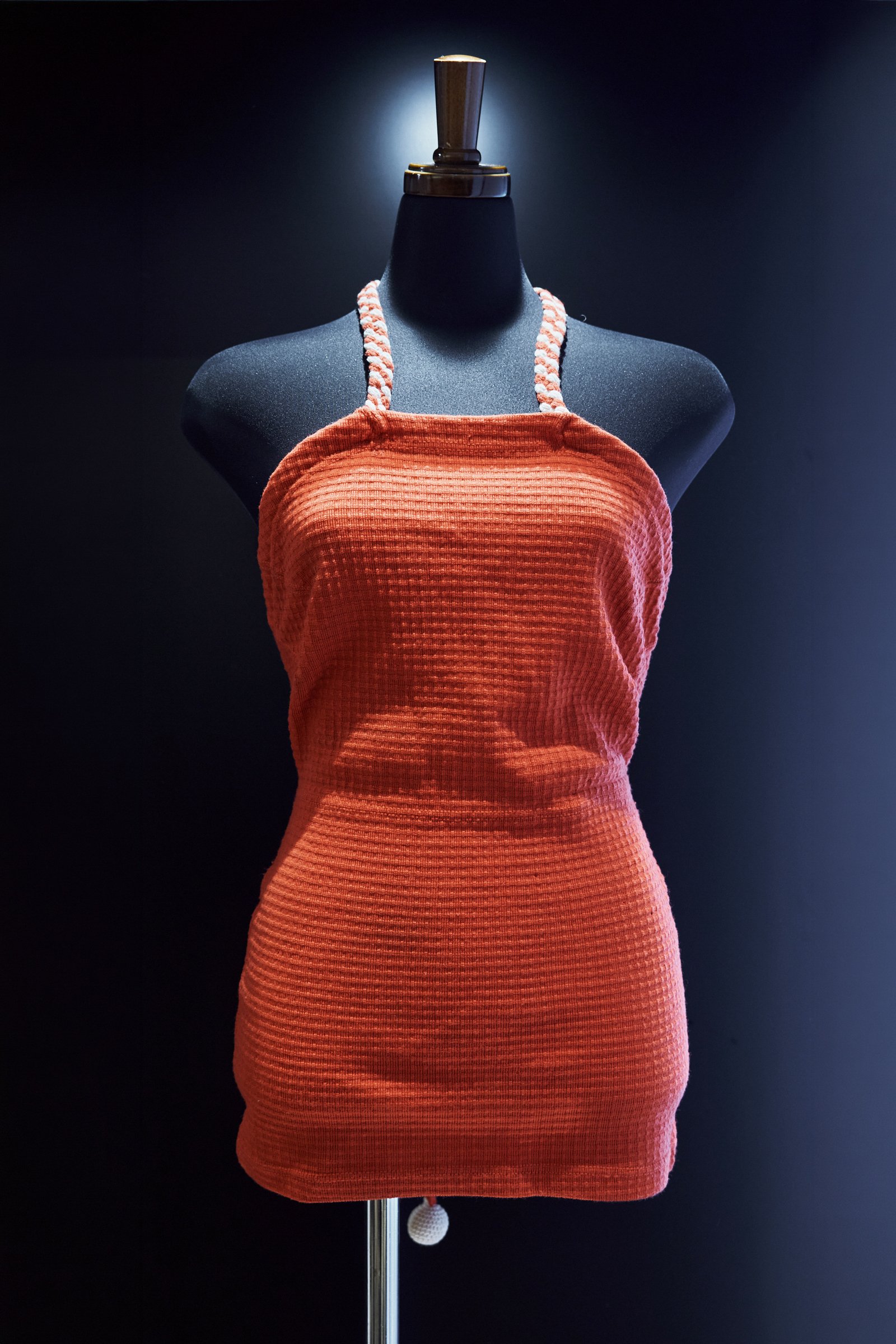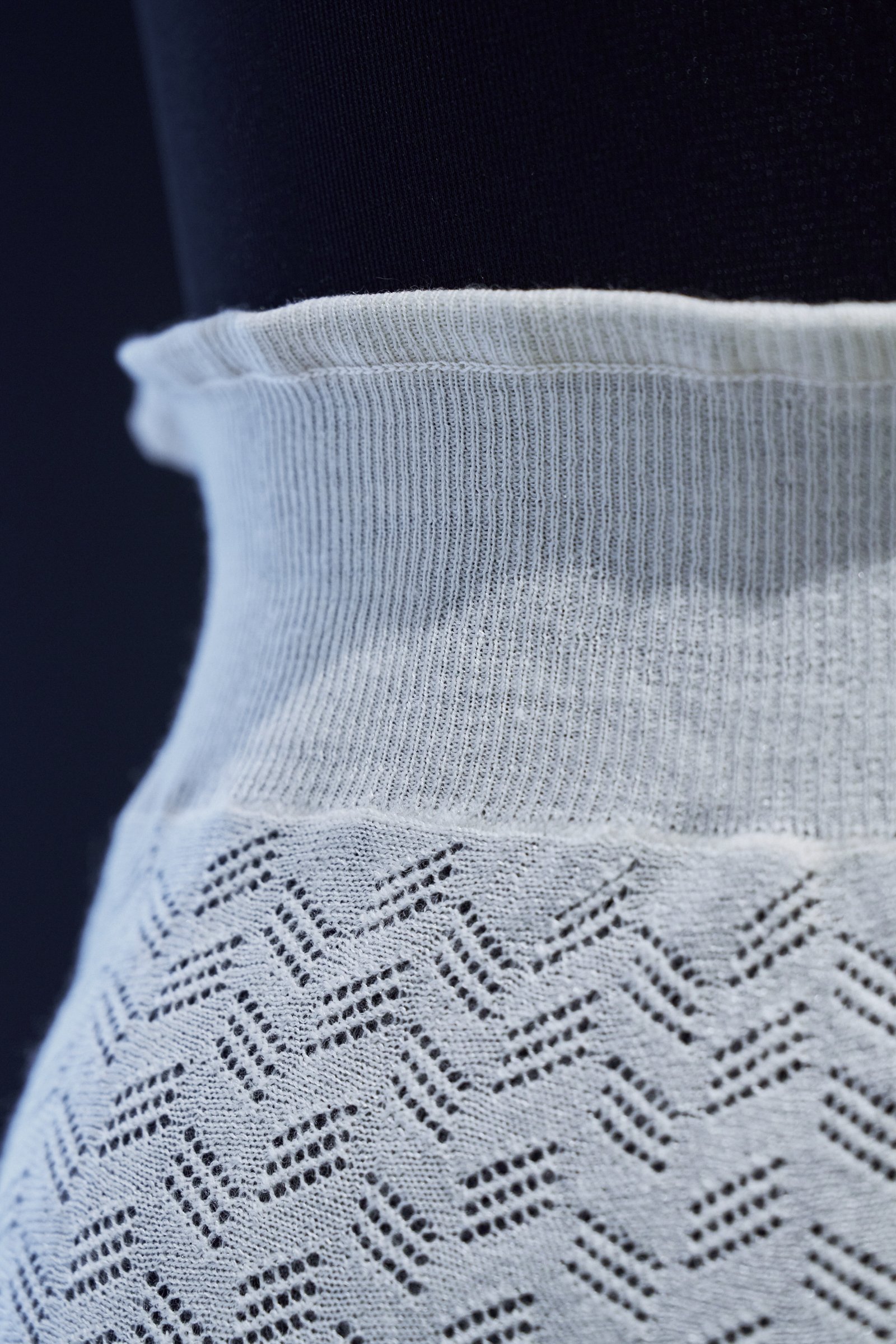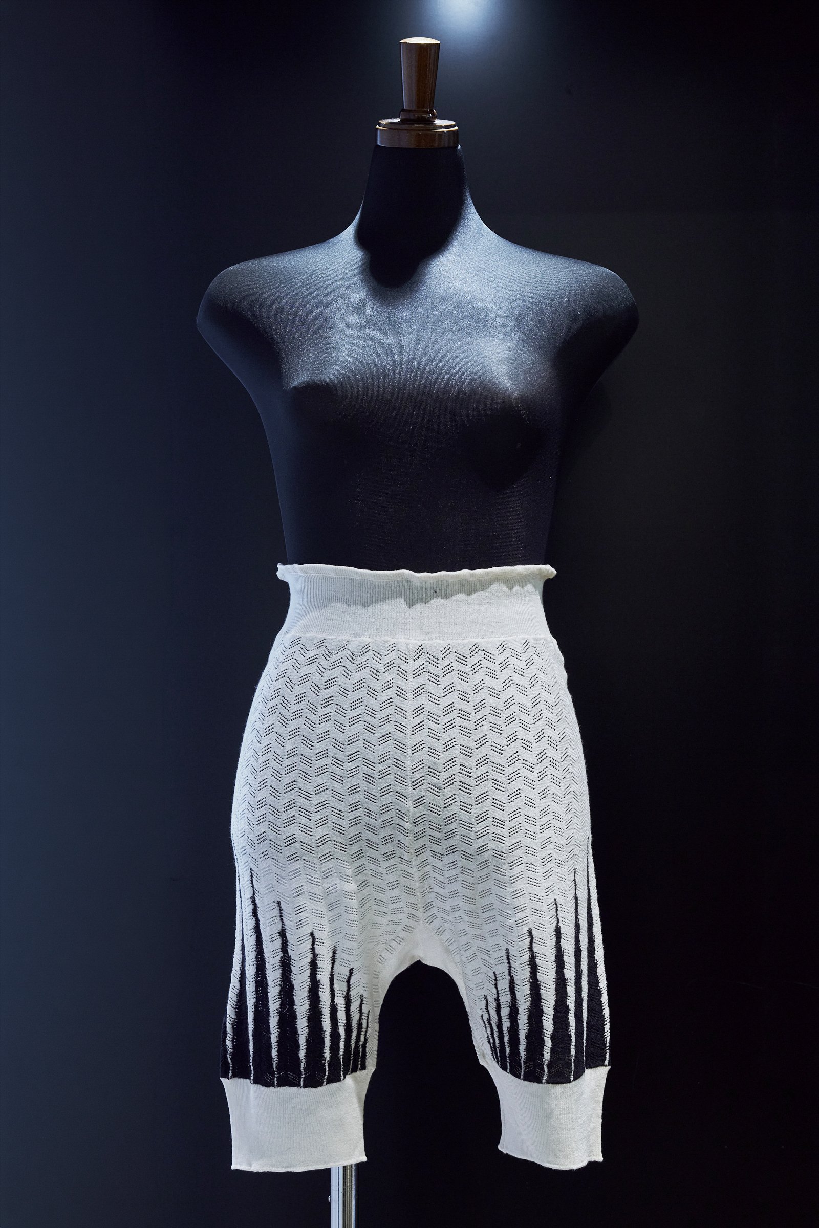 「ニットウェアとファッションの関係、その歴史を知りたければジョン スメドレーのアーカイブを見よ。そう言えるほど優れた記録が残っています」とスミス氏。会場には、服だけで1万3000点にのぼる膨大な資料の中から、同氏が今回の展示のために選んだ貴重なアーカイヴが揃う。1900年前後の製品だというワンピースタイプの下着は、コルセットに合わせて開発された「コンビネーション」と呼ばれるもの。ボタンを排し生地の重なりだけで股の開閉構造を実現した「Sラップ」など、斬新な工夫とニッティングの高い技術が光る。1930年代のシルク製アンダーパンツは、レース編みと大胆な柄が目を惹くアールデコ調のデザイン。コルセットフリーの直線的なラインや短い着丈が一般的になった時代のもので、前述のコンビネーションと比較することで服飾史の流れを感じることができる。