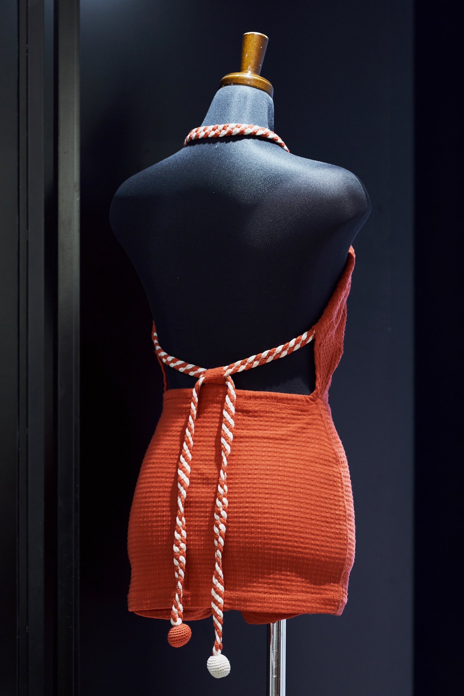 ココ・シャネル(Coco Chanel)の台頭により、従来下着用だったニットが上着の素材として認められた1930年代、ジョン スメドレーはニットの伸縮性を活かしたスポーツウェアを盛んに提案。展示では、定番ポロシャツ「ISIS」の原型となったテニスシャツのほか、バスケット編みのジャージー素材を使ったメリノウール製の水着が並んだ。また、同時期にニットはタウンユースのファッションアイテムとしても発展。その潮流を象徴するアイテムとして、当時のデザインチームを率いたレスリー・バニスター(Leslie Bannister)によるネクタイ付きのプルオーバーが紹介され、スミス氏は「ネクタイのディテールや色みが、現代でも全く古びずに素敵だと思います。こうしたアーカイヴは、新作をデザインする上での着想源にもなっているんです」と語った。