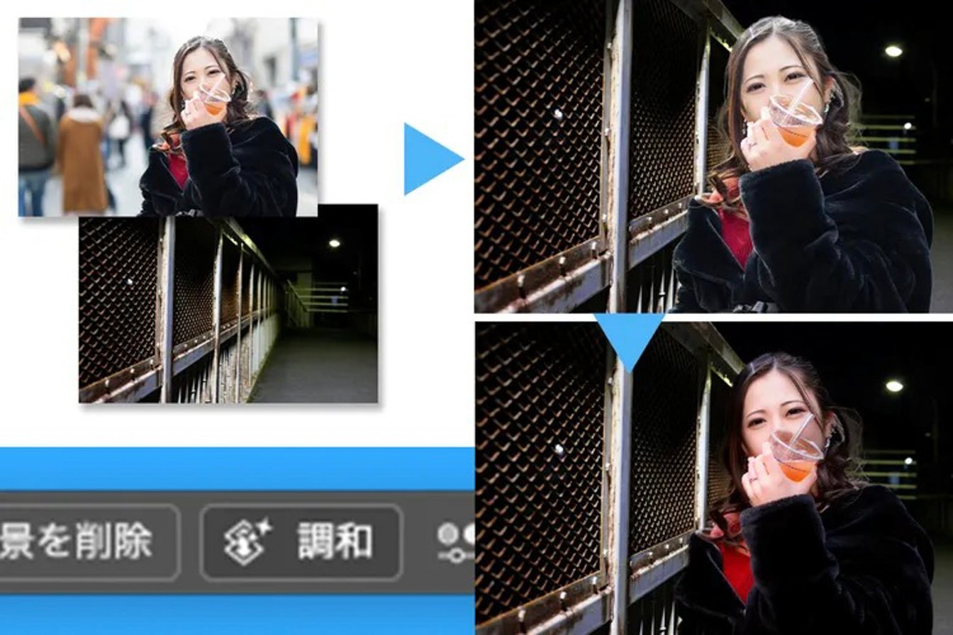 Photoshopの「調和」を使うと、合成した被写体を背景に合わせることができる