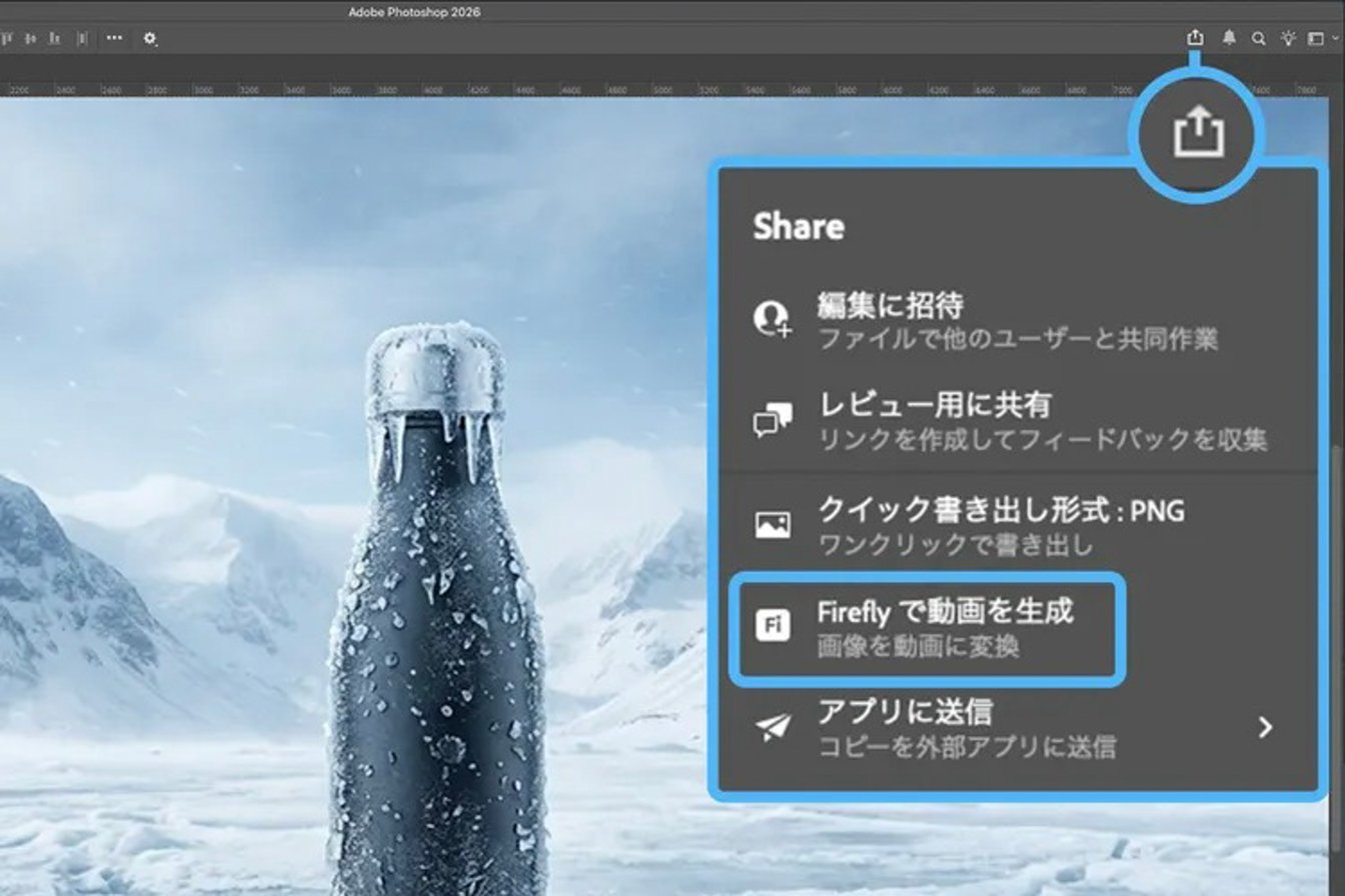 Photoshopのオプションパネルから「Fireflyで動画を生成」を選ぶ