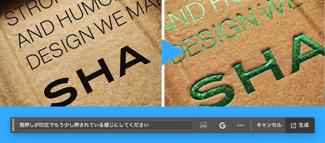 文字を合成し、「生成塗りつぶし」で箔押しをシミュレーション