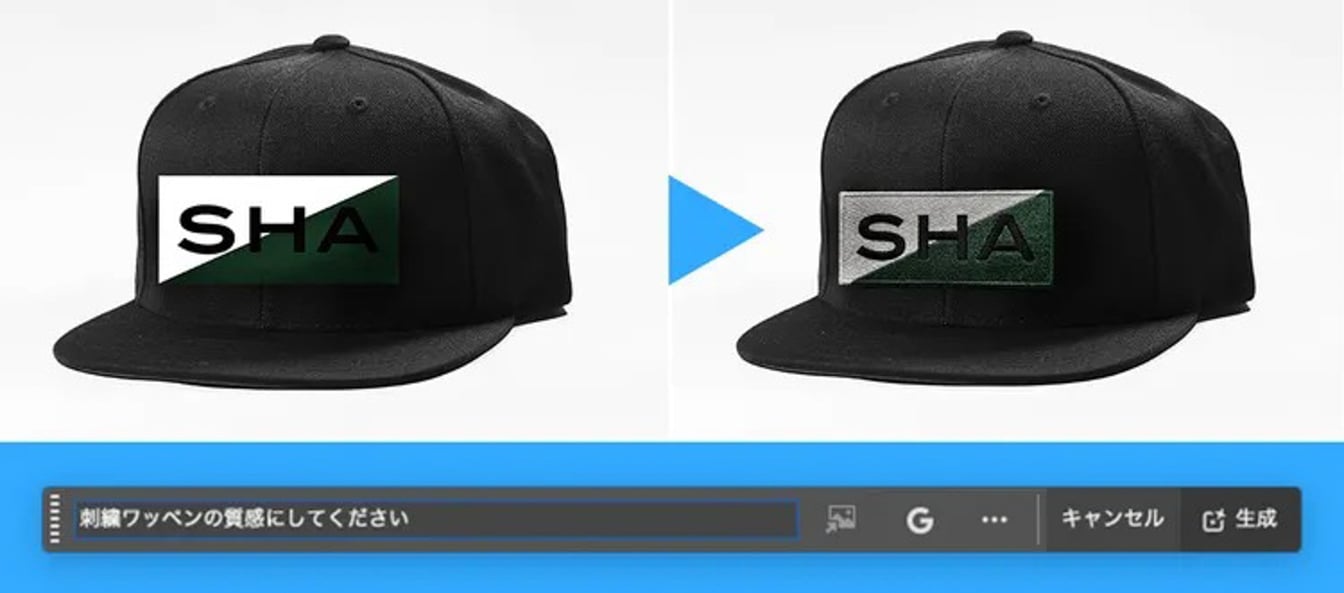 キャップにロゴを合成し、「生成塗りつぶし」で刺繍風に