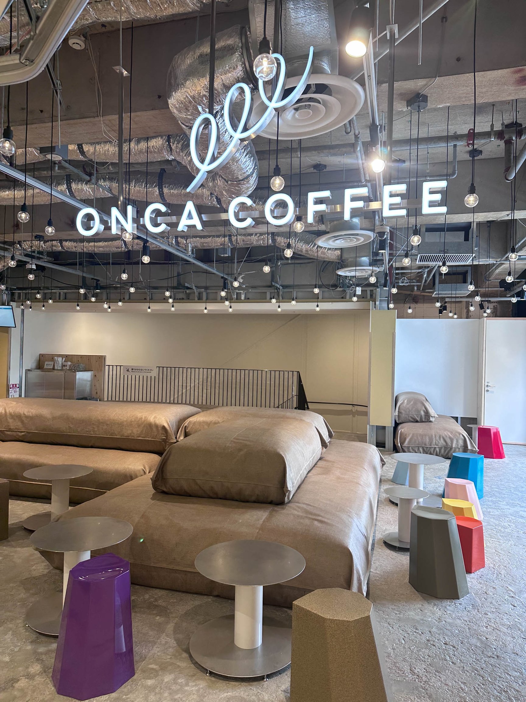 3階には、ジンズが展開する「オンカコーヒー(ONCA COFFEE)」のカフェが出店。前橋のジンズパークに店舗を構えるオンカコーヒーのロースタリー&カフェで焙煎されたコーヒーと、自社ベーカリー「エブリパン(EVERYPAN)」のフードを提供する。カフェのみの利用も可能で、ジンズとリムのオープンが朝10時半なのに対して、オンカコーヒーは7時半から営業する。
