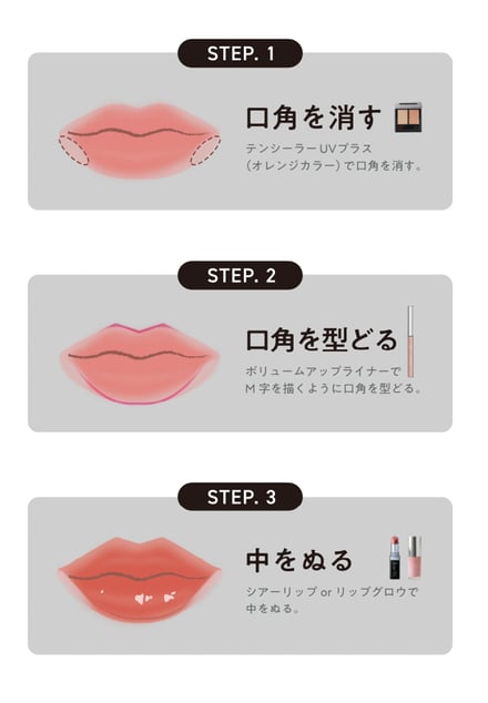 河北は「唇の印象が顔全体を変える」とし、新作のリップアイテムを使用した“マイナス10歳見え”するメイクを提案。まずコンシーラー「テンシーラーUVプラス」のオレンジカラーで下唇の口角をカバー。その後、リップライナーでM字を描くようにオーバーに上唇をかたどることで、人中を短く見せる効果を狙う。さらに、下唇の端を本来の輪郭よりも内側に描くことで口角を上げて見せ、最後に、リップスティックやリップグロスを塗り、ふっくらとした唇に仕上げるという。