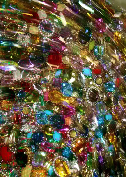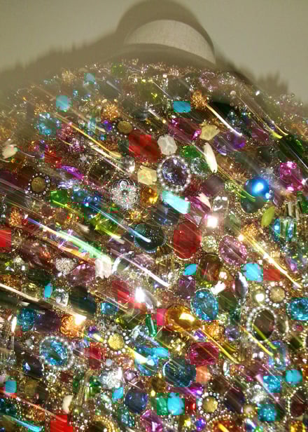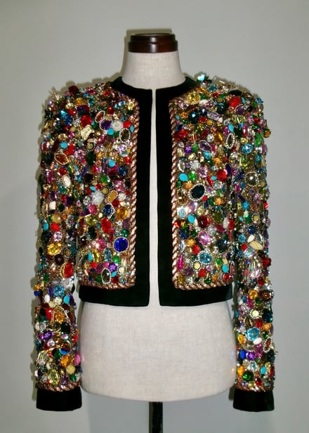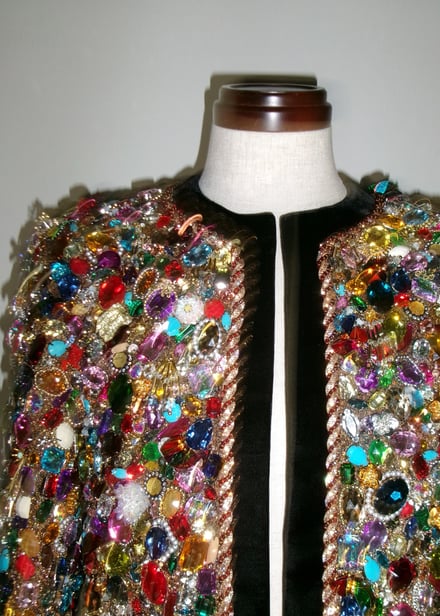 タナカダイスケによるカスタムジャケットは、ラメを織り込んだジャカード生地にカラフルなビジューを全面にあしらった。さらにビジューの周りをコードで囲み、立体感を演出。裏地にレースを用いるなど細部までこだわり抜いて仕上げたという。
