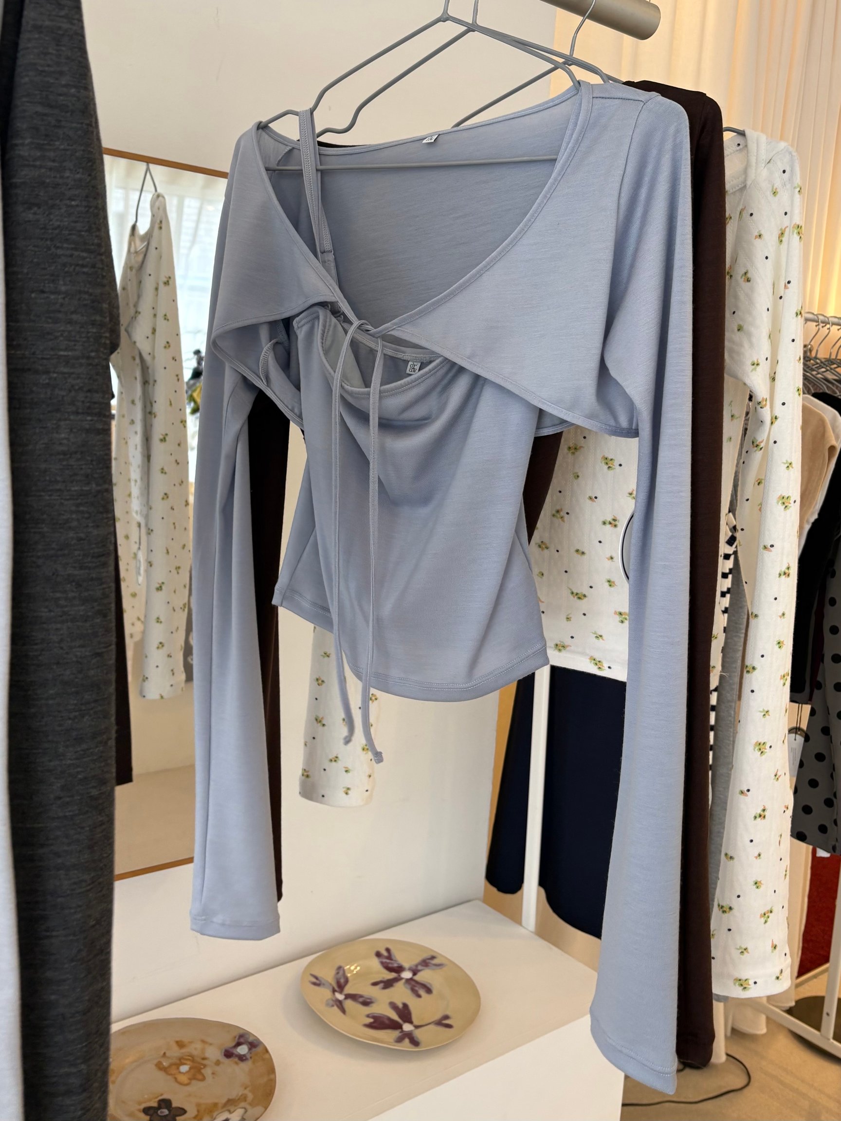 ポップアップでは「”Blossoming” A girl between innocence and maturity.(シンプルな中に、ちいさなときめきを重ねて。大人でも少女でもない、そのあいだにある今を)」をテーマに掲げた新作コレクション「8th Collection」を販売。「ブルーグレイ」と「ブラウン」の2色をコンセプトカラーに、天使の羽に着想した肩のデザインが特徴の「エンジェルティー」(1万3200円)や「3/4 スリーブティー」(1万4850円)、インナーとしても外着としても着用できる「シルクレースキャミソール」(2万2000円)、クラシックバレエの練習着に着想した「アームボレロ」(1万6500円)などをラインナップする。いずれも素材にはオーガニックコットン、シルク、ウールなどの天然繊維を採用し”ファーストスキン”のようななめらかな着心地にこだわったという。