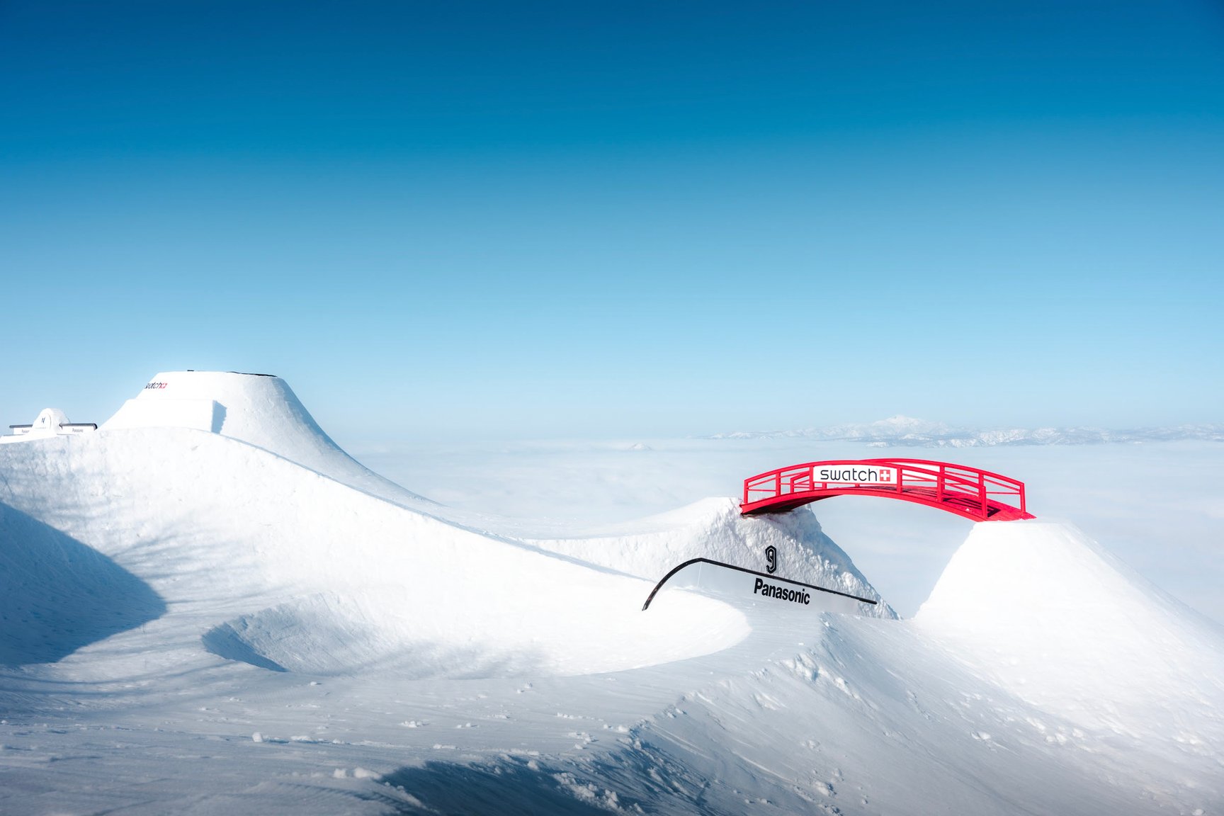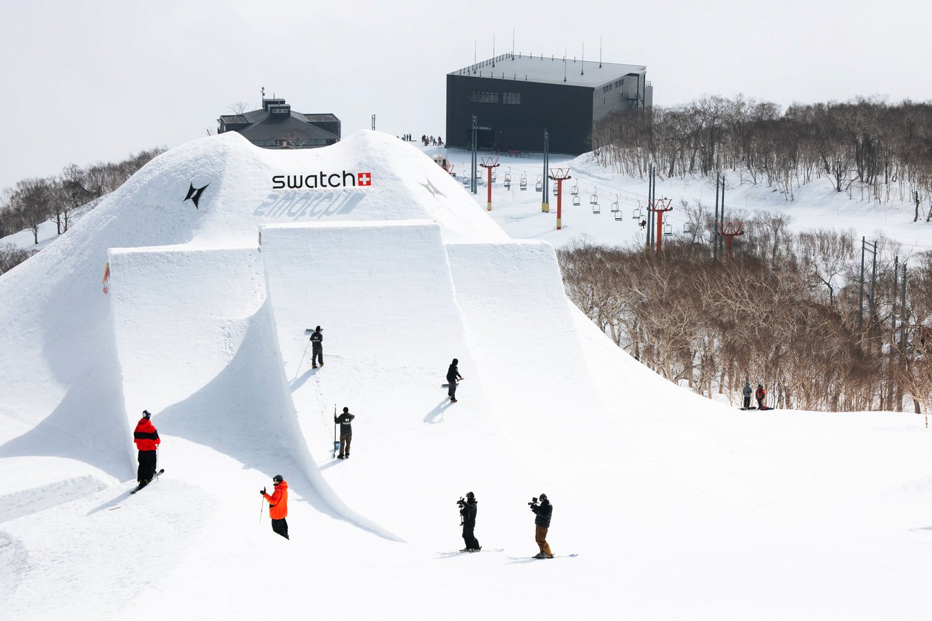 今回は、「スウォッチ」のプロチームに所属し、スノーボード・ハーフパイプにおける世界最高到達点(7.72m)の記録保持者である平野海祝選手をはじめ、2018年と2019年の「エックス ゲームズ」のスノーボードビッグエア部門で2大会連続優勝を成し遂げた大塚健選手や、ニュージーランド代表として「北京2022冬季オリンピック」にも出場した涌嶋弓流選手らが参加。昨年10月より議論を重ね、平野海祝選手が考案した巨大なクオーターパイプ「カイシュウズ QP」や、頂上部分にトランポリンが設置された円錐形ステージの「ミニ ヨウテイ JIB パーク」、史上最長となる50mのロングチューブ「ザ チューブ ウェーブ」など、オリジナリティ溢れるセットアップが誕生し、眼前に名峰・羊蹄山を望む「ニセコ東急 グラン・ヒラフ」に設置された。なお、設営は開催の約1カ月前より行われ、世界各国から招聘した17人のコースデザイナーが担当。人工的な雪を一切使用せず、全て現地の天然雪のみで作られるのも「スウォッチ ナインズ」の大きな特徴だ。