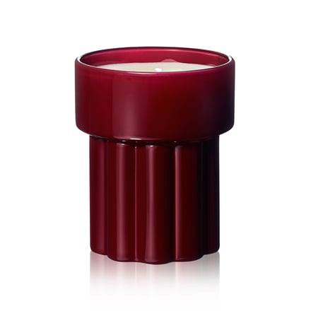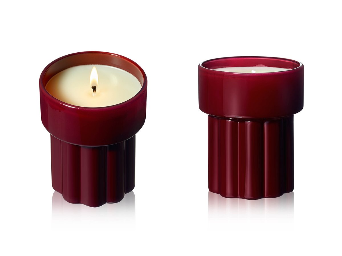 パッケージには、メゾンのシグネチャーカラーである深いレッドのラッカーガラスを採用。彫刻的なフォルムが光を捉え、炎の揺らぎとともに香りの変化を映し出す。