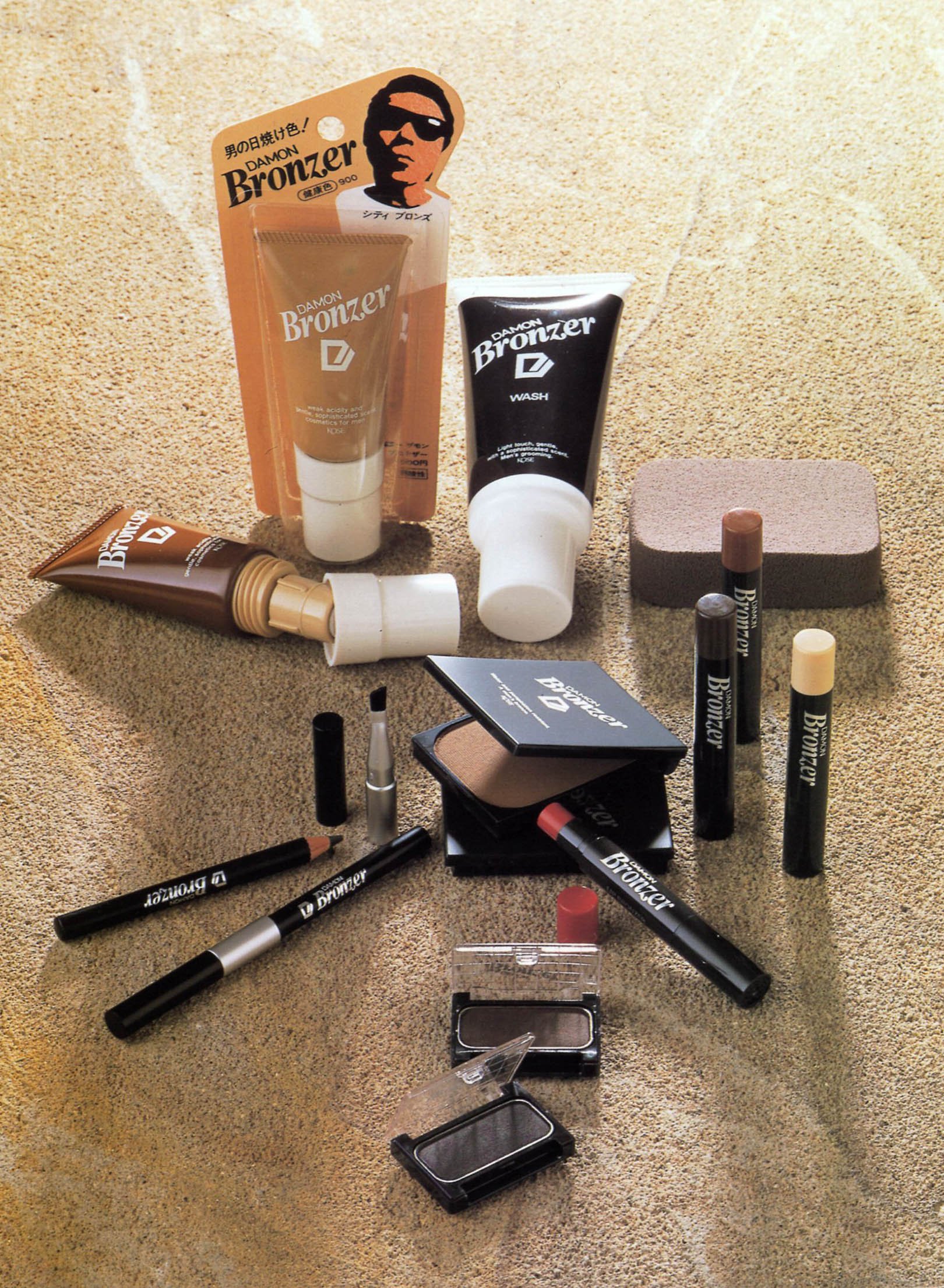 そして実は、澁澤社長は入社当初からメイクを実践していた人物。弊社は約40年前には、男性用メイクアップの先駆けとして「ダモンブロンザー」を展開していたのですが、このメイクアイテムを使って、自らメイクを施して営業をしていたのです。そんな澁澤は当時、仕事ができる目立つ存在で、販売店さまからとても人気がありました(笑)。
