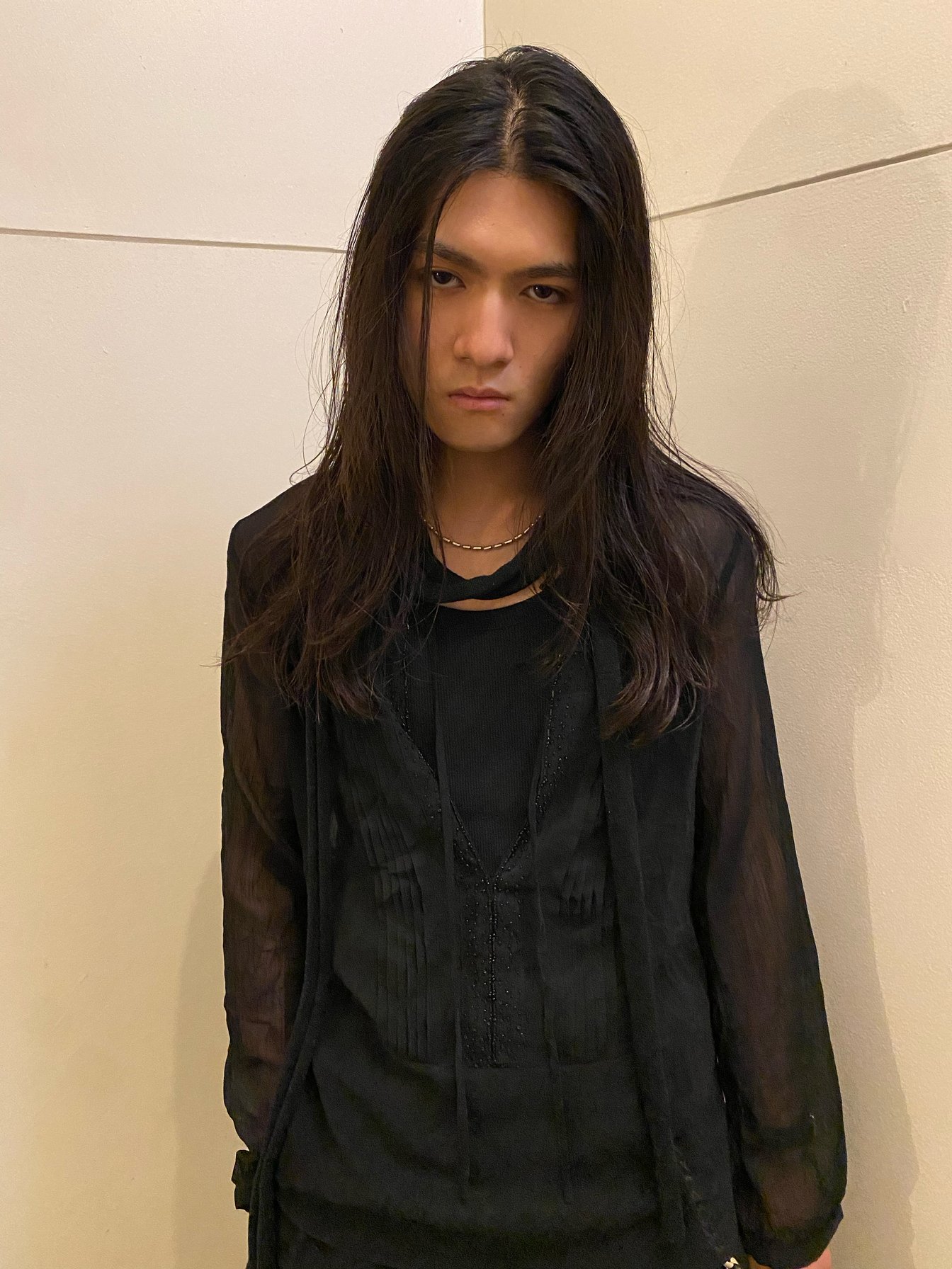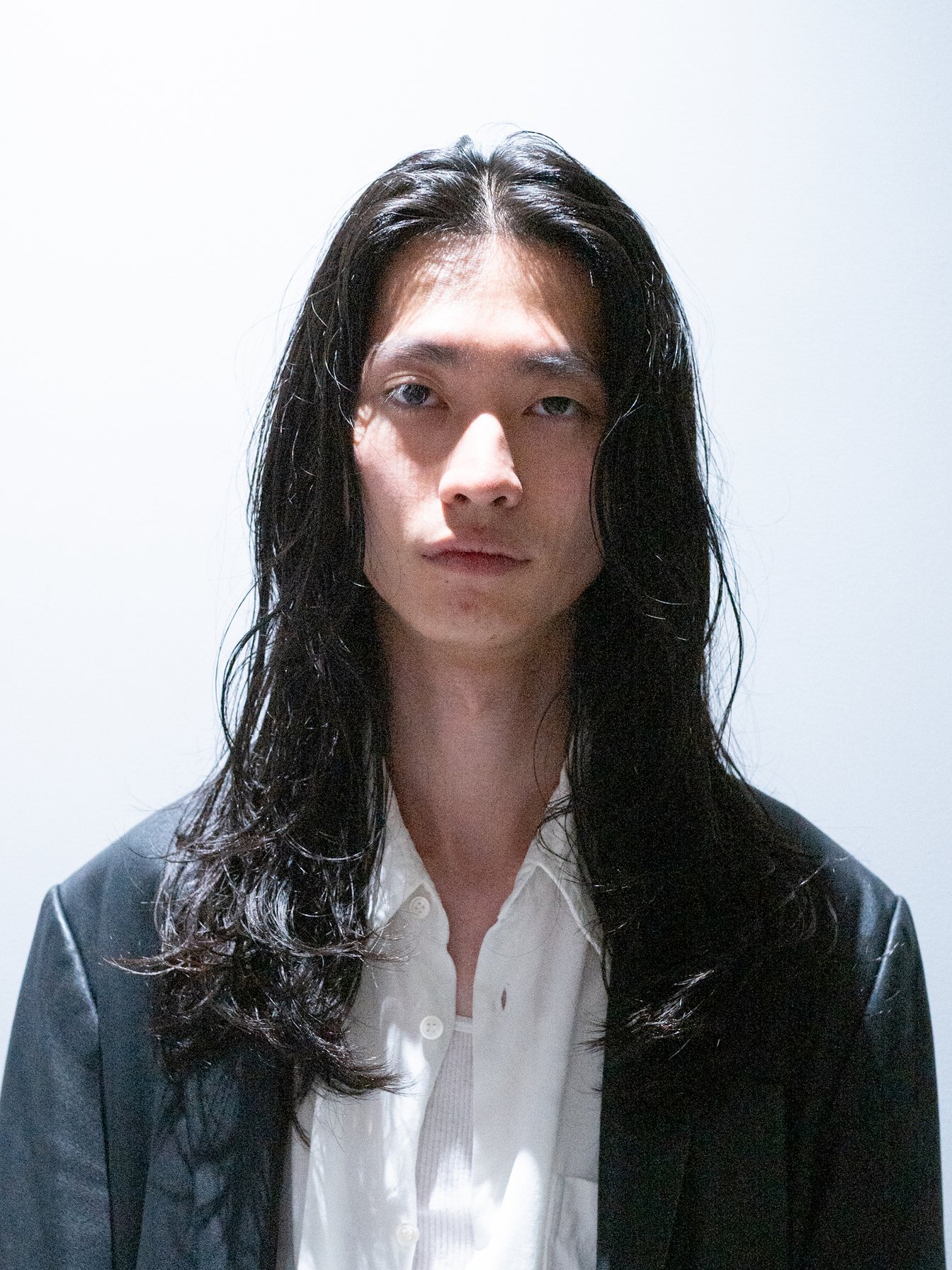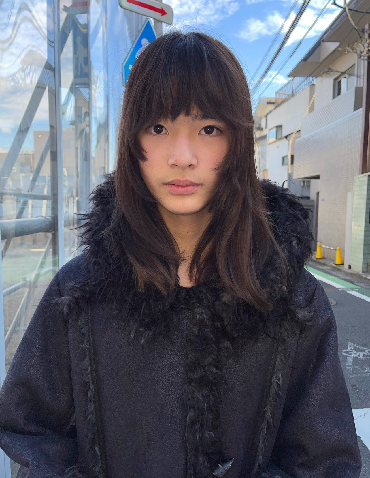 モード、ストリート、Y2Kに合うスタイルです。90年代を意識したロングヘアなのでカジュアルにするのもよし、結んだりもよし。レイヤーが入っていて軽さがあるので無造作でもヘアスタイルが決まるのが魅力です。セットすると濡れ感・動きがよく出ます。オーダーの際には、肩につくくらいの長さ。前髪は目にかかる長さを残してセンター分けで、表面は軽くしすぎず、束感が出るレイヤー。襟足は薄くしすぎず、首に沿う長さでお願いします。(@shinyakoyama0825)