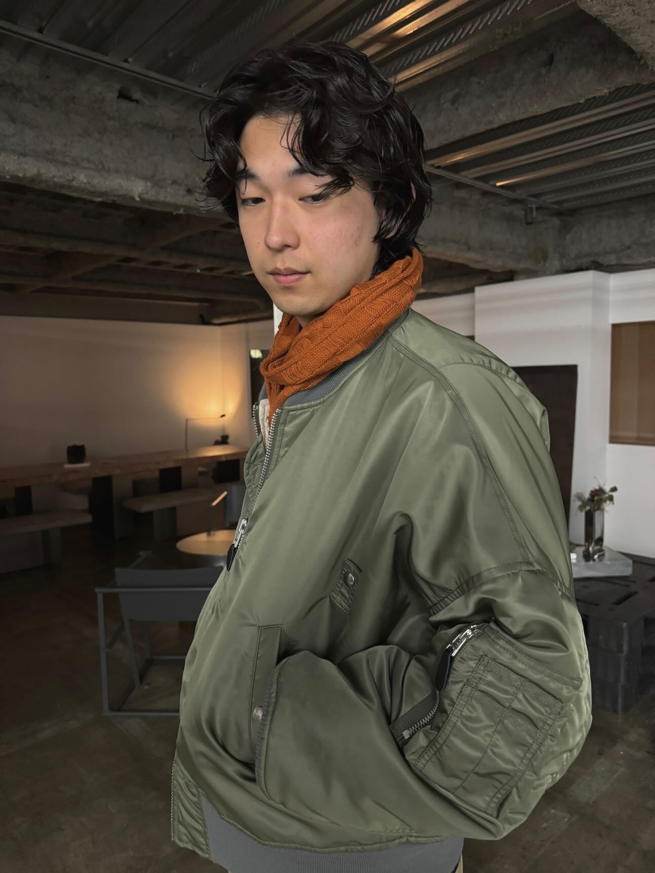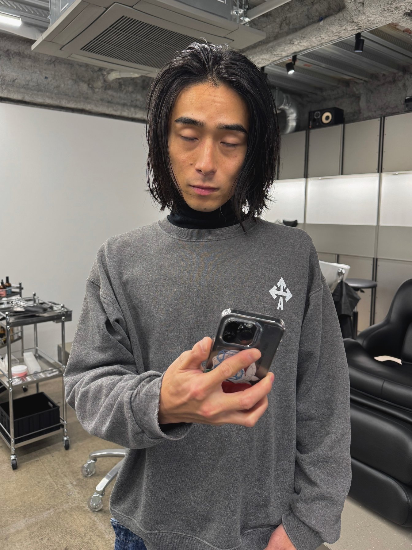 ストリートやモードなファッションにハマると思います。スタイリングは簡単にでき、ポッピンフィグと合わせるだけで、まとまりながらも軽やかで柔らかいスタイルになります。オーダーは「前下がりのセンターパート」で。毛先に遊びを持たせるチョップカットが多く入ってます。(@rin_jiasheng)