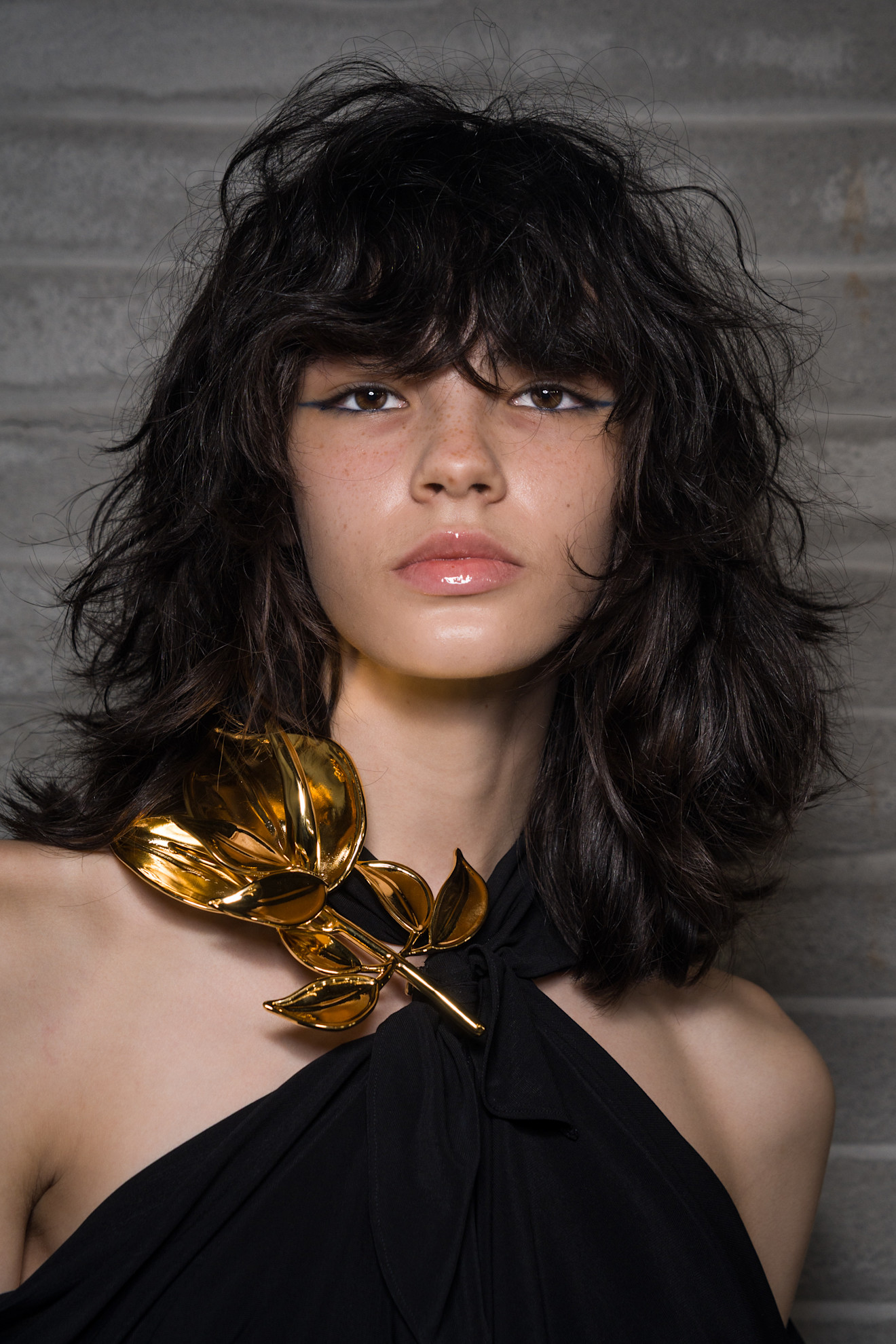 光を反射する重厚なツヤは、ミニマルなメイクアップとも呼応し、ランウェイにモードな緊張感をもたらした。ナチュラルな仕上がりが広がりつつある一方で、あえて"濡れすぎ"とも言える質感を強調するこのスタイルは、ヘアをひとつの表現として際立たせるコレクションならではのアプローチだ。