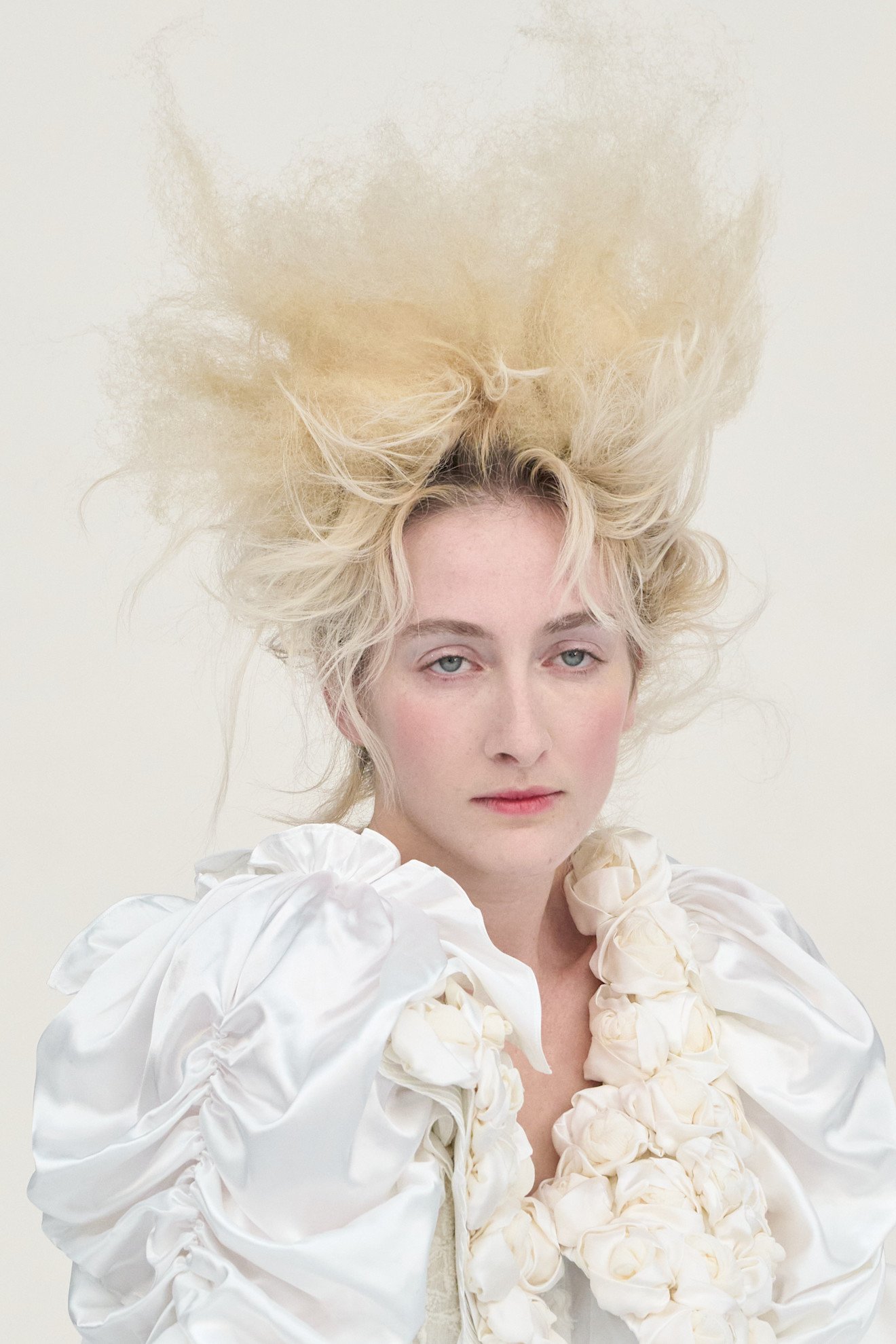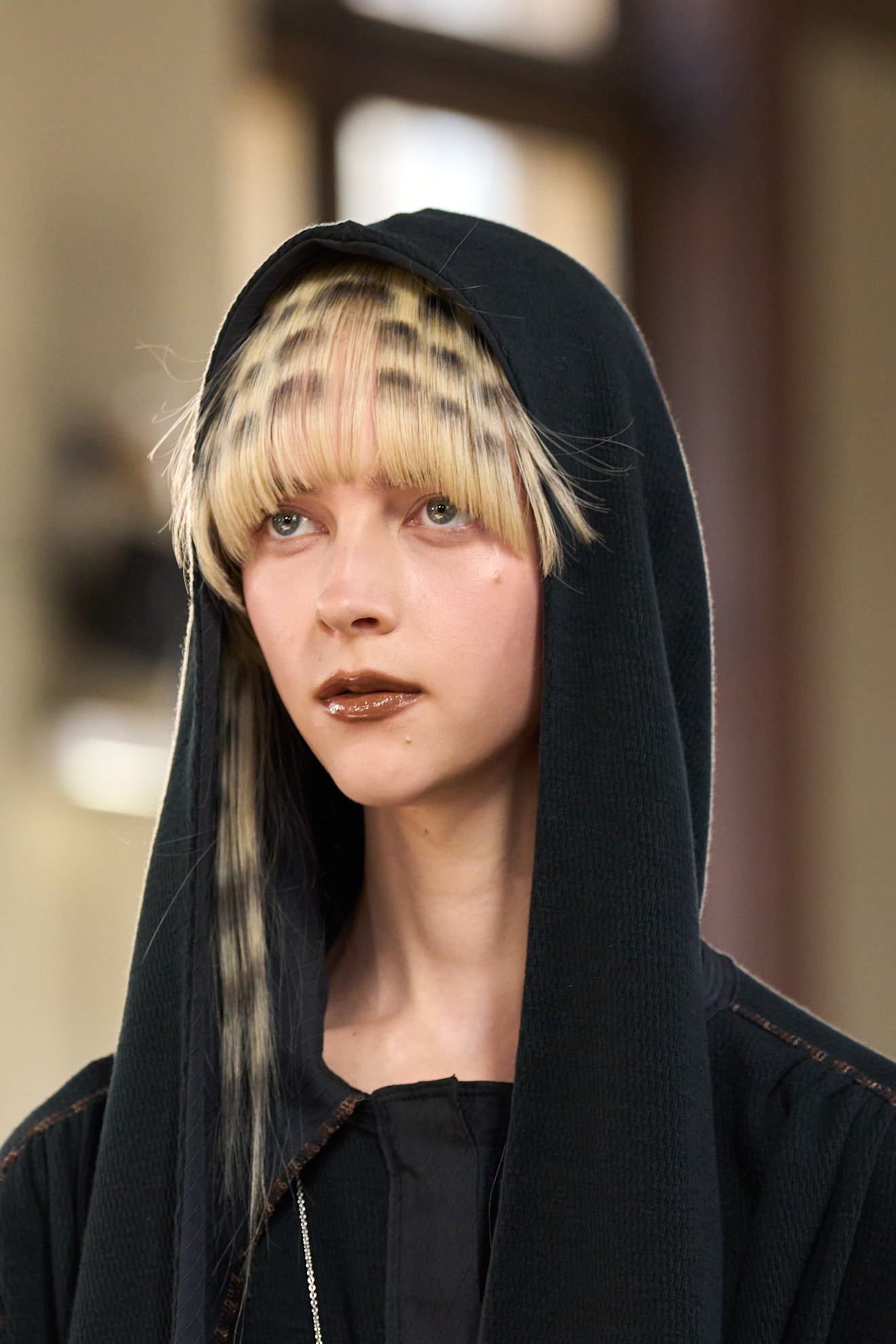 ハイファッションの舞台でありながら、リアルウェイに近い空気を感じさせるのもポイント。日常的なヘアスタイルをあえてランウェイに持ち込むことで、ファッションと現実の距離をゆるやかに縮めるような動きが見てとれる。華やかな造形だけでなく、身近なスタイルの再解釈にも目が向けられていることを示すヘアスタイルだ。