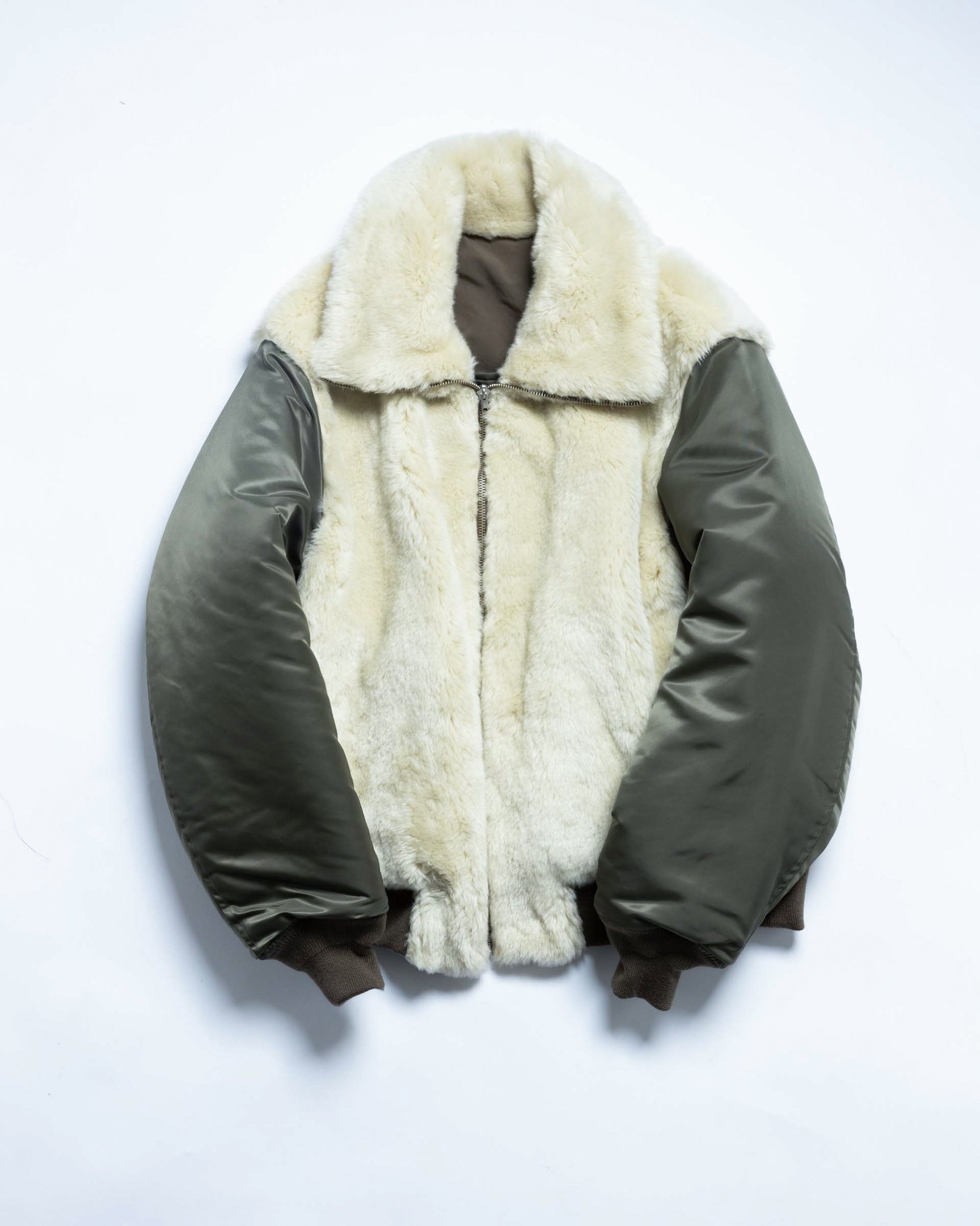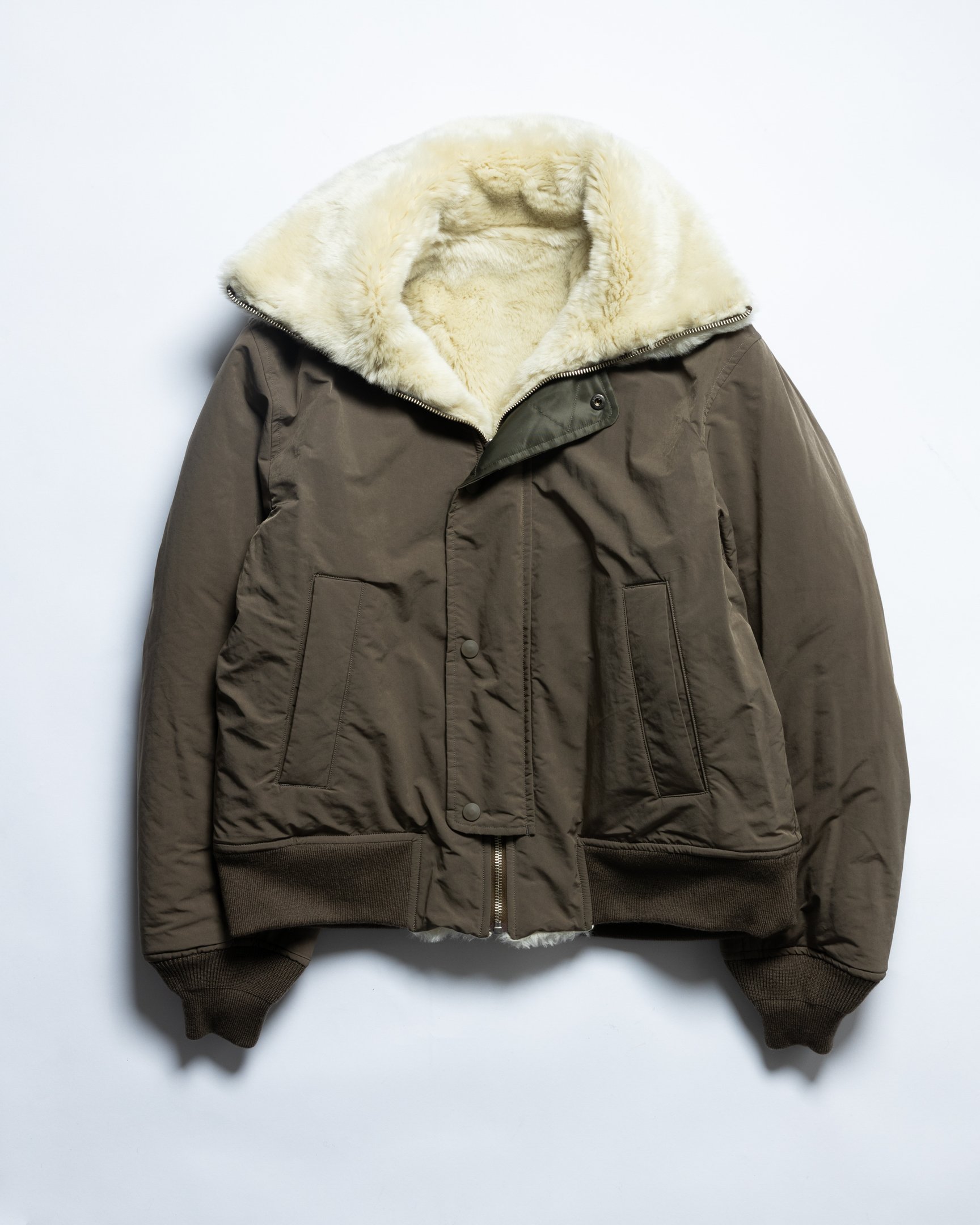 「アトリエ ベトン」のリバーシブル仕立てのブルゾンは、ボアを表にして着ても袖がミリタリーテイストのカーキ色なので、可愛くなりすぎないのがポイント。ボアの手触りは柔らかく、防寒性もバッチリです。ボアを裏にするとジャケットの表情はしっとりとした質感に変わり、首元のボアがアクセントに。スタイリングの幅がさらに広がります。ボトムスの色味を選ばずに着用できるので、毎日愛用できそう。