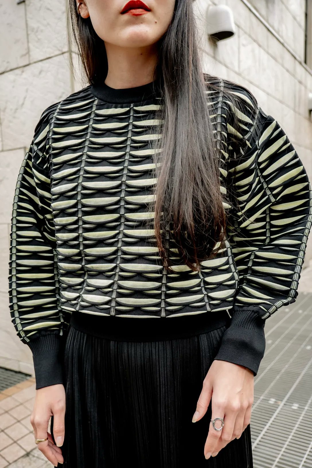 小窓のような隙間からイエロー、ライトブルー、グレーの3色の残糸をミックスしたカラーが覗いているデザイン。一見着こなしにくい印象を受けますが、ベースカラーがブラックなので手持ちのワードローブにも馴染みやすいです。お洒落着なのに自宅で洗濯できるのも嬉しい!シャープかつモダンなデザインなので、ニット特有の"ほっこり感"が苦手な方にもおすすめしたい1着です。