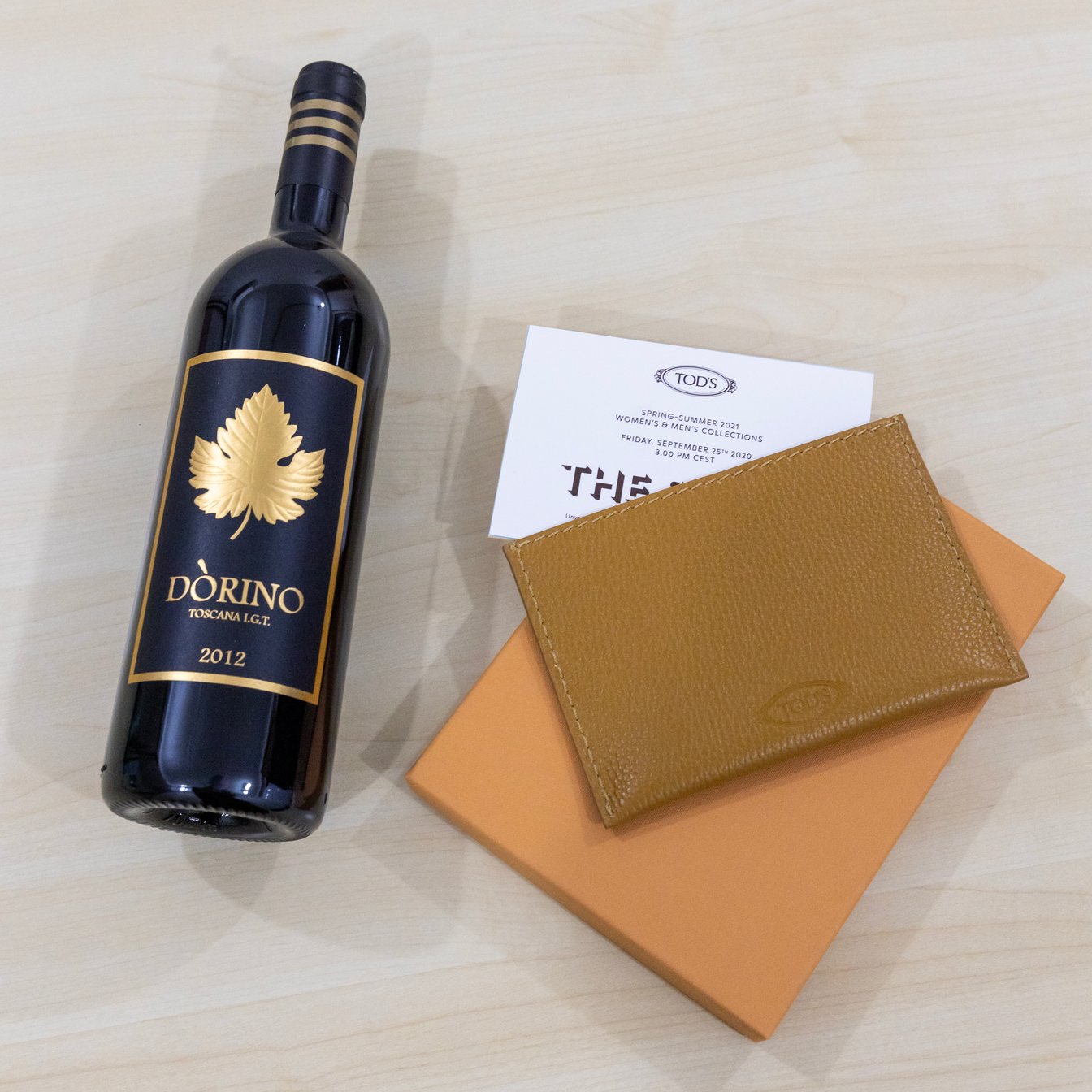 トッズから届いたのは、イニシャル入りのレザーケースと案内状、そしてワイン。今シーズンは映像でのコレクション発表のため、「ワインと共にお楽しみください」という嬉しいギフトでした。しかも、トッズ・グループを率いるデッラ・ヴァッレ家の特別なワインだそうです。デジタルの醍醐味は、屋外でもベッドルームでも回線さえあれば視聴できること。ミラノの由緒ある邸宅で撮影されたというコレクション映像を、くつろぎながら堪能することができました。