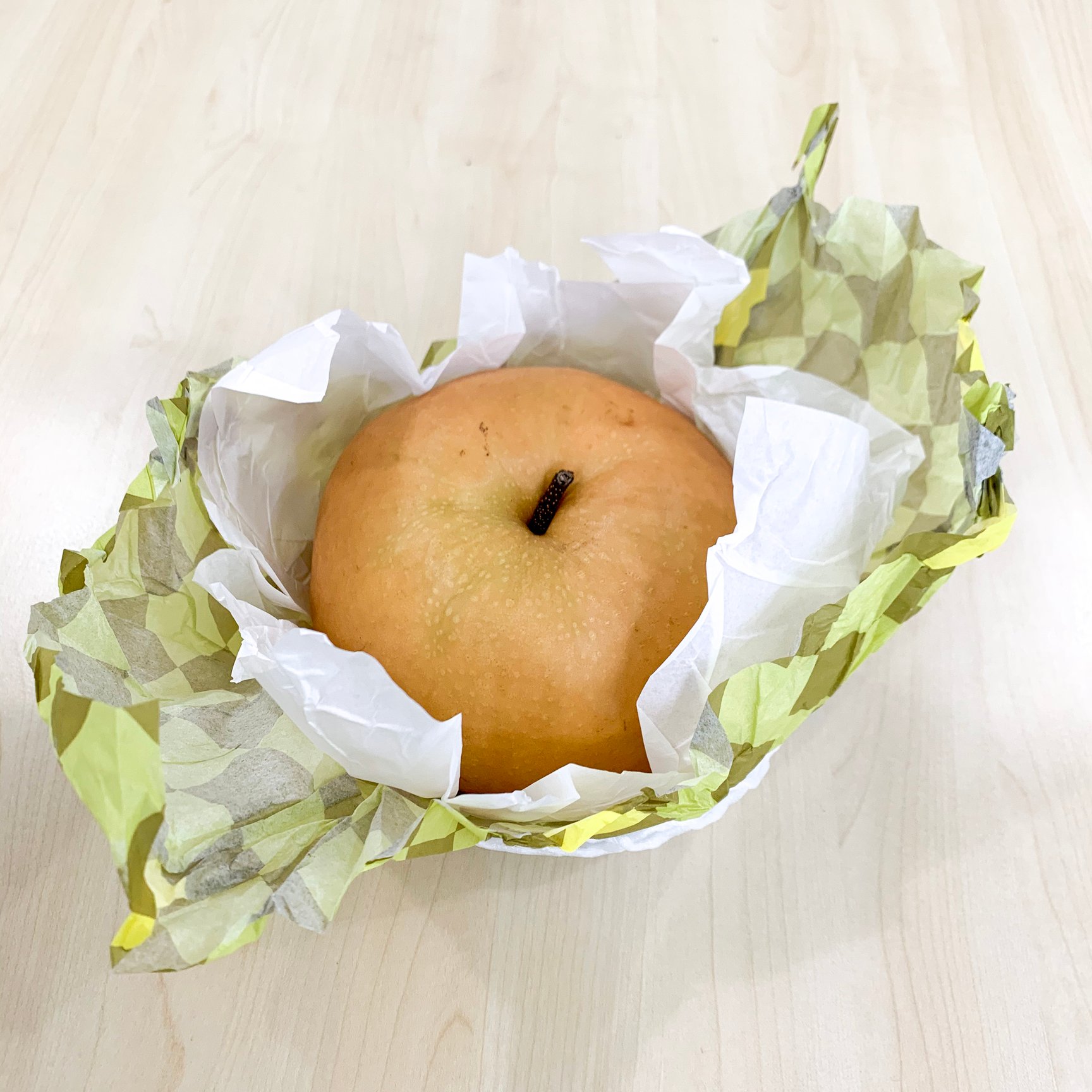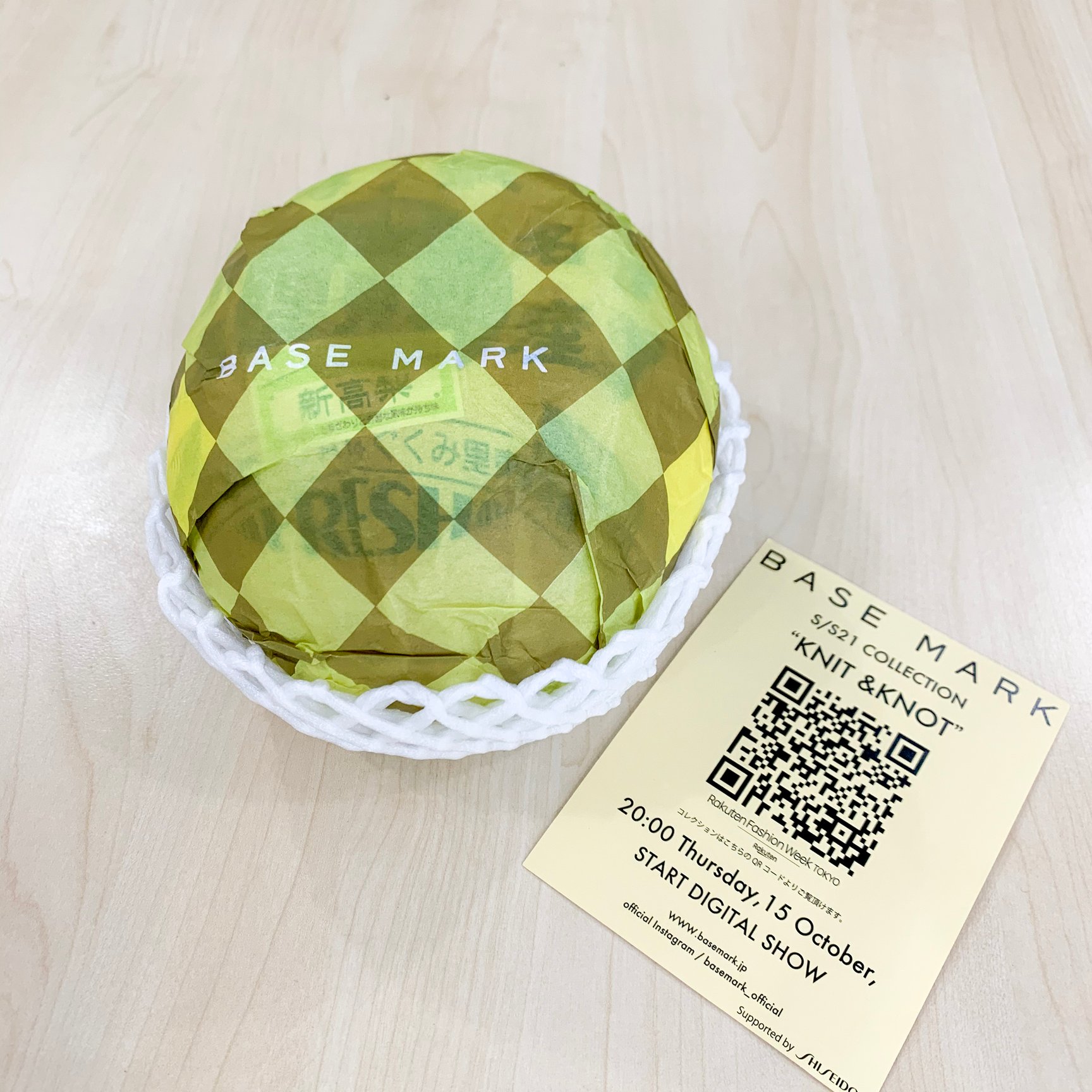 品種は「新高(にいたか)」。ベースマークのロゴ入りの薄紙に包まれて、悴田梨園の大きな梨が届きました。なぜ梨なのかというと、今シーズンのテーマカラーがシトラス(梨)ということで、コレクション映像を梨園で撮影したのだそう。梨の木の間をランウェイにモデルが歩くという、デジタルショーならではのロケーションでした。