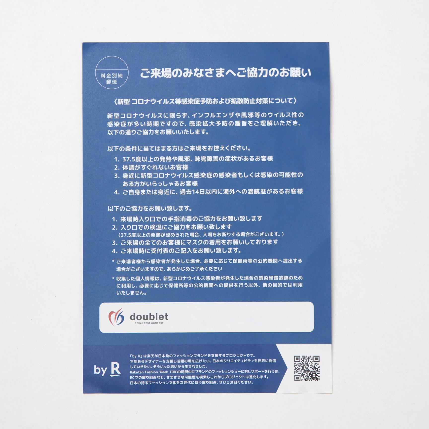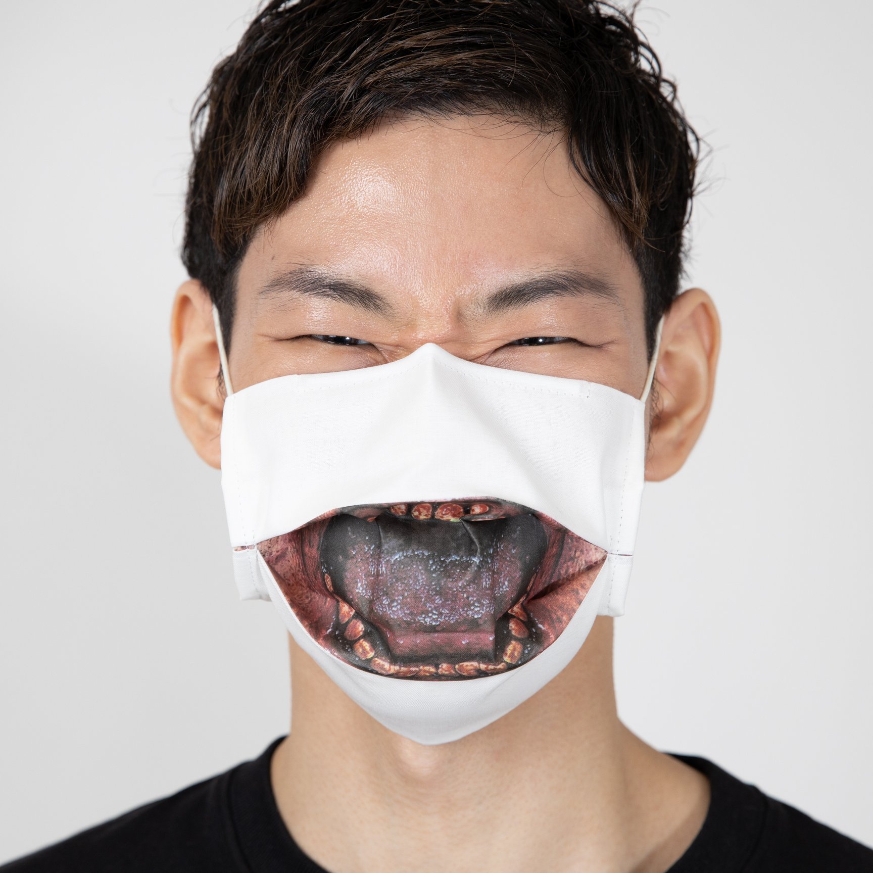 思わず二度見したのが、ダブレットから届いた招待状。おそらく日本国民なら誰でも見覚えがある、あのマスク......に、似たマスクでした!パロディが大得意のダブレットならでは。着用するとちょっと恐怖なマスクは、ハロウィンにちなんだものだそう。個性満点のゾンビ(モデル)に追いかけられるコレクションムービーも必見です。