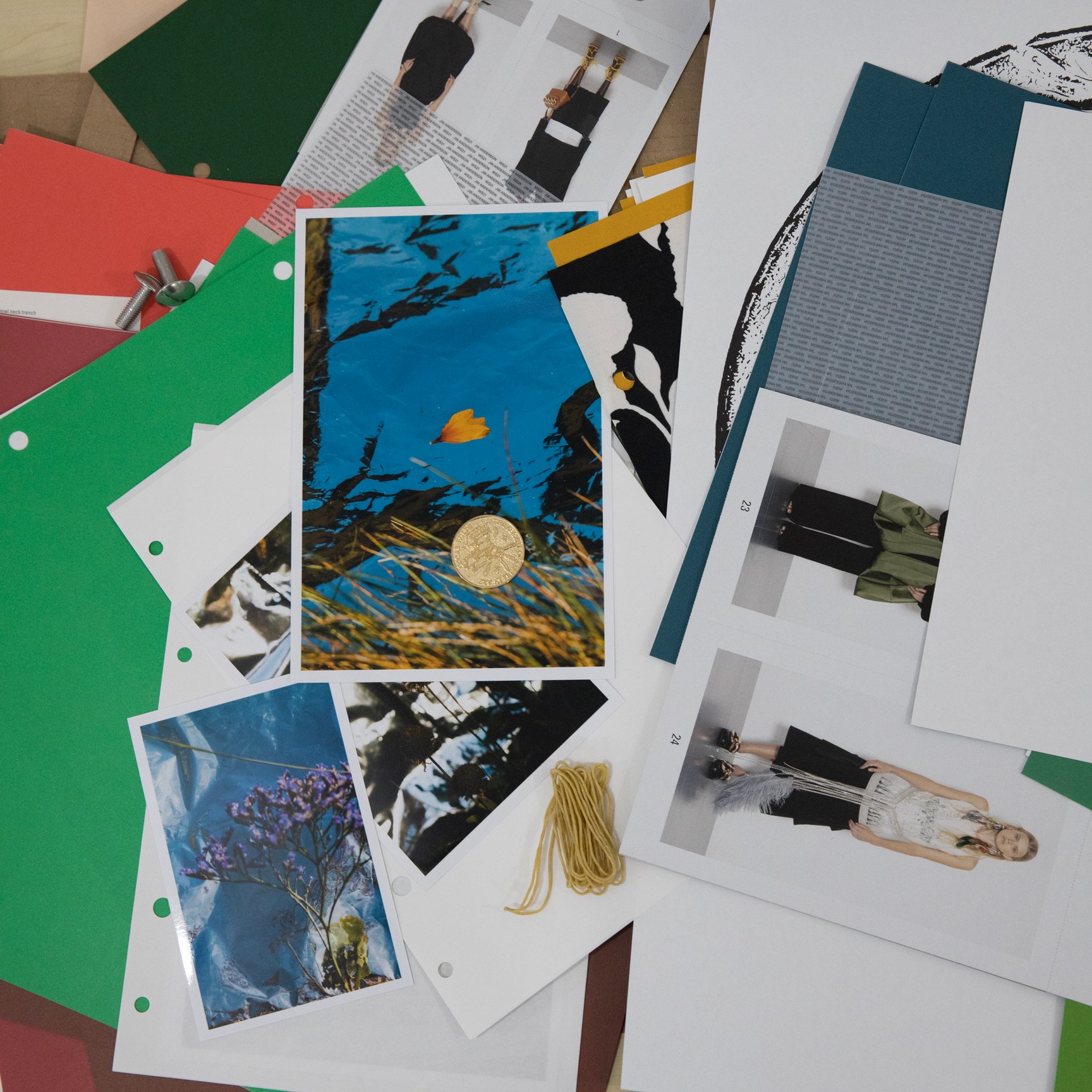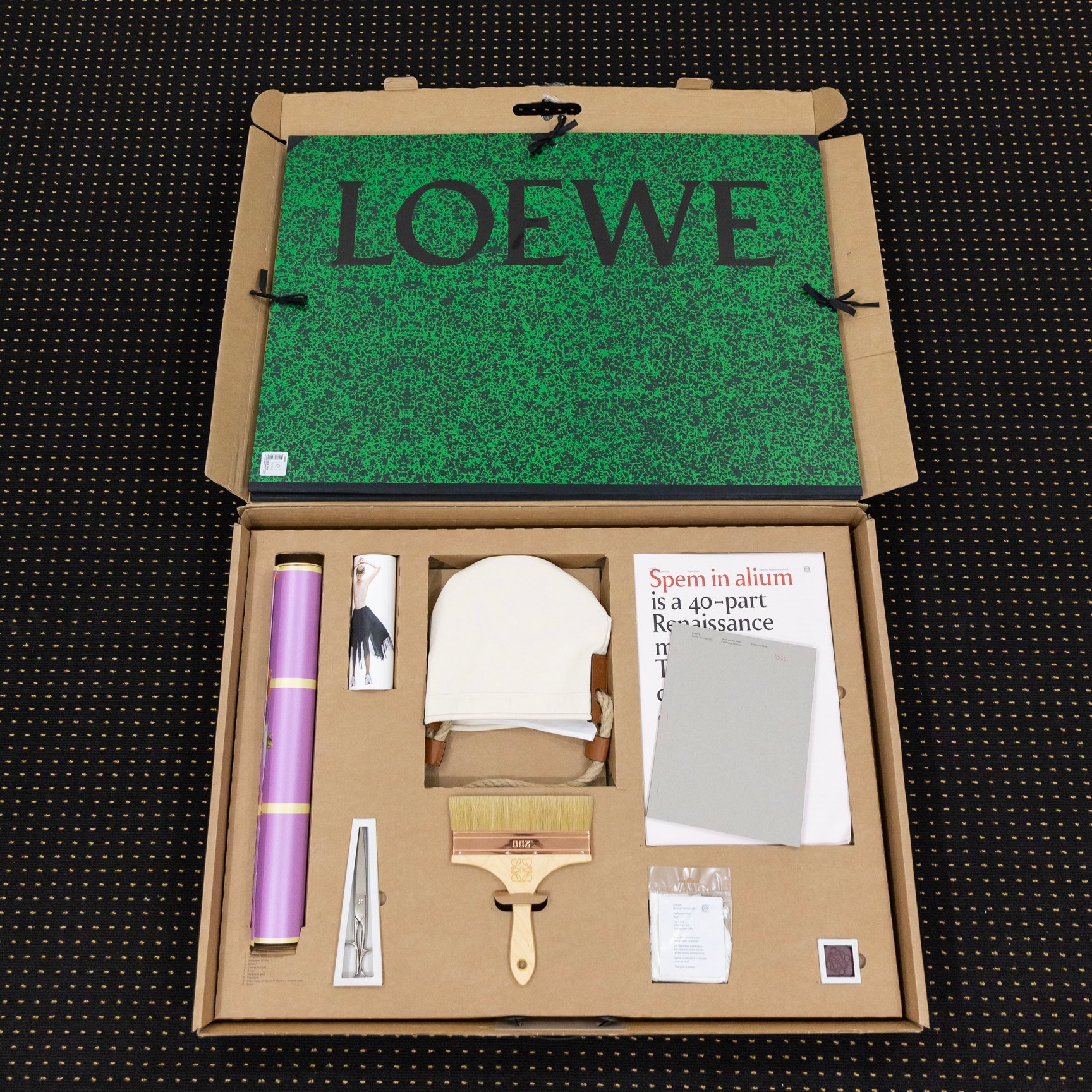 ジョナサン・アンダーソンが提案する新しいショーの形「show in a box」。文庫本のような包装紙に包まれていたのは、ボタニカル柄の表紙に真鍮のコインがはめ込まれた分厚いバインダーです。表紙裏に書かれた指示通りにコインを取り外し、コインの側面を使ってネジを外すと、ページがバラバラに分解されて中身を確認することができます。様々な色紙の間に、コレクションにまつわる資料の数々。ルック画像のカード、生地スワッチ、そして美しい自然を写した写真など。実際に触れたり飾ったり、"箱入りショー"を自由に楽しむことができます。