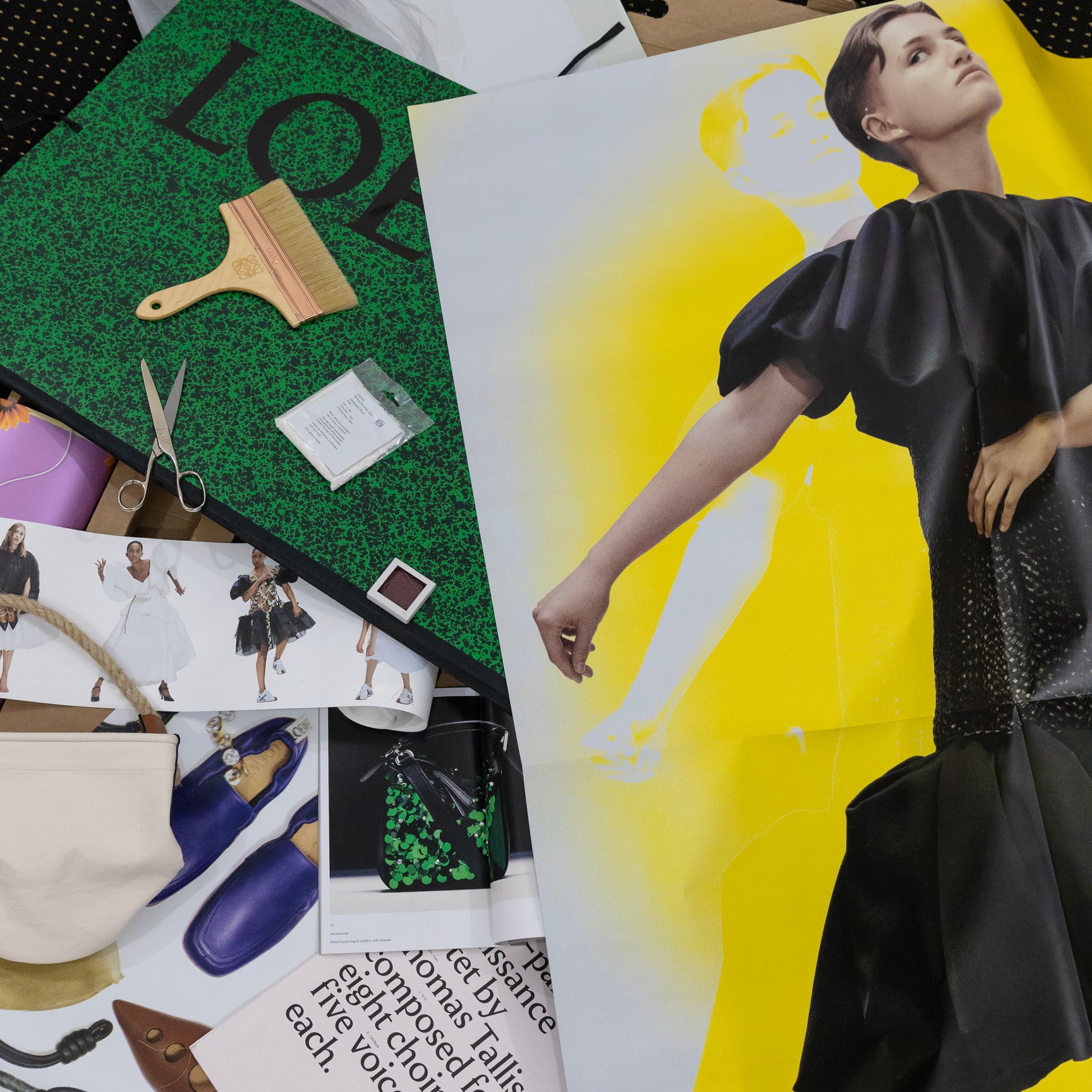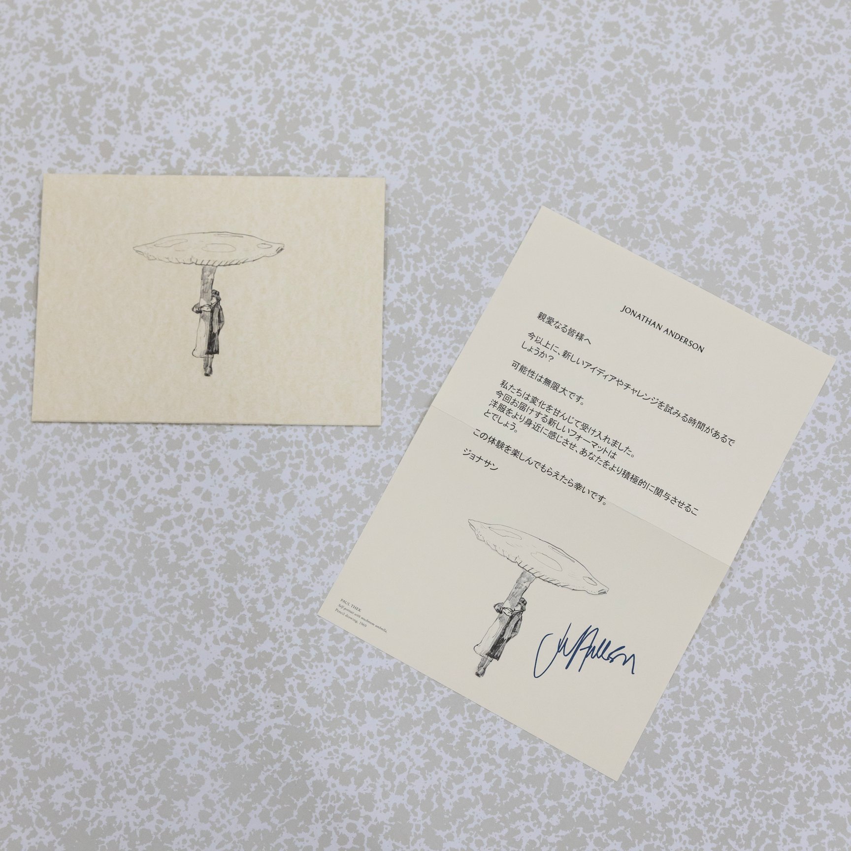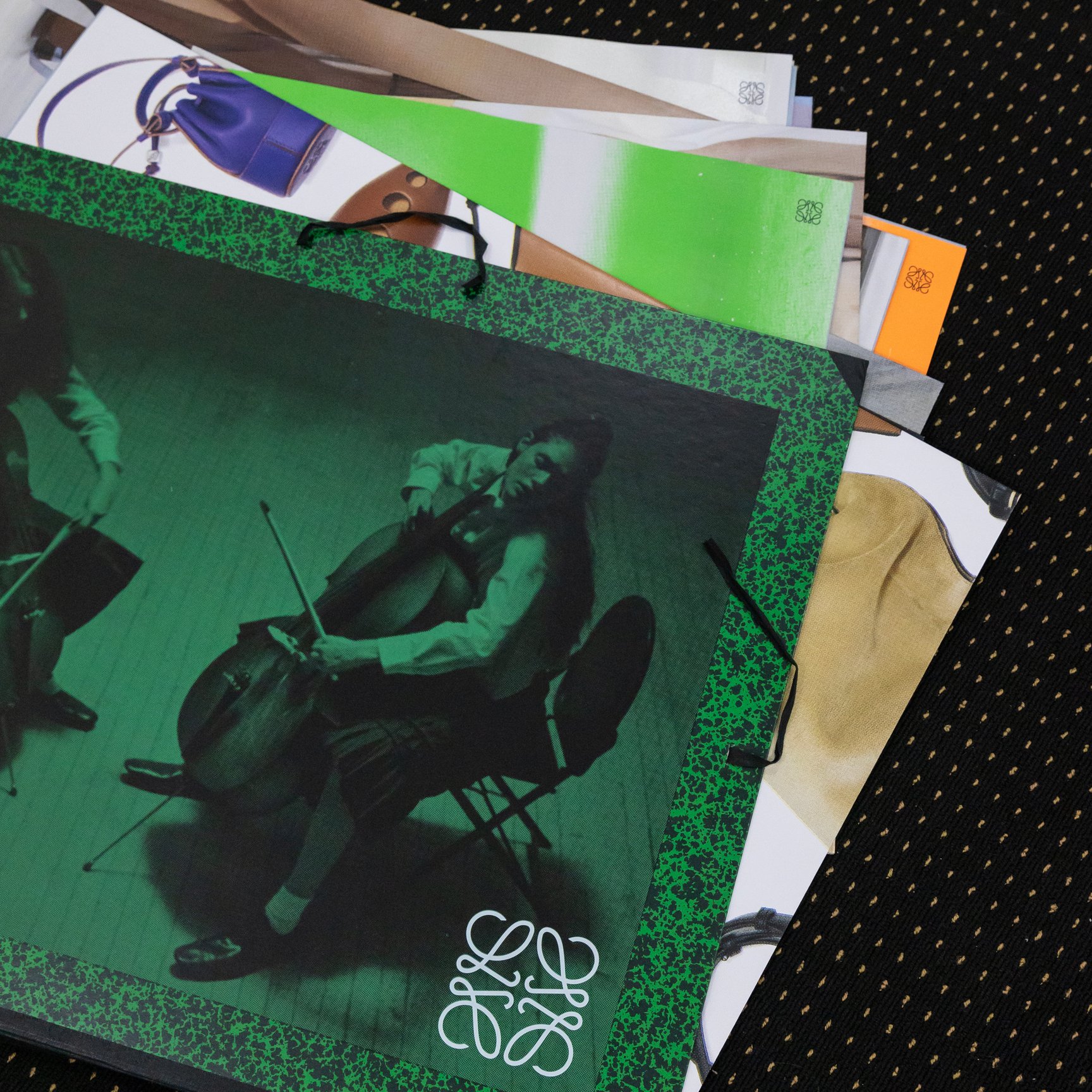 同じくジョナサン・アンダーソンが手掛ける「ロエベ」から届いたのは、持ち運ぶのに一苦労するほど大きな箱。前回7月のメンズコレクションで送られてきたキット「Show in the Box」に続き、今回は「Show on the wall」と名付けられています。箱を開くと、思わず「おお〜」と声が漏れました。収められていたのは、壁紙、ハサミ、刷毛、のり、キャンバスバッグ、それから楽譜など。16枚の巨大ポスターに写るモデルは等身大です。つまり、自由に切ったり貼ったり、壁でコレクションを楽しみましょう!という提案でした。封筒に入っていたジョナサンからのメッセージもグッときます。
