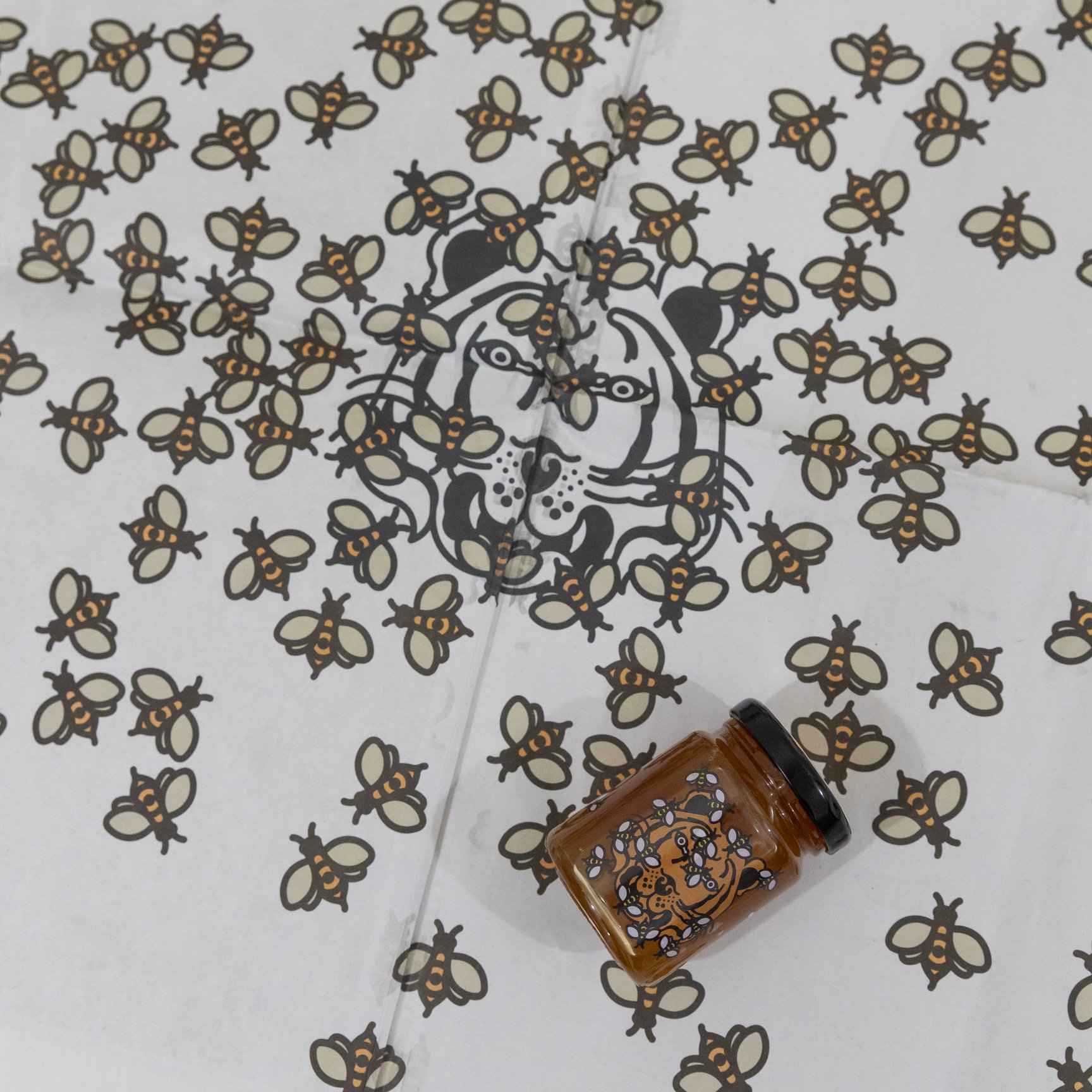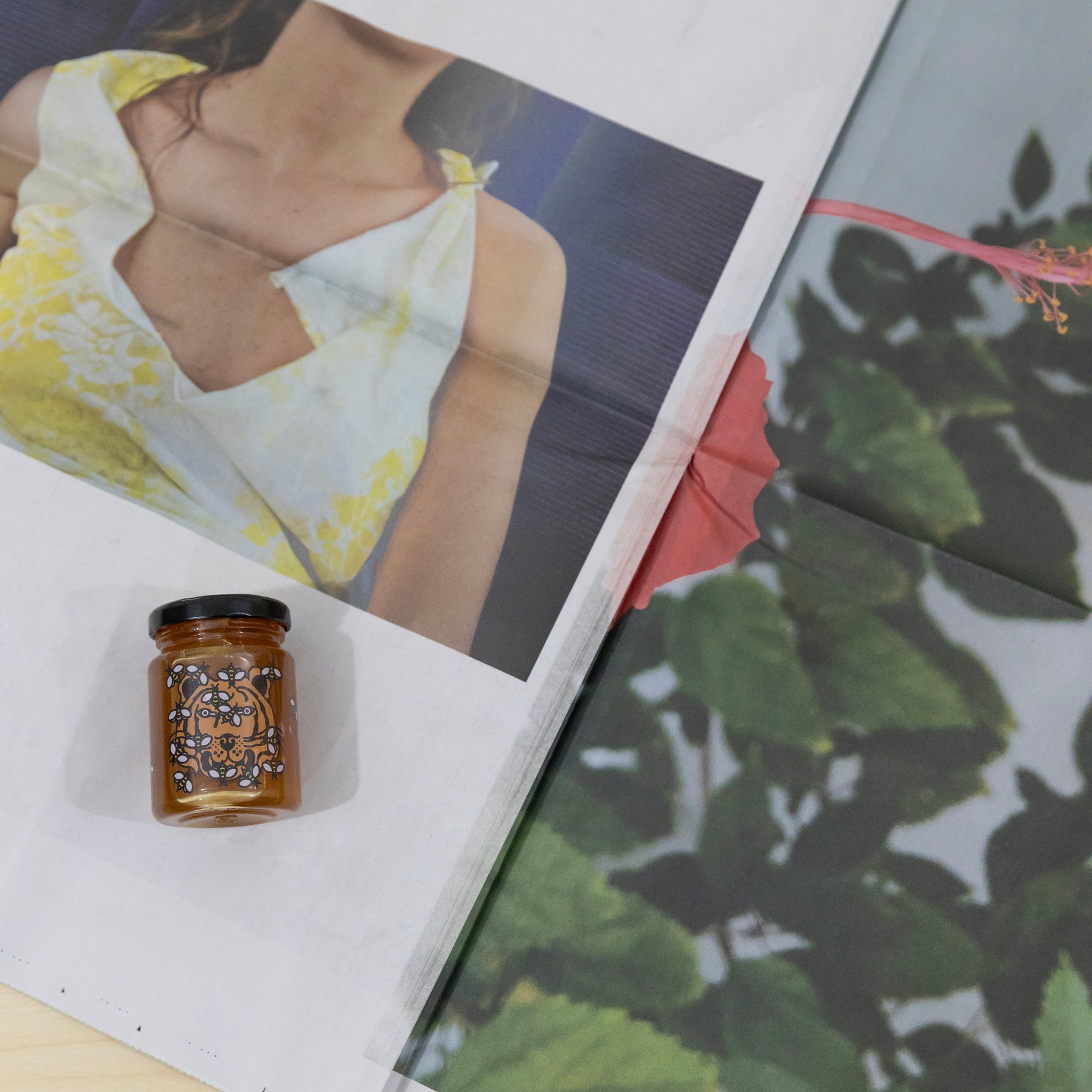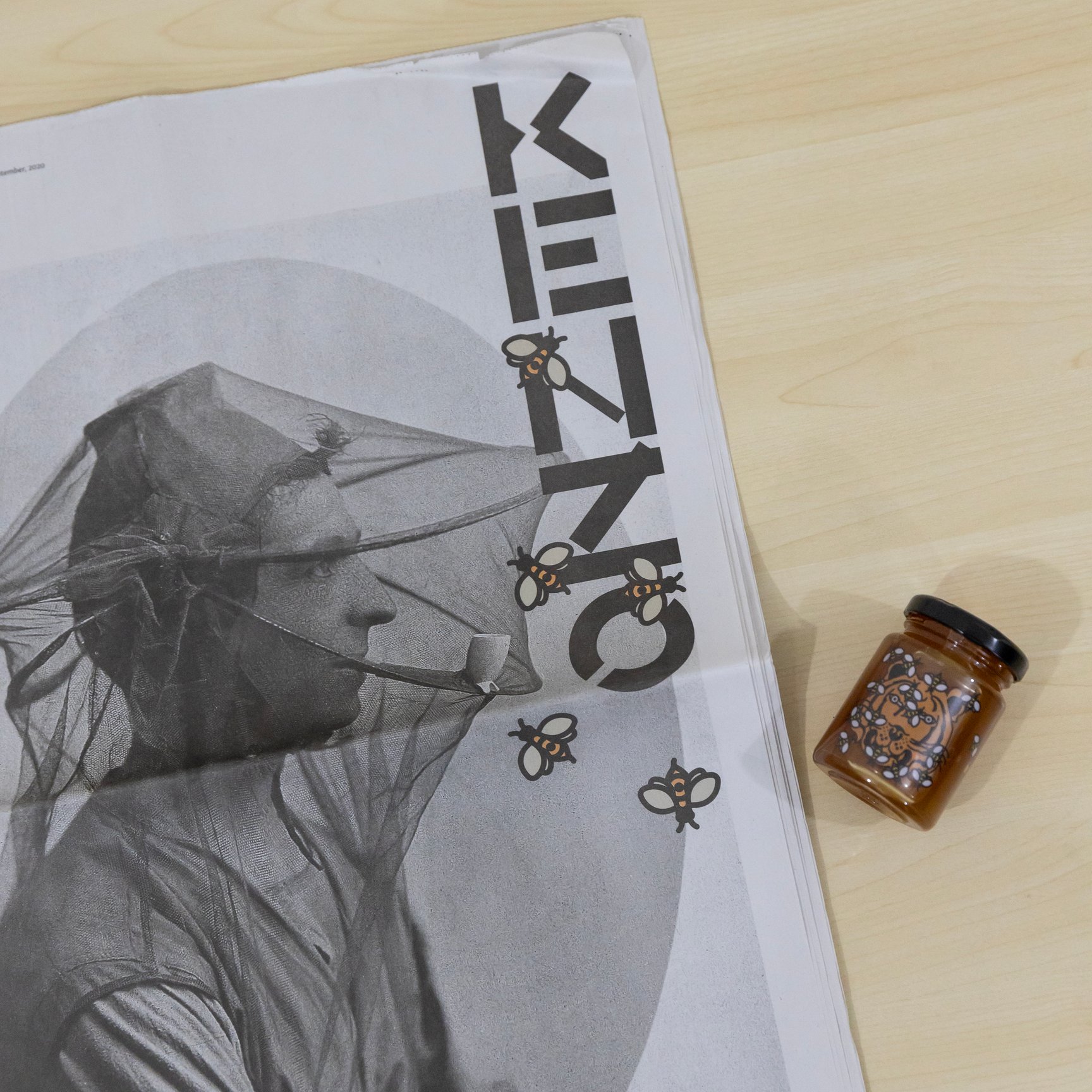 届いたタブロイドの表紙には、モスキートヘッドネットを被った男性と、蜂のイラストが重なったKENZOロゴ。中を開くと様々なアーカイブ写真が掲載されていて、創始者の高田賢三氏が手掛けていた1984年春夏のヴィジュアルも見つけました。発表された新作を見ると、これらがインスピレーションになっていたのがわかります。添えられていたハチミツは、パリのモンマルトルにあるサクレ・クール寺院の周辺に咲くライムの花の蜜とのこと。タイトルは「Bee a Tiger」。