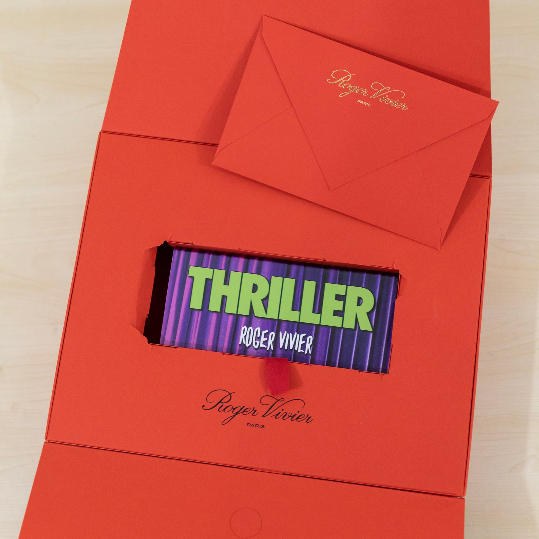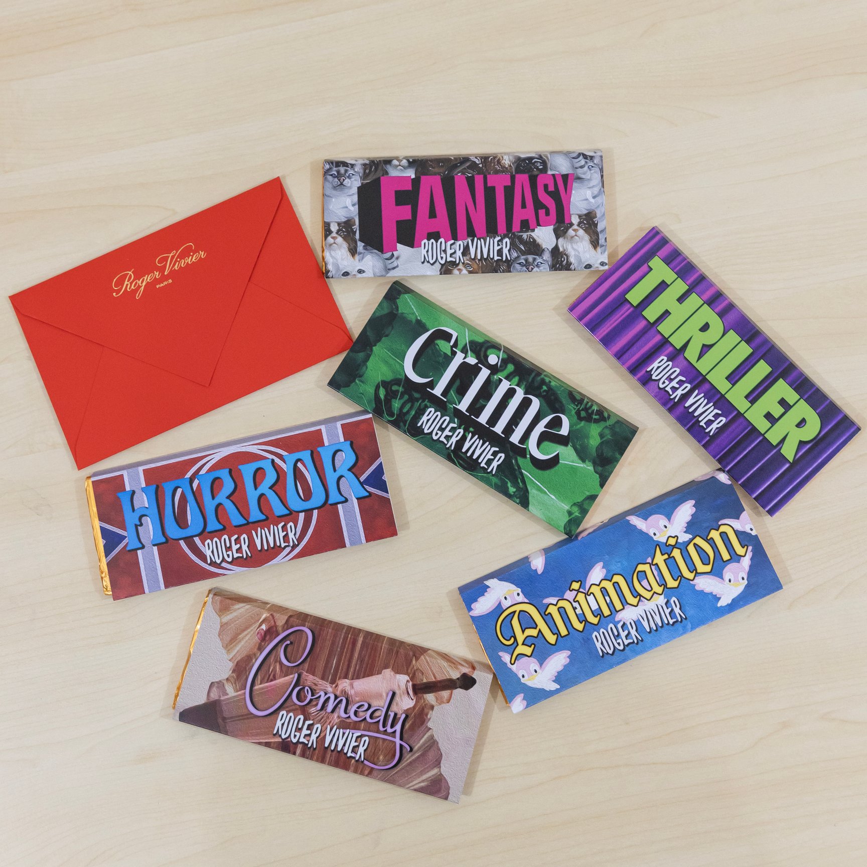 パリで体験する「ロジェ・ヴィヴィエ」のプレゼンテーションはいつも凝っていてユニークなのですが、今シーズンはヴァーチャルに発表の場を移すとのこと。届いた真紅の箱には「HOTEL VIVIER CINEMATHEQUE」の文字。コンセプトは映画です。箱の中に入っていたのは、映画ジャンルをイメージさせるパッケージのチョコレート。封筒の中には映画のチケットが入っていました。いざ、ヴィヴィエのシネマテークへ。