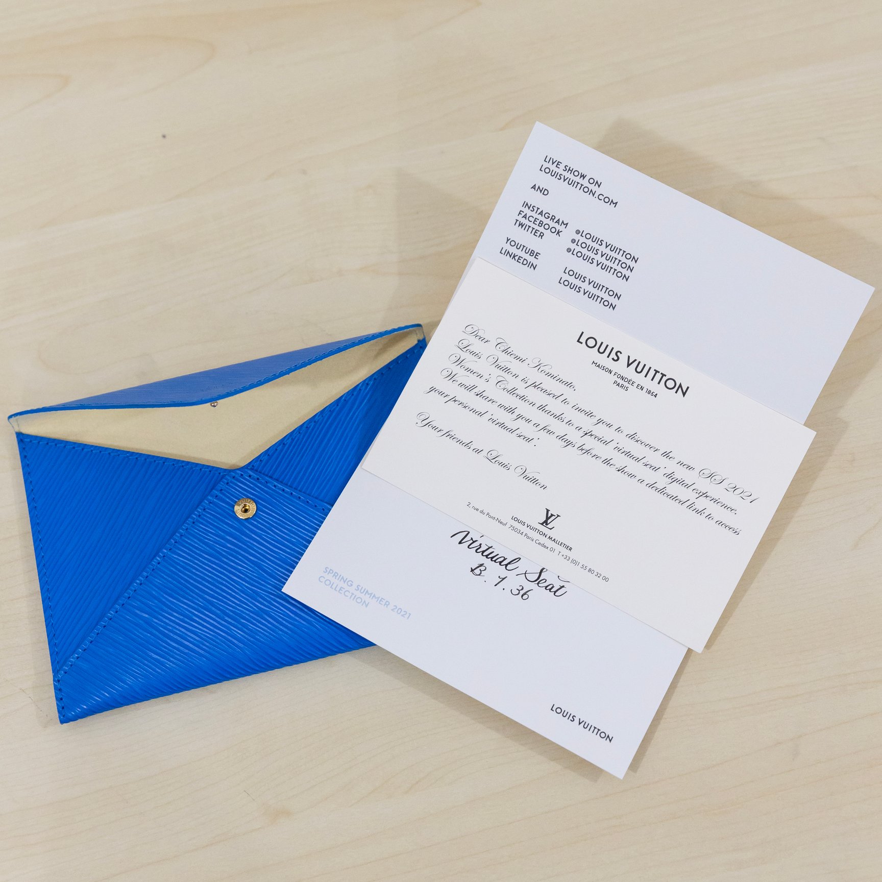 ルイ・ヴィトンのウィメンズコレクションの招待状は毎回同じデザインで、エピのレターケースに入って届けられます。シーズンによって異なるカラーは今回、鮮やかなブルー。いつもと違うのは、中のカードに記されたシート番号の部分で、「Virtual Seat」と書かれています。今回パリのショー会場に行けない招待客のために、公式の配信とは異なる特別な配信を用意したそう。フロントロウに座っている感覚で、360度カメラの映像を自由に動かしながらショーを見ることができました。