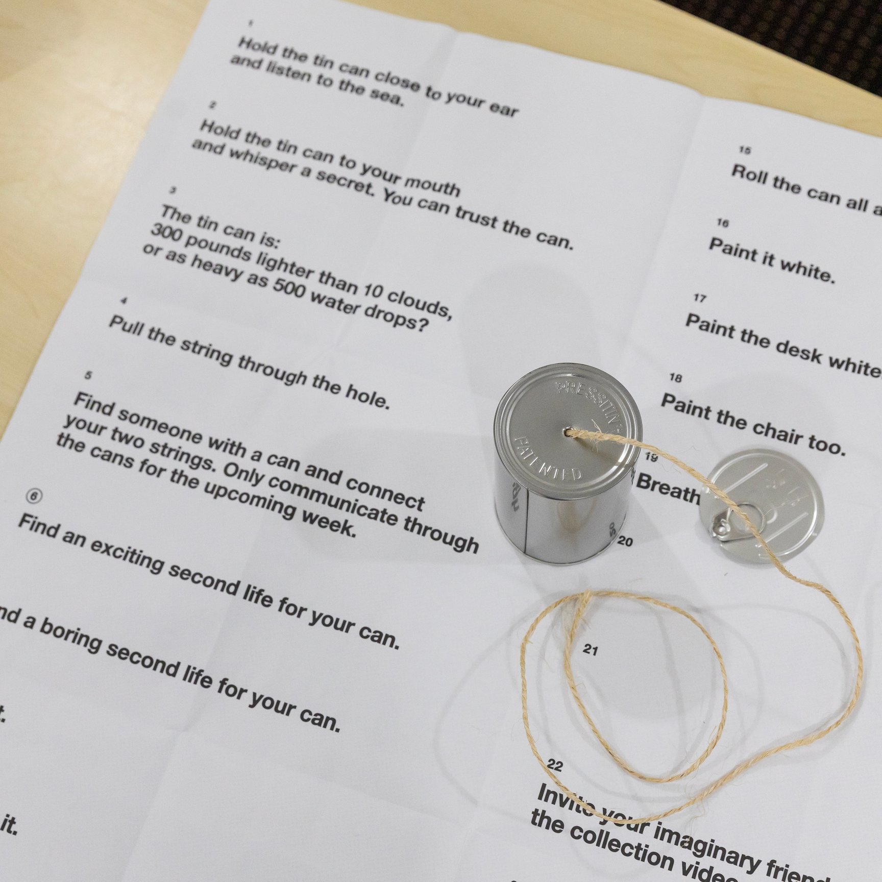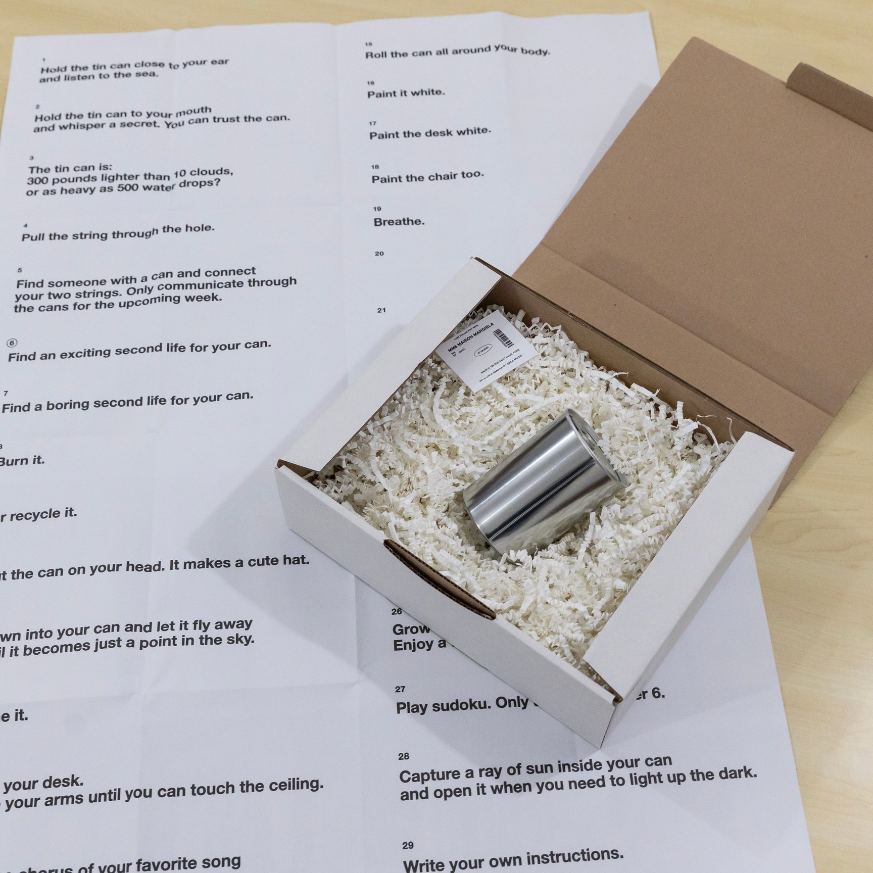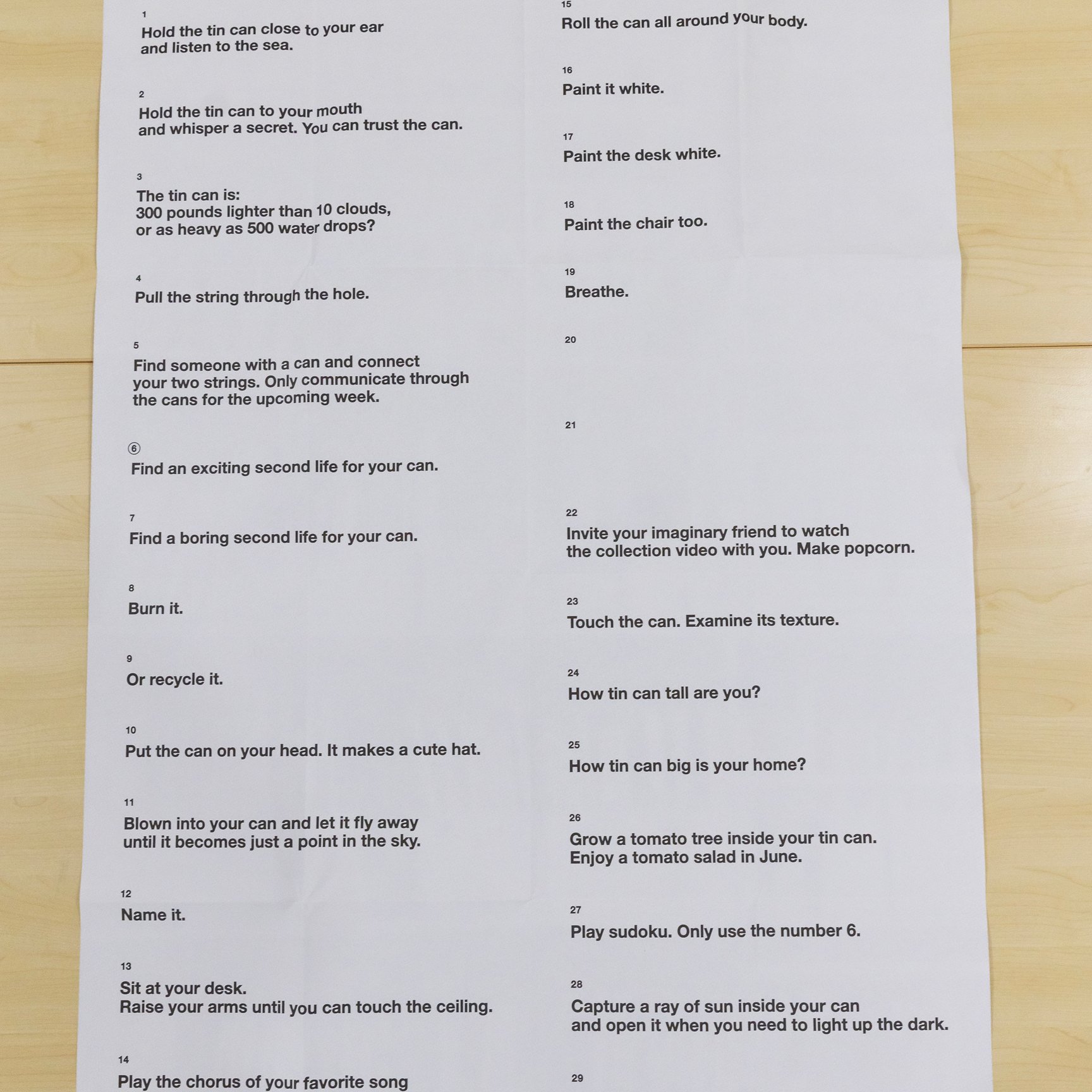 白い箱の中にはアルミ缶が1つ。振ってみるとカラカラ...と乾いた音がします。いざ開けてみると、中身は紐...?添えられていたポスターにヒントがありました。1から29まで記されているティップスの5番目を見ると「缶を持っている人をもう一人見つけて、紐をつないで会話してみましょう」とのこと。ナルホド、糸電話!ソーシャルディスタンスを保ちながらコミュニケーションできそうです。その他にも缶のユニークな使い方が書かれていたり、身近なもので楽しむヒントが詰まっていました。