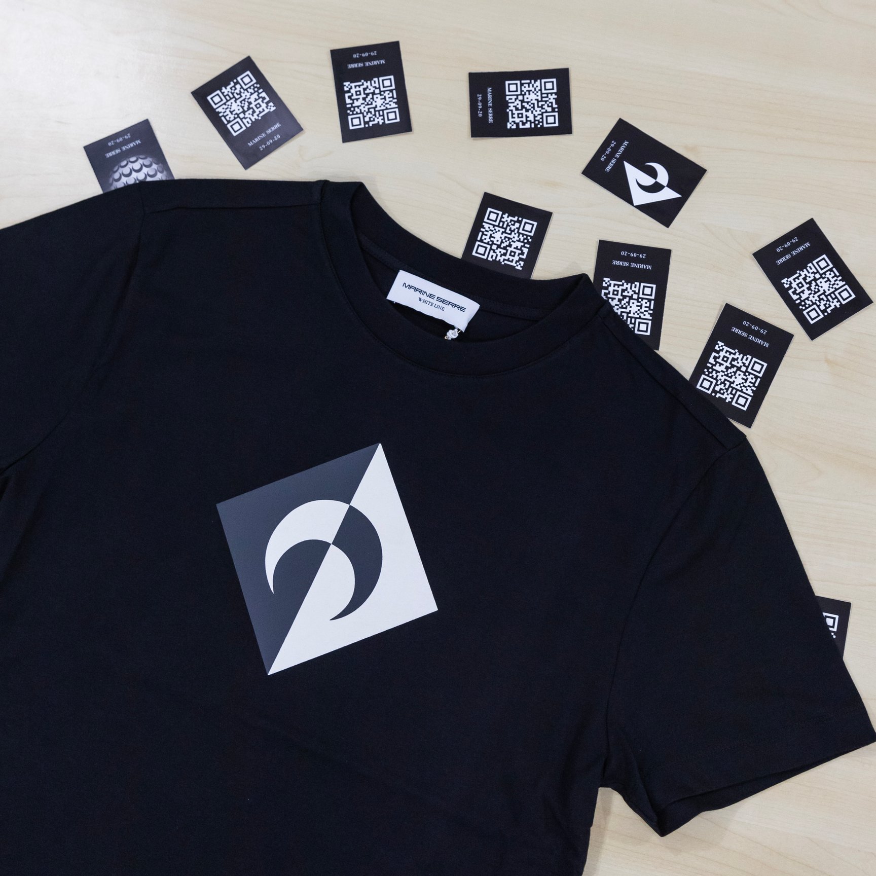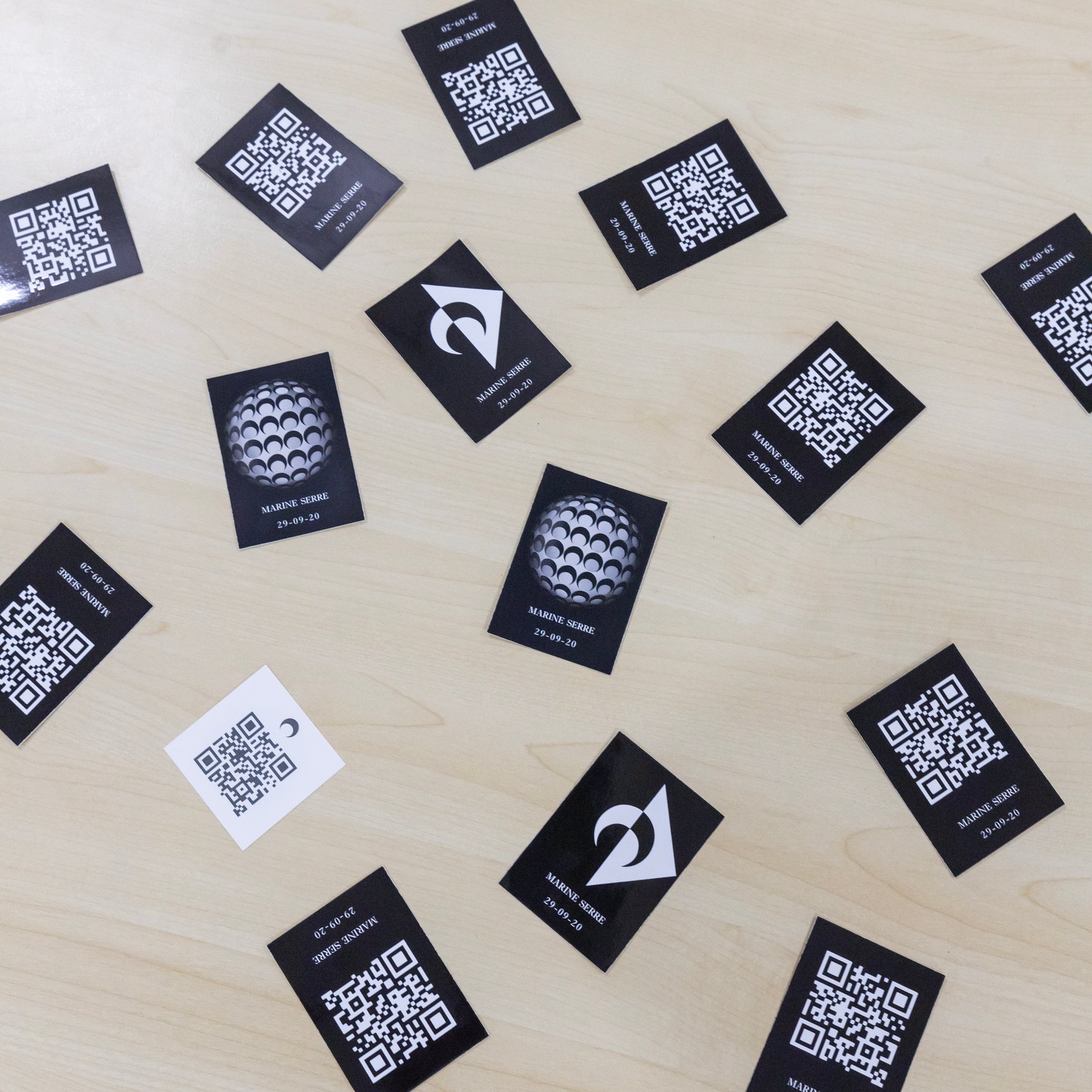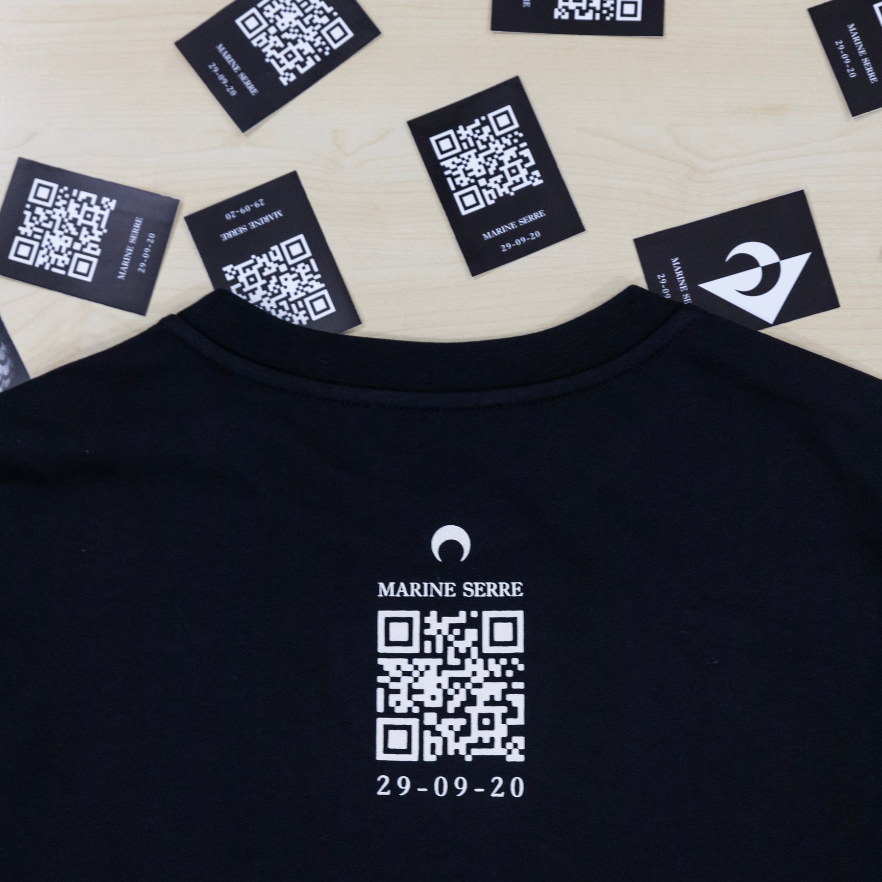 ショー会場に集結する三日月族がパリコレの風物詩のひとつだったマリーン・セルですが、今回は映像での発表です。招待状の代わりに届いたのはTシャツ。フロントにはおなじみの三日月をアレンジしたアートワーク、そしてバックにはコレクション映像を見ることができるQRコードがプリントされています。それからシールと、タトゥシールも入っていました。マリーン・セルの手にかかれば、QRコードもどこか異世界へと通じる暗号のようです。