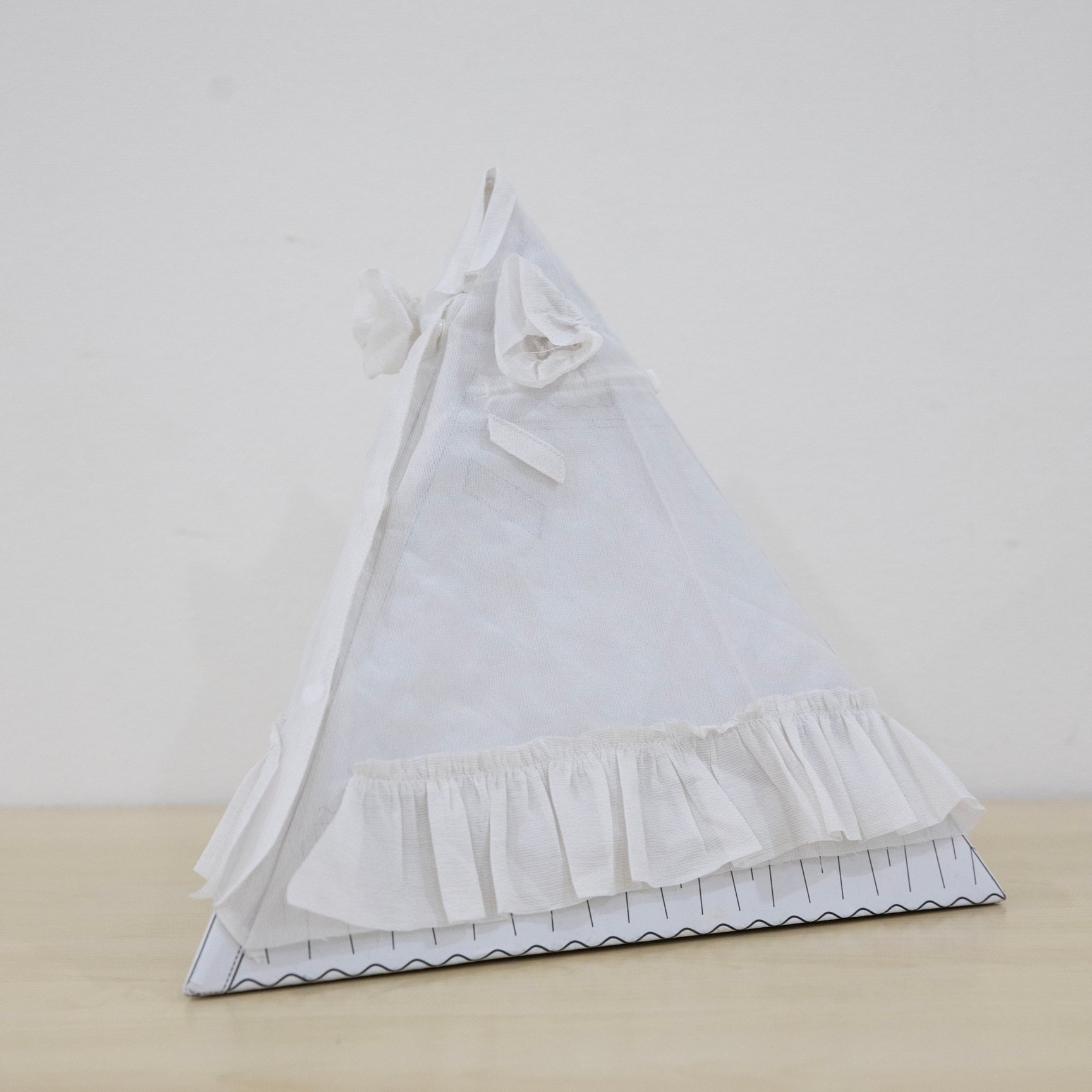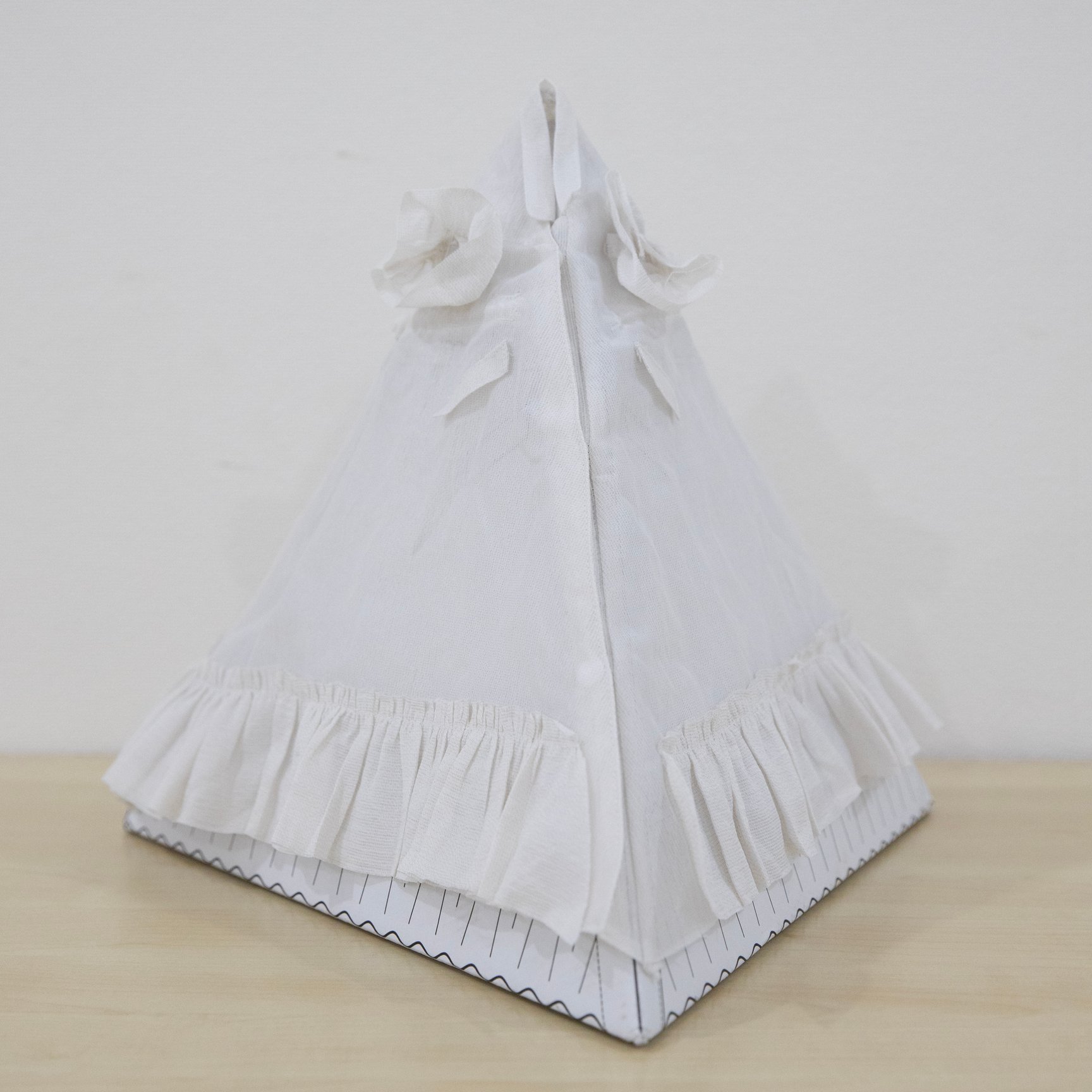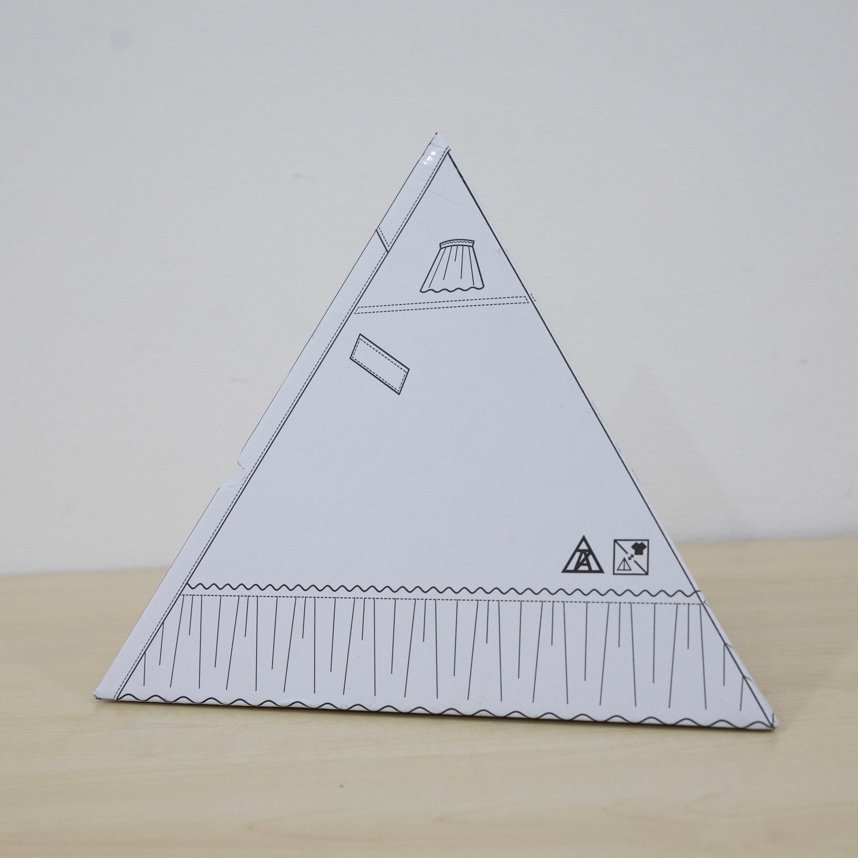 正四面体という珍しい形の白い段ボール箱が届きました。中に入っていたのは、小さな白い三角形の服。箱にすっぽりと着せればテントのようです。これはコレクションのティザー映像で話題になった平手友梨奈さんのドレスと同じデザイン。ディテールや素材まで再現されたミニチュア版です。"家のような服。服のような家。"というコンセプト「HOME」を一足先に体験することができる招待状でした。