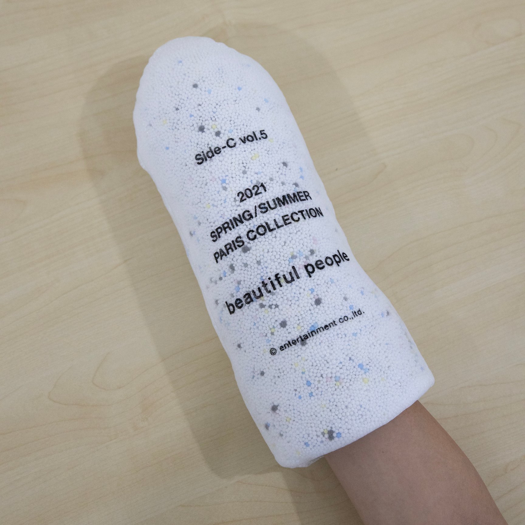 メッシュ素材の中にカラフルな発泡ビーズが詰められた、細長い物体が到着。おもむろに手を入れてみると、気持ちいい...。これはまさに、あの"人をダメにするソファ"のリラックス感!アームクッションとしてデスクでのお昼寝にちょうど良さそうです。ちなみにこのビーズは、今シーズンの鍵となる重要な存在。今回はデジタルの発表だったので、実際に手で触って質感を体験できるように、というユニークな試みです。ビーズがどのような役割を果たしているかは、映像でチェック。