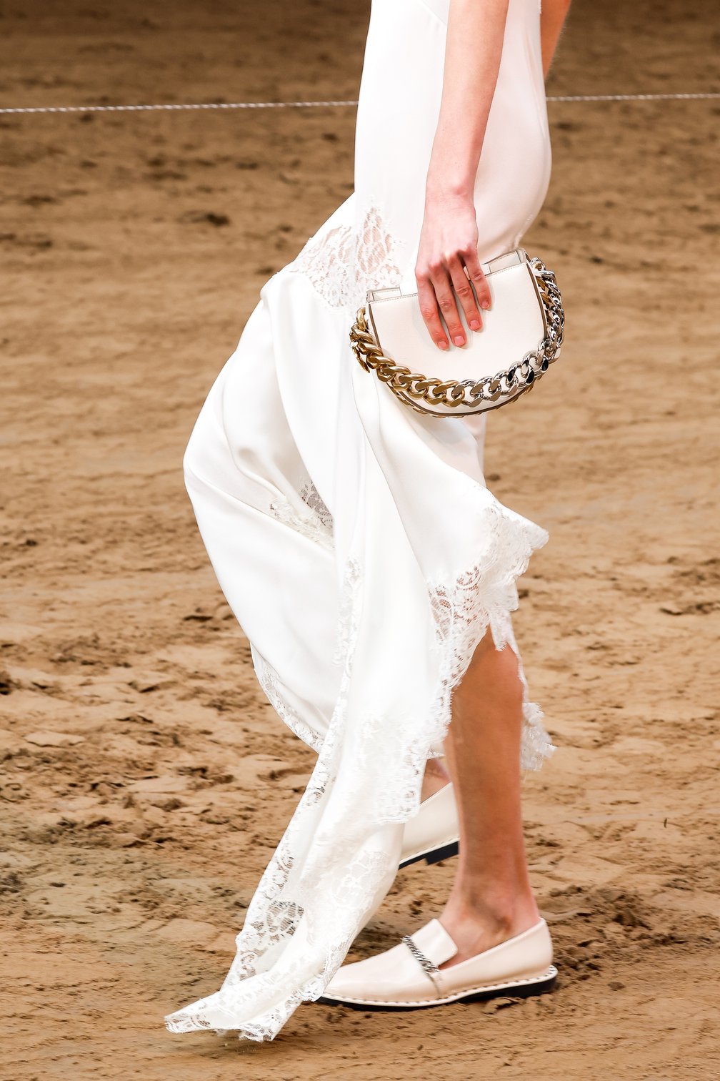 今シーズンは全体の92%を責任ある素材で構成し、ブランド史上もっともサステイナブルなコレクションに。新素材も多く取り入れられ、レザーの循環型の代替素材「ミラム(MIRUM®)」から作られたラグジュアリーブランド初のハンドバッグが誕生。また、定番である「Sウェーブ」や「フレイム」バッグには、廃棄リンゴ由来の新素材「アップルスキン(AppleSkin™)」にクロコダイルの型押し風の加工を施したバージョンがラインナップに加わった。キノコの地下根系である菌糸体由来の「フレイム マイロ(Frayme Mylo™)」にも新色のホワイトが登場し、あらためて動物製品を使用しないブランドの方針を強調した。