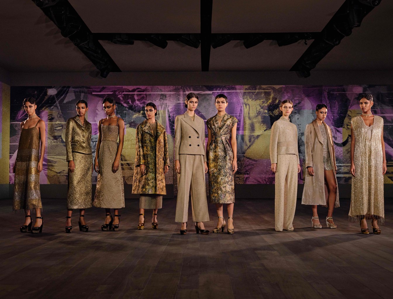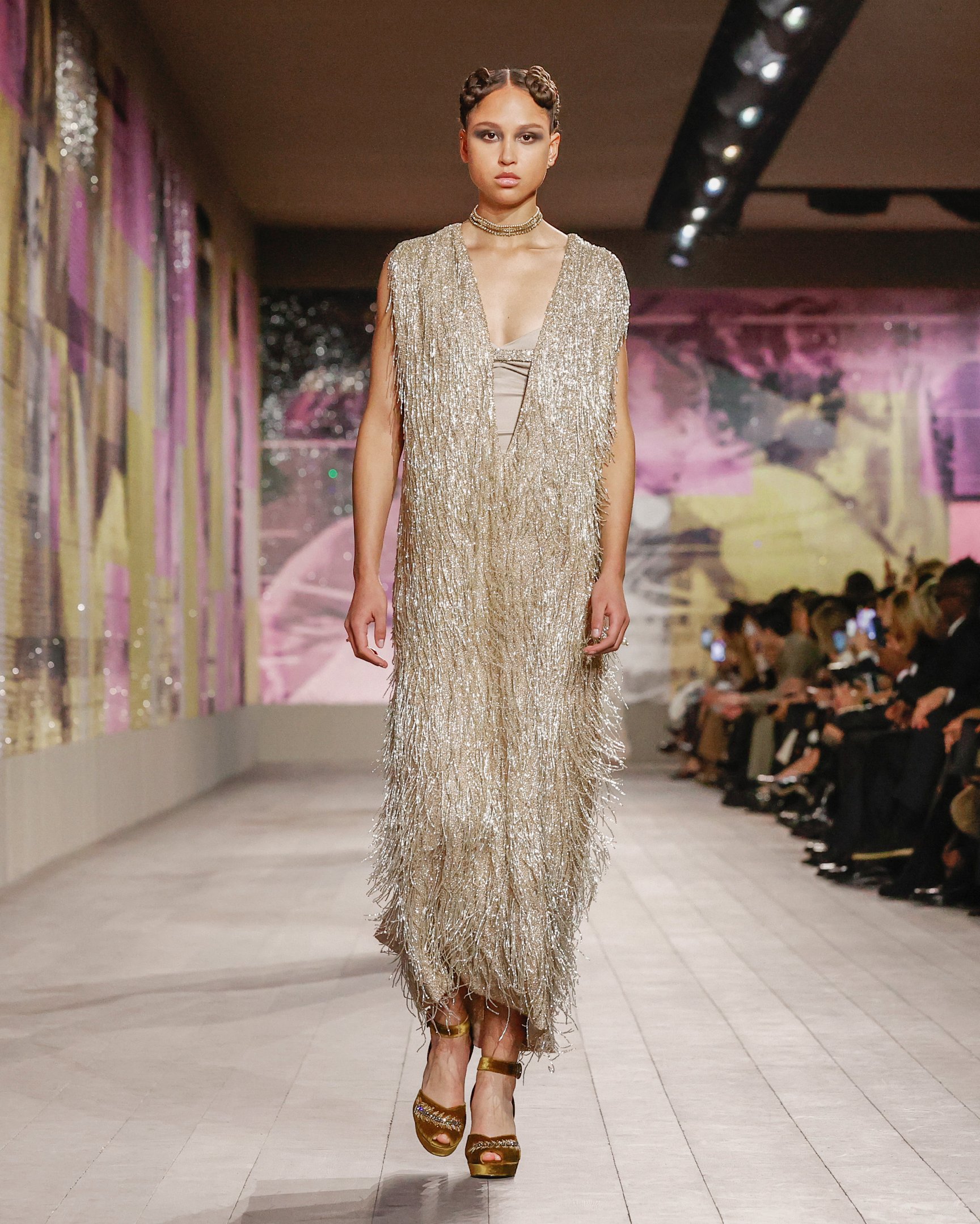 ベイカーと言えば、キャバレーの世界を広く世に知らしめたグラマラスなアイコン。戦後のヨーロッパで絶賛され、ニューヨークのストランドシアターやカーネギーホールで行われた公演では、ディオールをはじめとするフランスのファッションをまとってパフォーマンスを行なっていたという。シルバーとゴールドのフラッパードレスなどは、当時のベイカーの衣装を彷彿とさせる。また、小さくカールさせたモデルたちの前髪も、ベイカーのアイコニックな髪型を取り入れたスタイルだ。