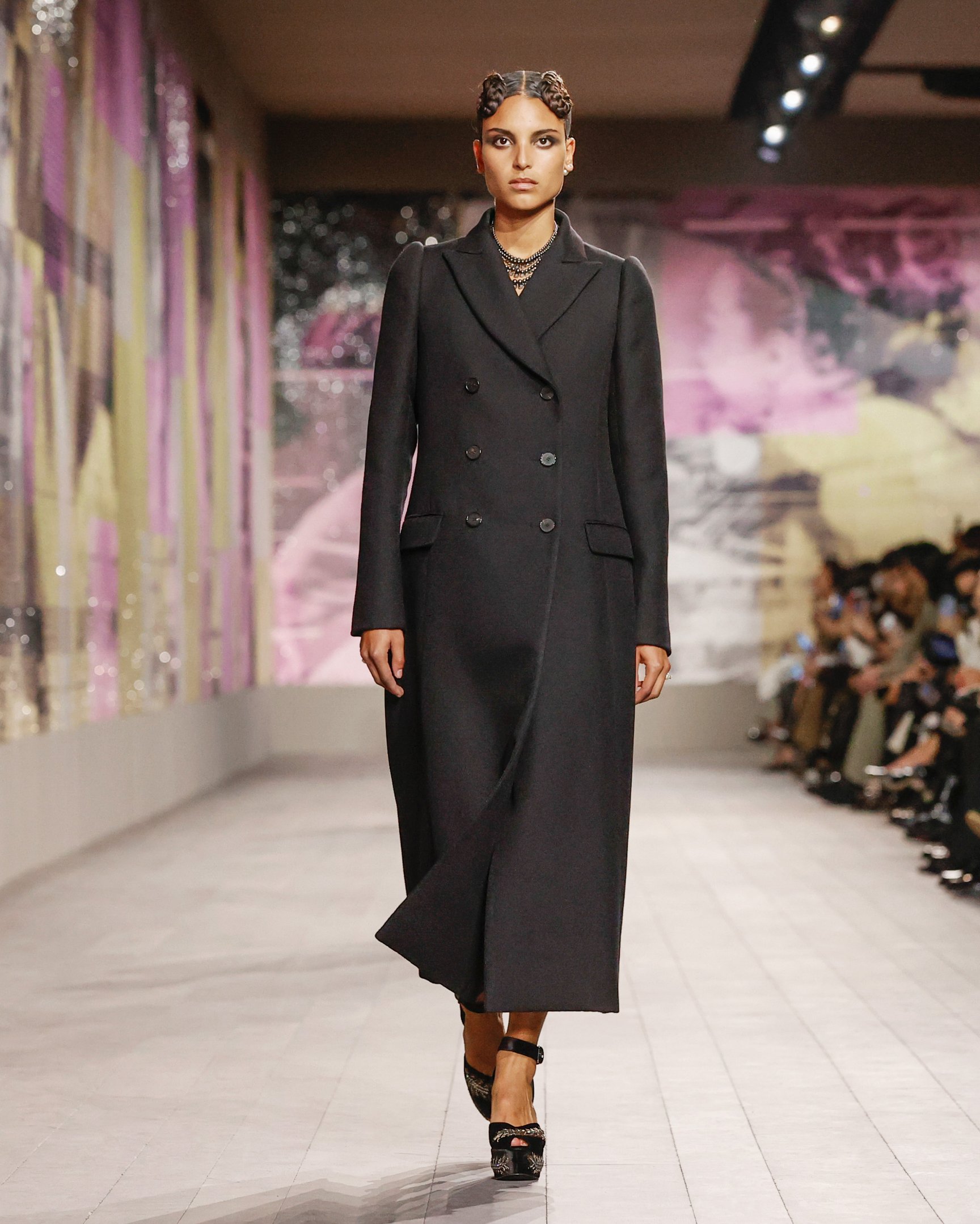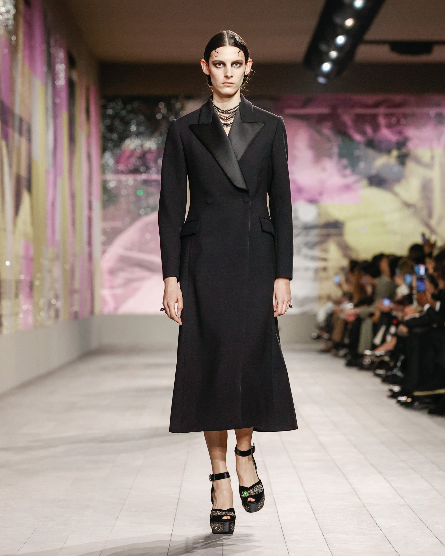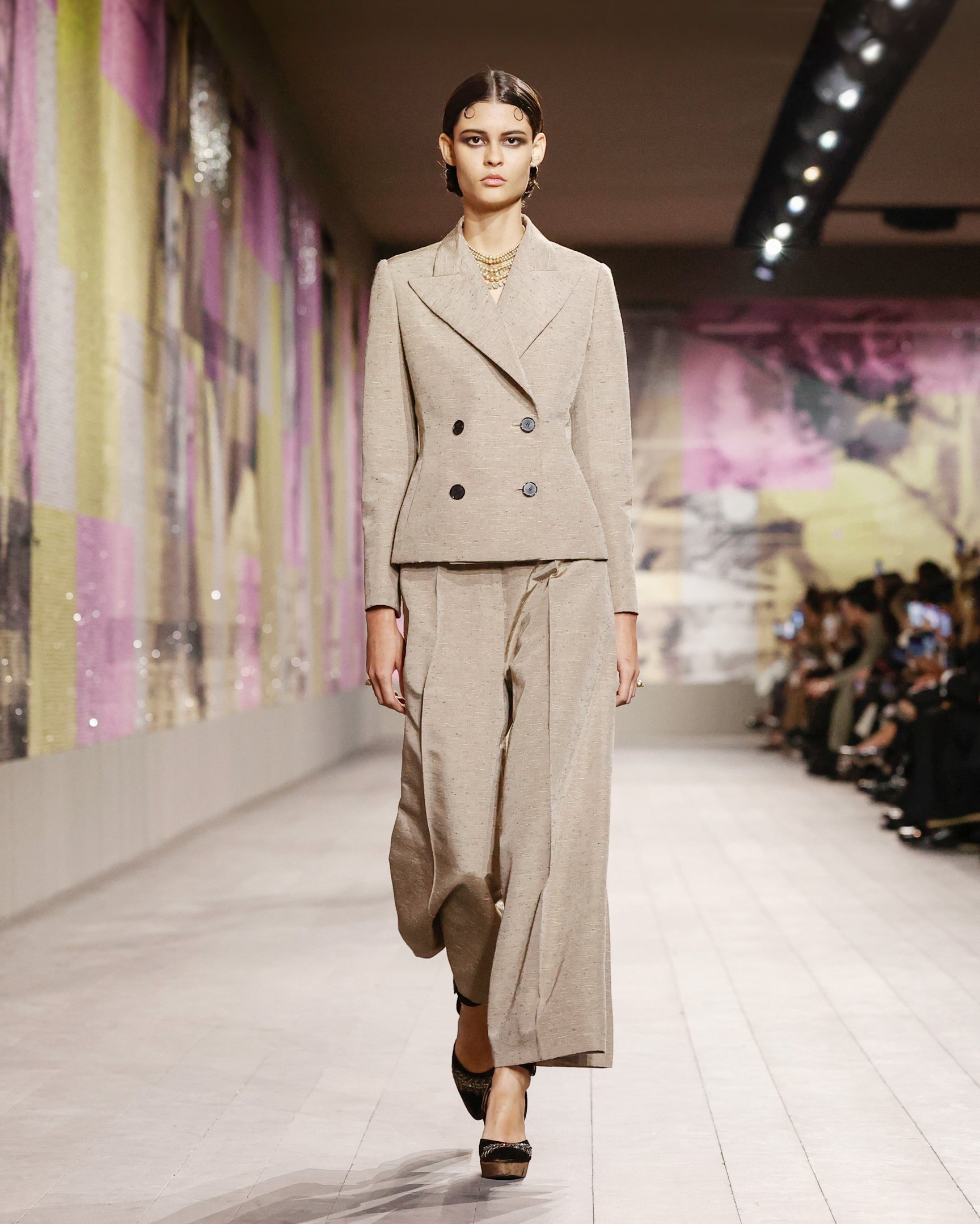 登場したルックの多くは、1950年代のクラシックを現代的に再解釈したもの。色調は上品なパウダーカラーとブラックがメインとなり、ムッシュ ディオールの愛したマスキュリンなファブリックをスーツやコートに取り入れた。グレーのパンツスーツは、戦争中にベイカーが着用した軍服から着想を得たものだという。