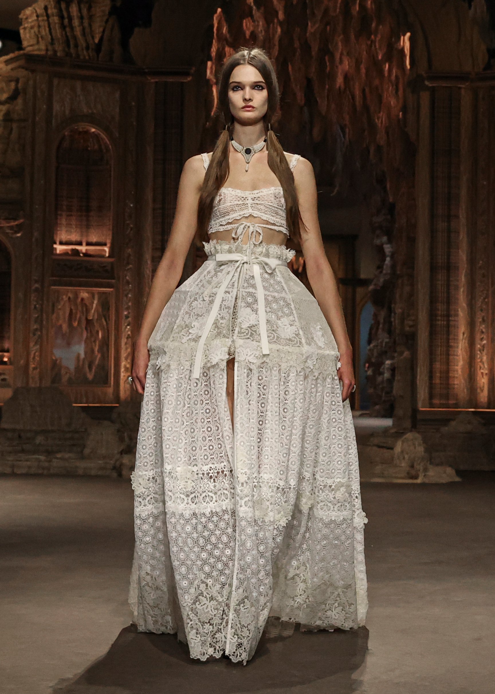 コレクションの中でも目を引いたのは、宮殿で着用されていたようなクリノリン・スタイル。そしてコルセットやゴールドの手袋、花の刺繍などバロックの要素を現代的に解釈したルックが多数登場した。