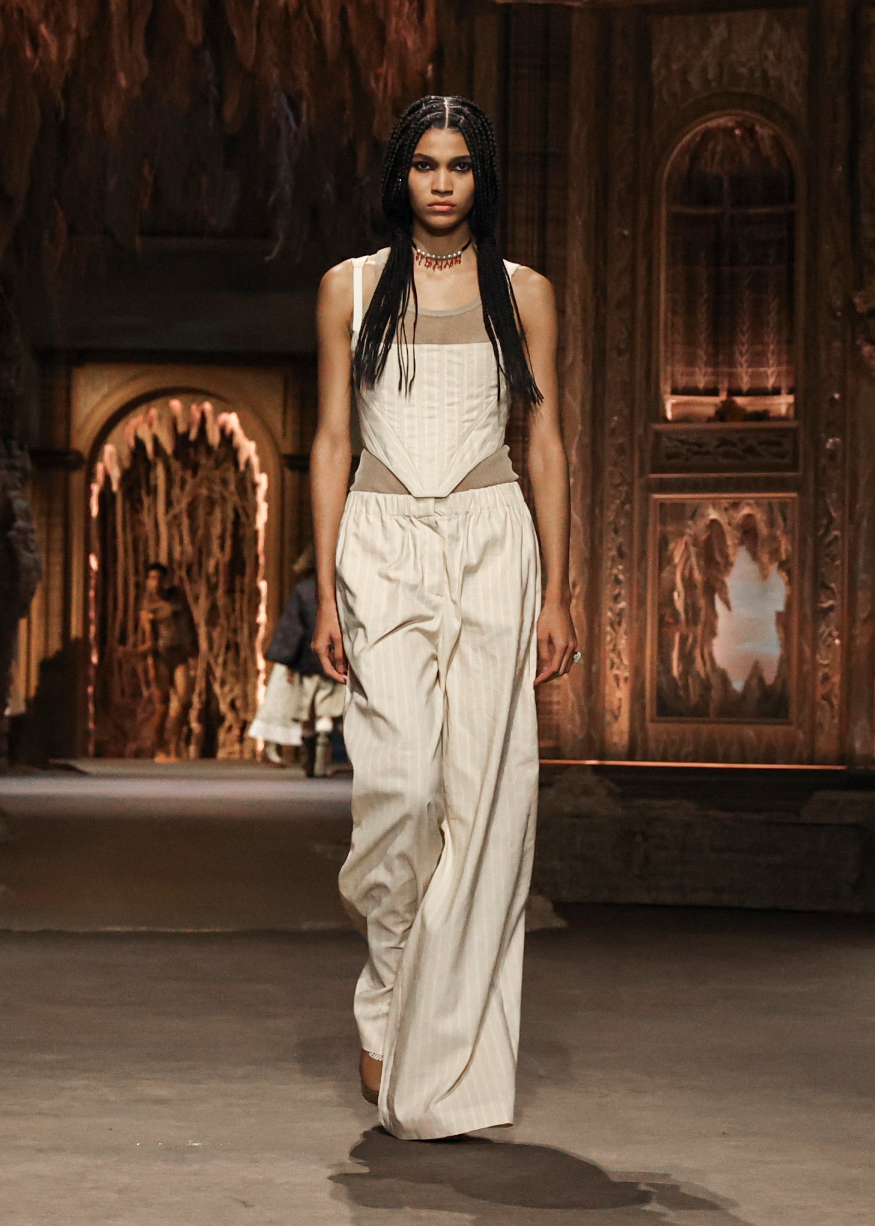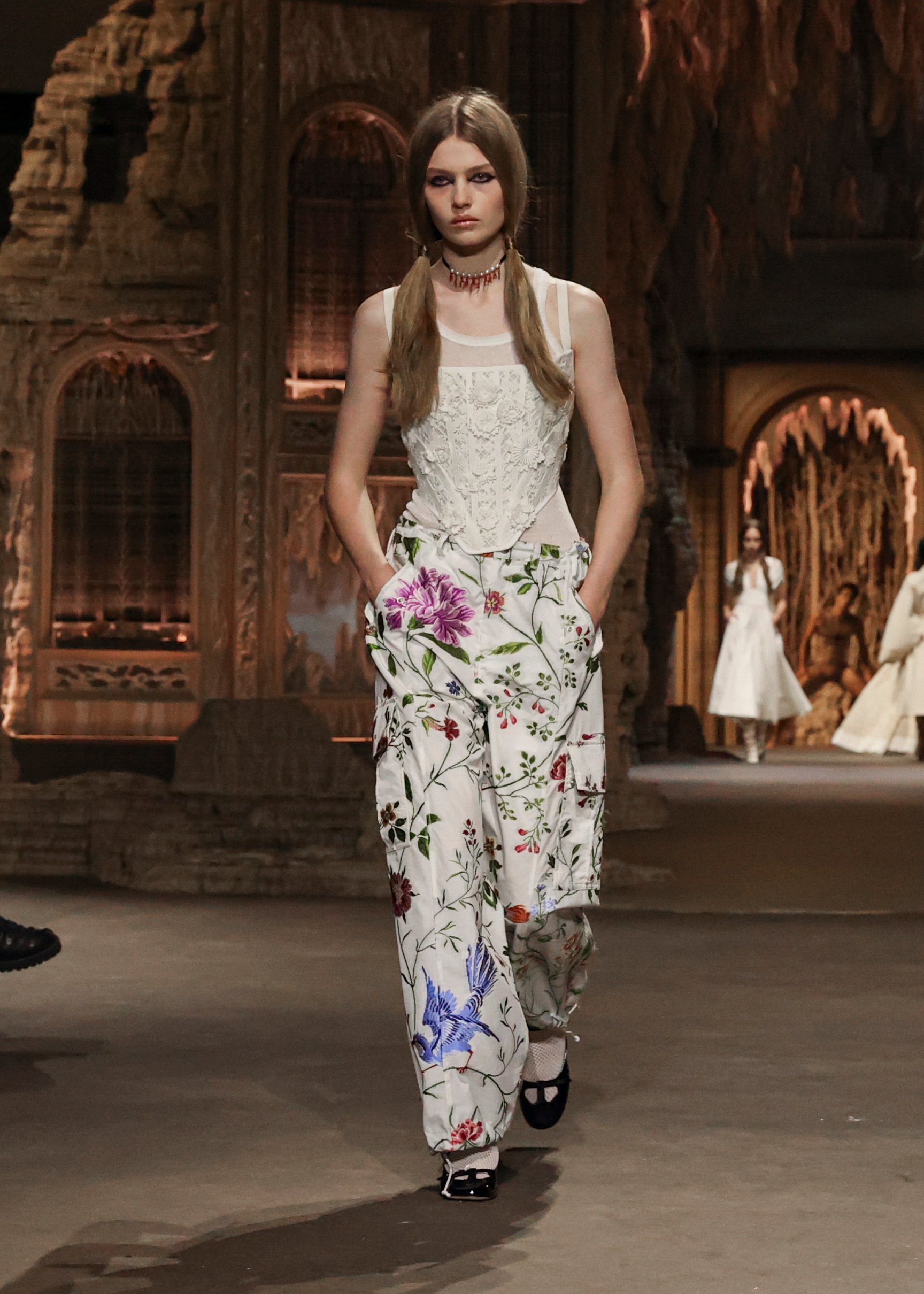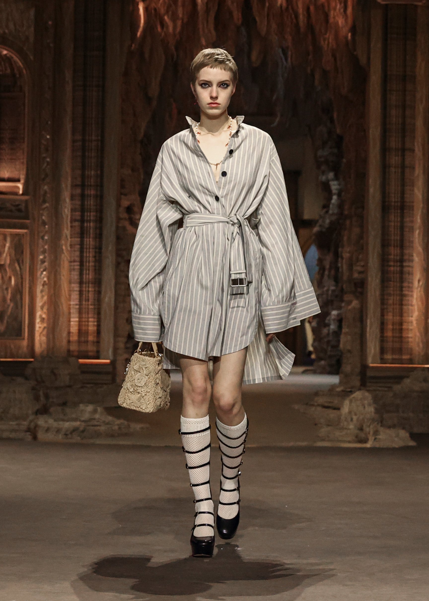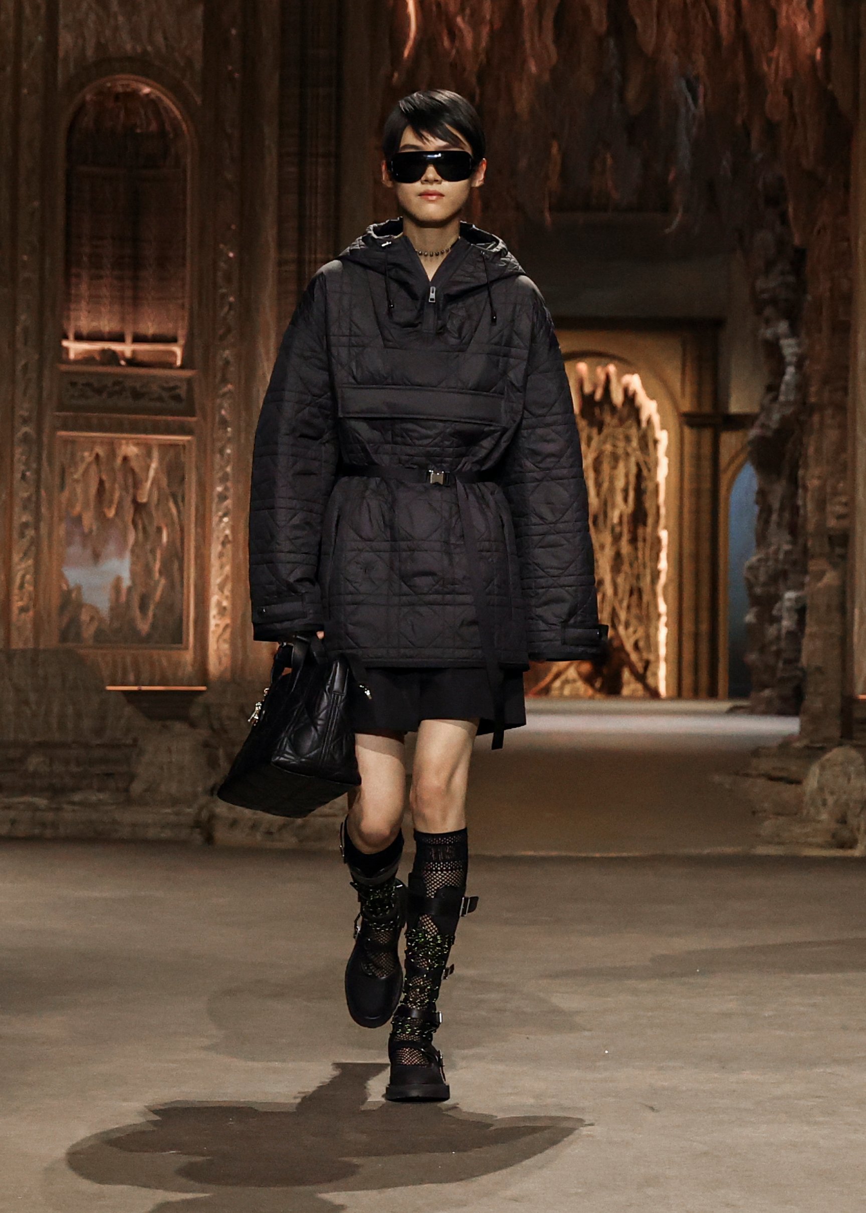 一方で、ディオールのカナージュを施したフーディ、デニム、トレンチコートなど、ウェアラブルなルックも提案され、キウリの絶妙なバランス感を印象付けた。