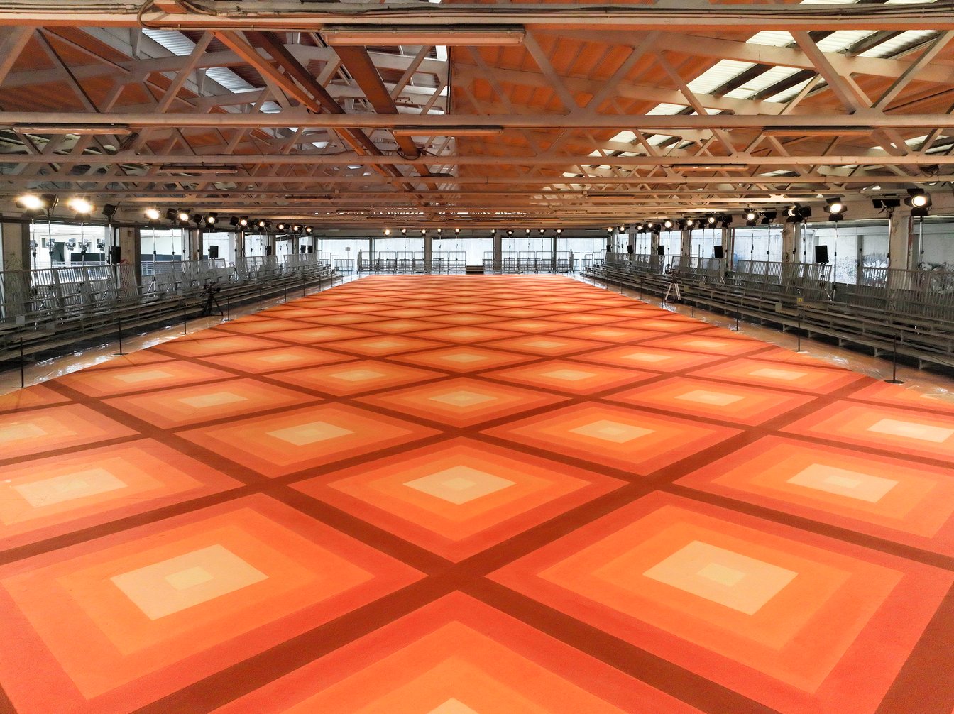 ファーストコレクションとなった今回のテーマは「ETROPÍA(エトロピア)」。メゾンのヘリテージに軽さとシンプルさを加え、「自分らしさを求めて、現実と想像を行き来する旅」を表現したという。会場となった広大な産業会館の床には、サイケデリックなパターンが描かれていた。