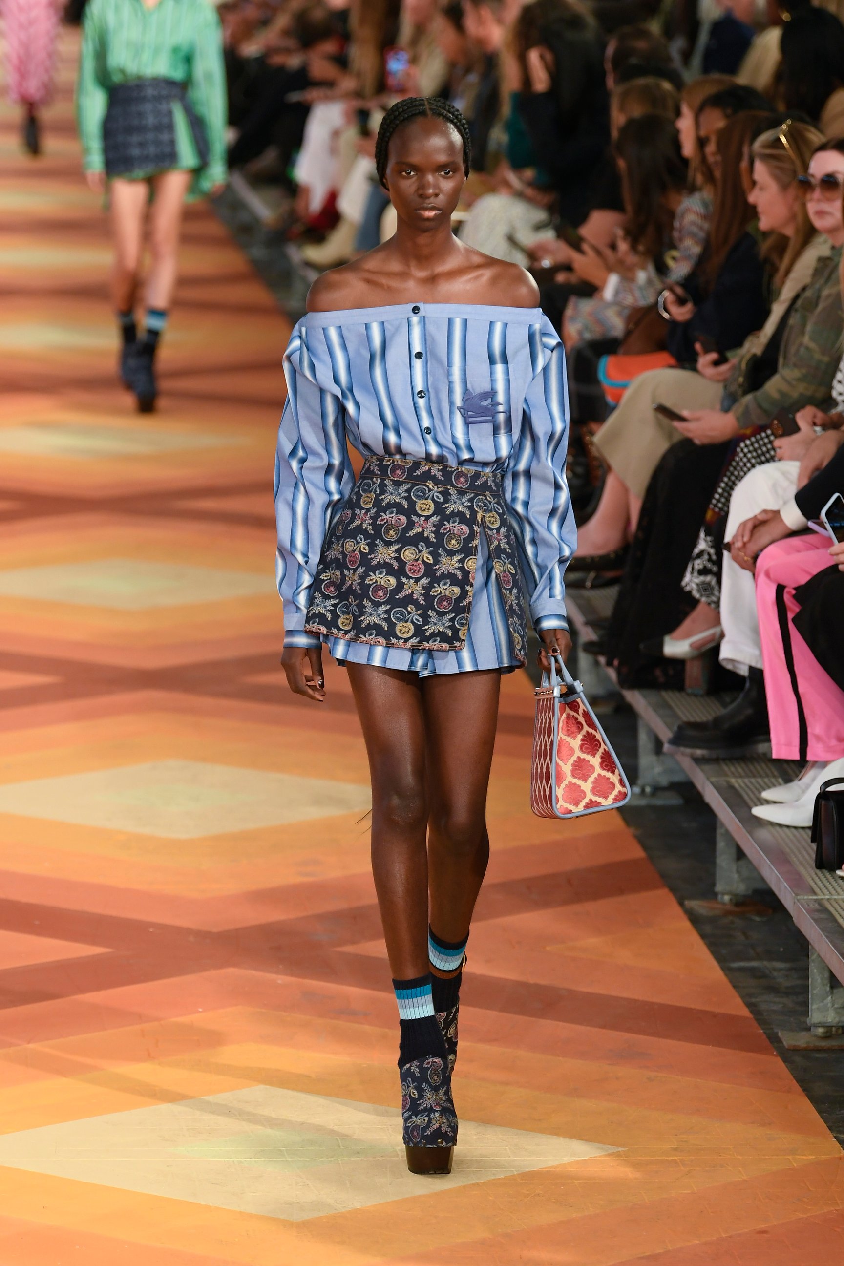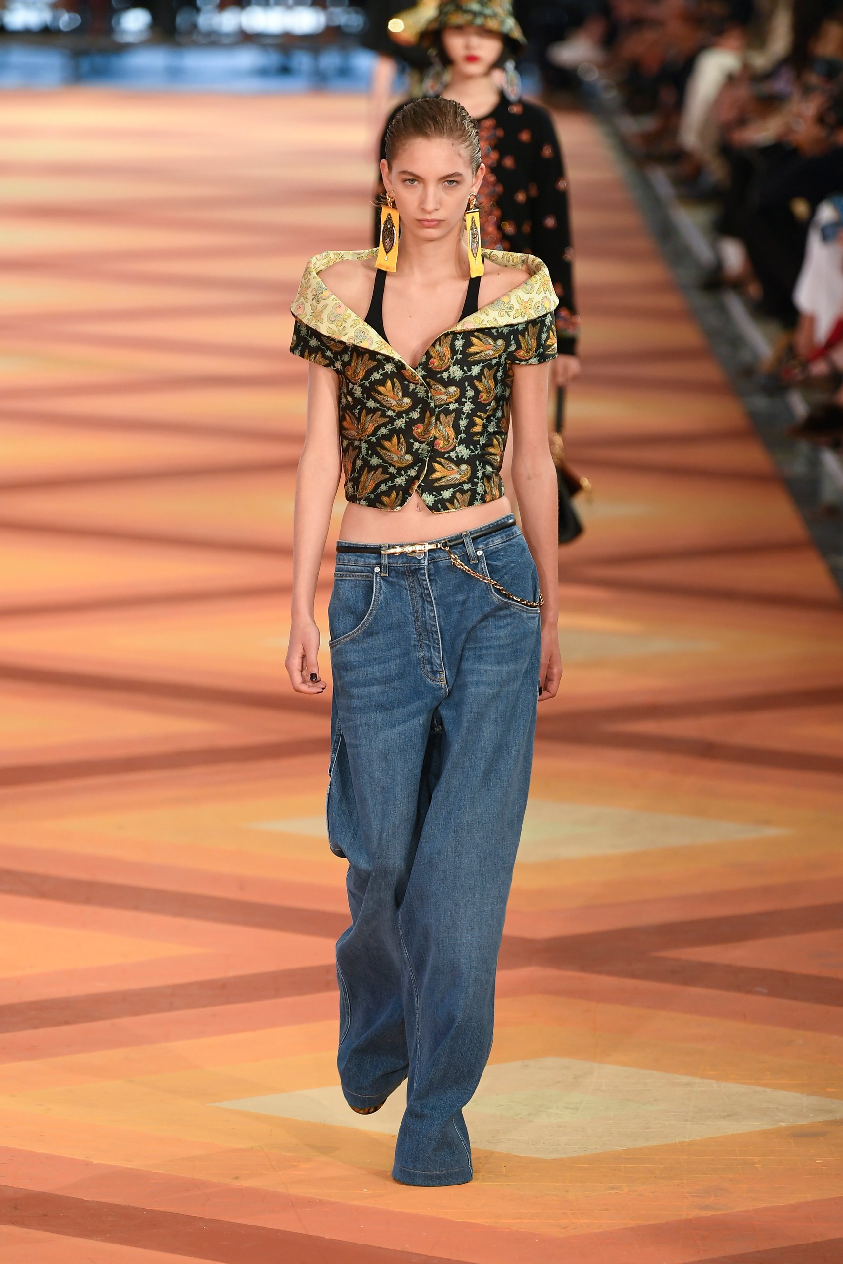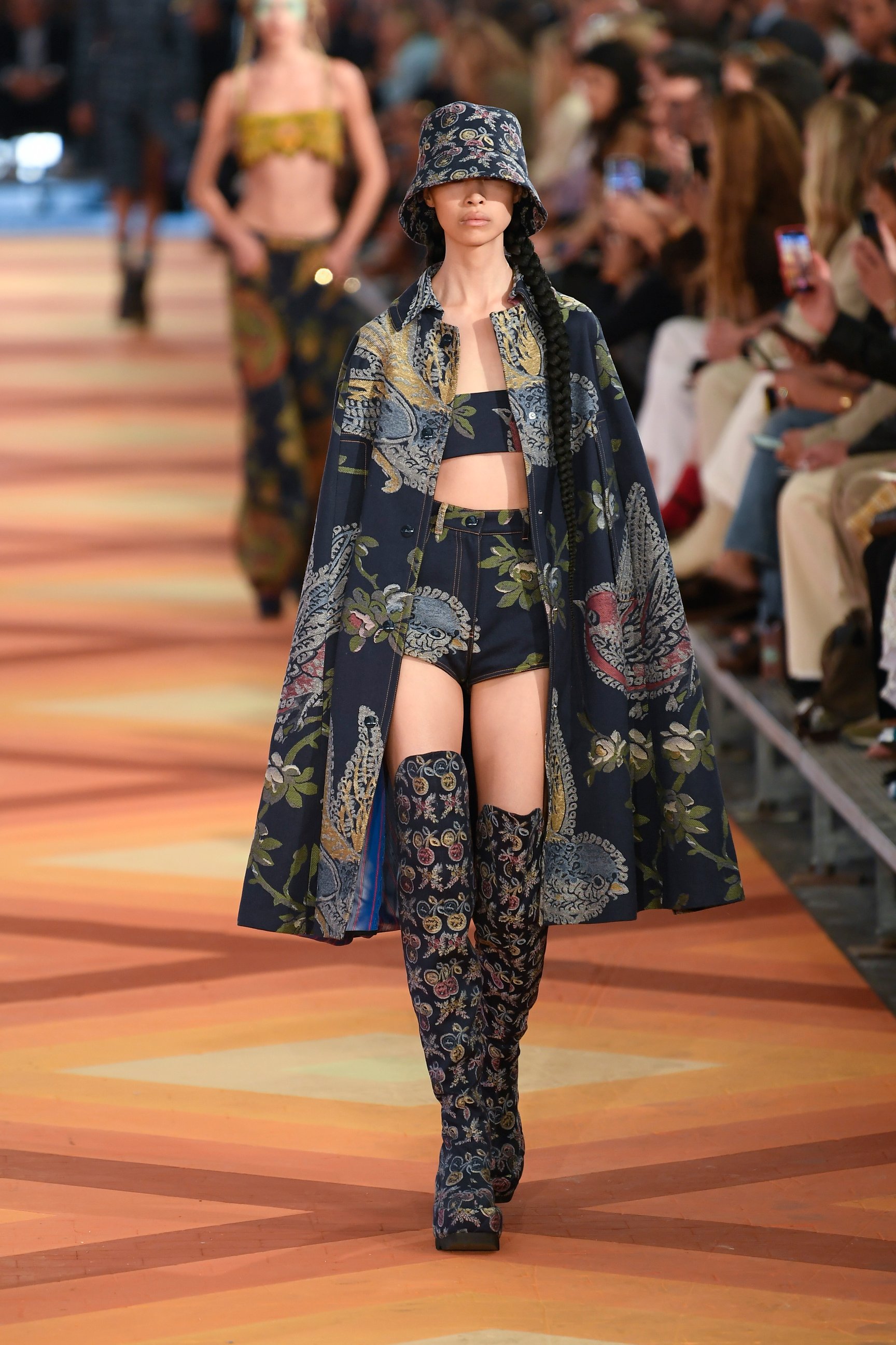 クロップトップやショートパンツ、ミニドレスに合わせたソックスなど、若々しいスタイリングが印象的な今回のコレクション。だが、手染めのマルチカラーのカシミアやデニムのブロケードなど、ブランドが誇るテクニックやメイド・イン・イタリーならではの装飾主義は健在。マルコはメゾンの美学を踏襲しつつも、フレッシュなクリエイションで"新生エトロ"を世界にアピールした。