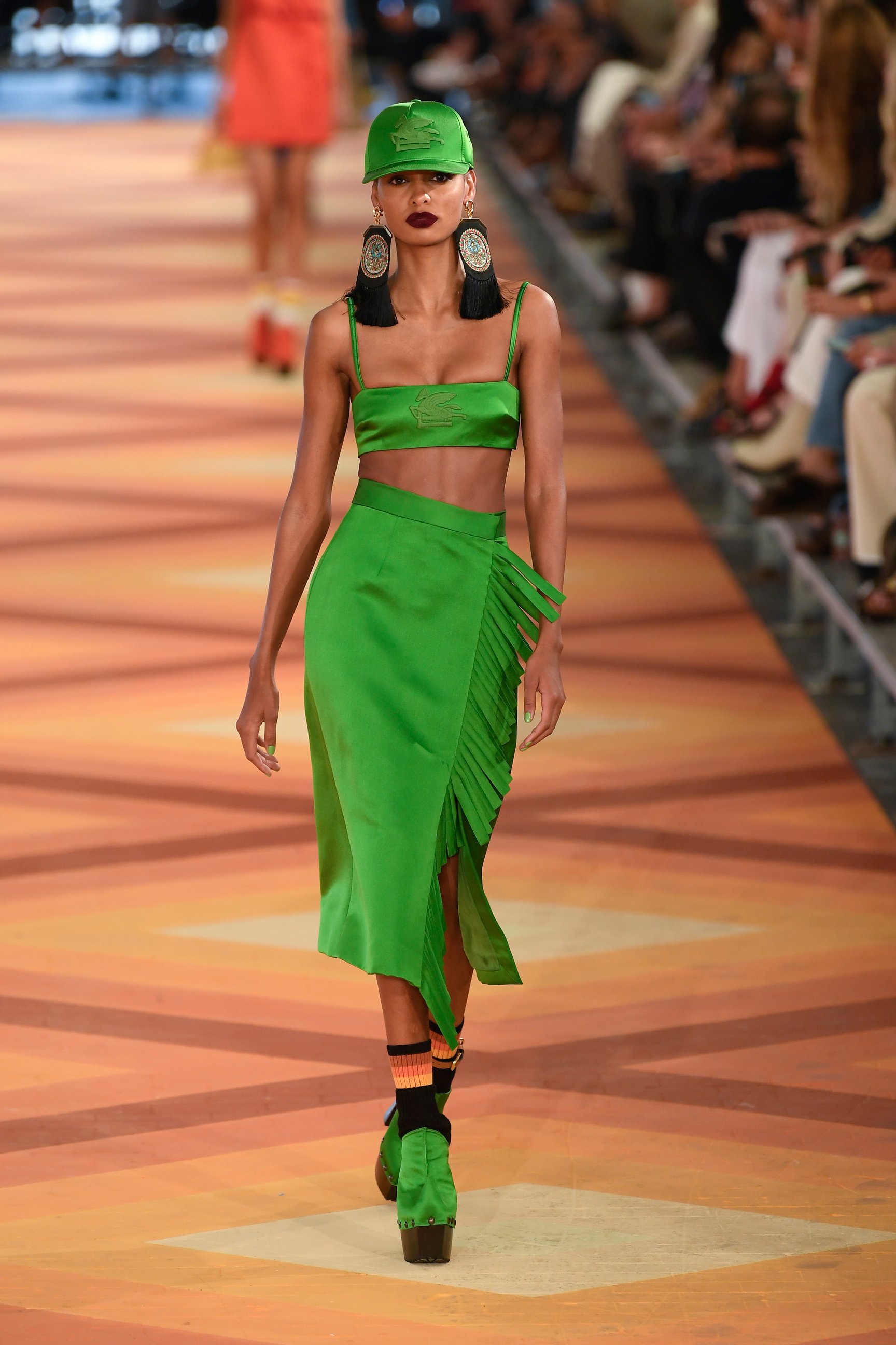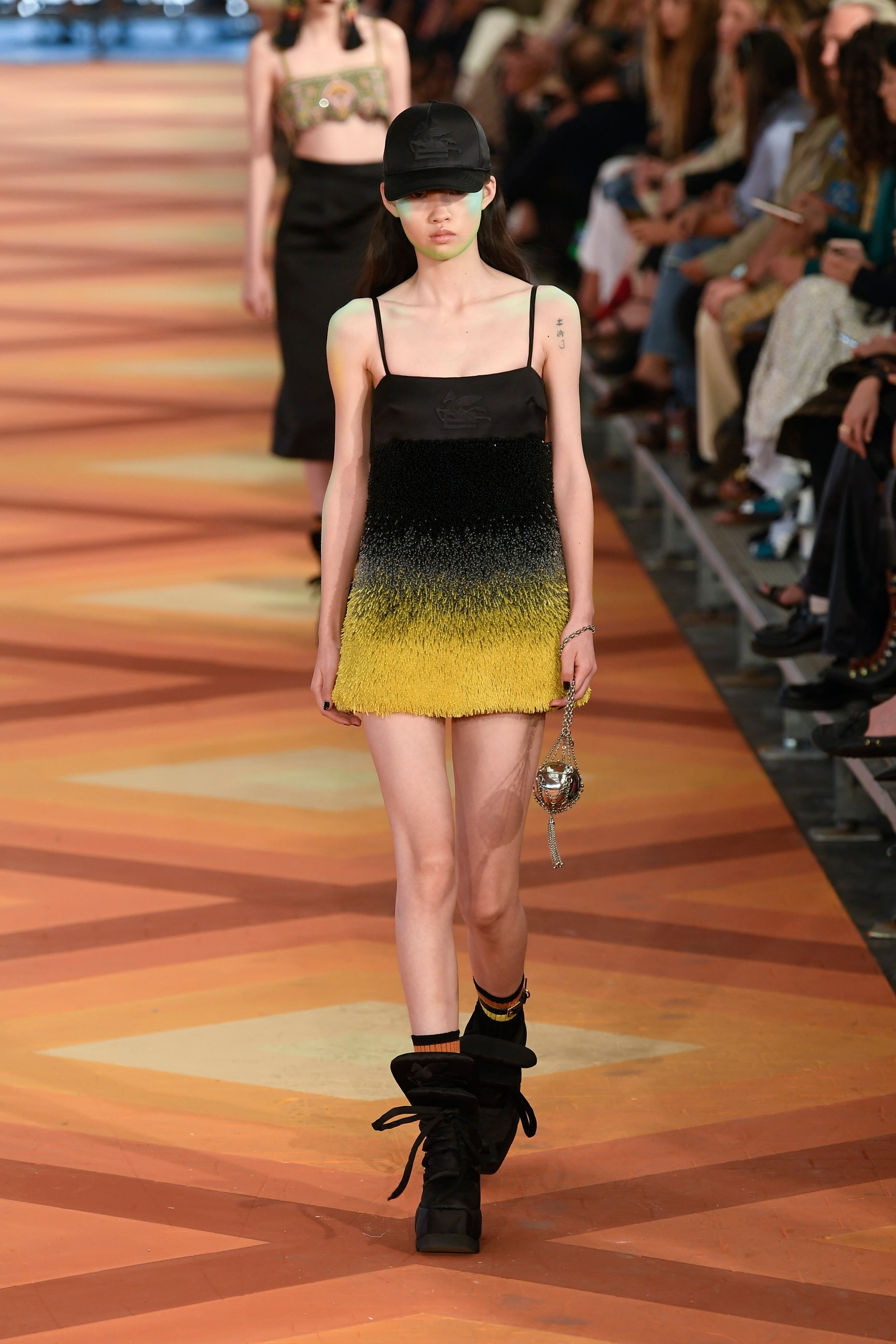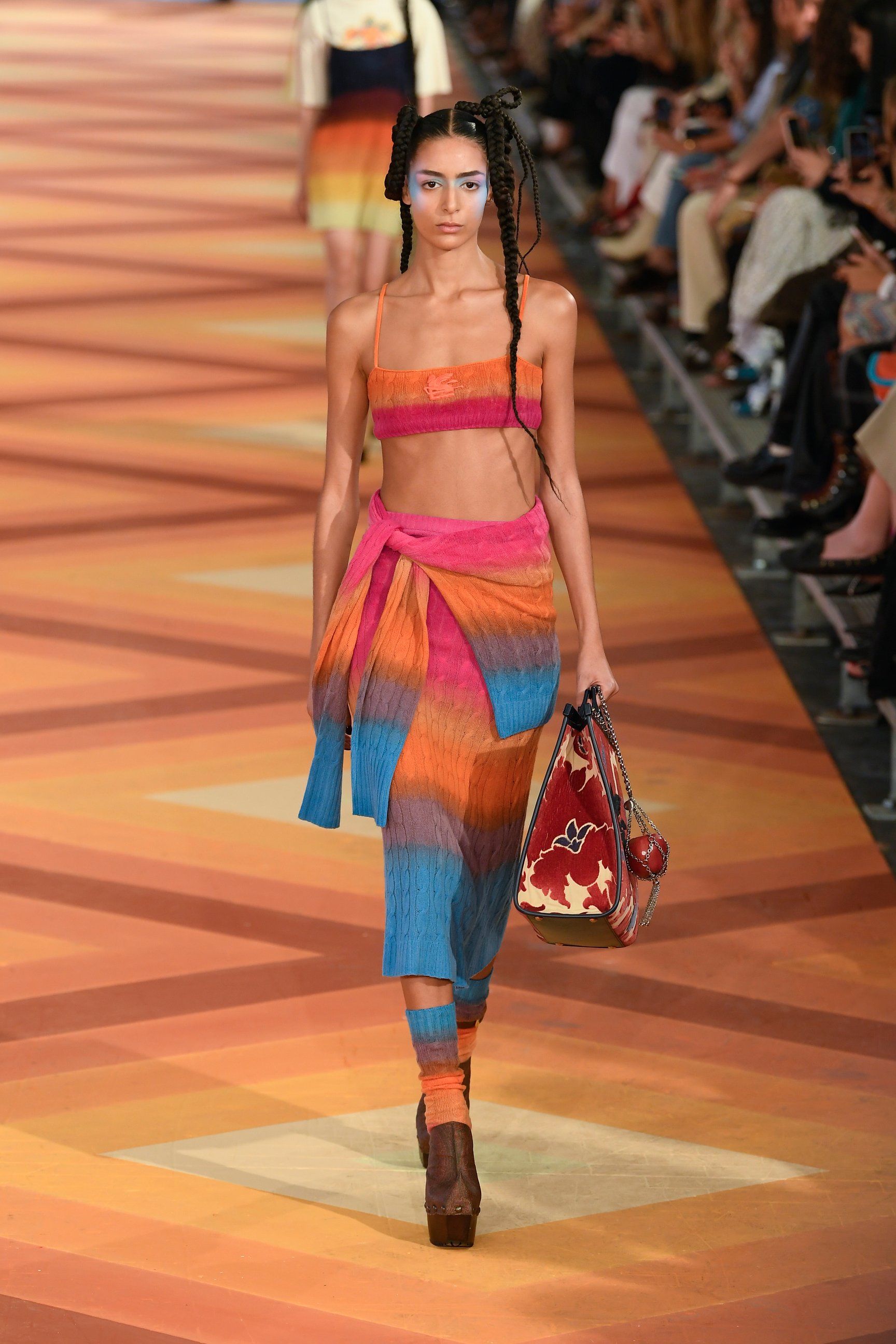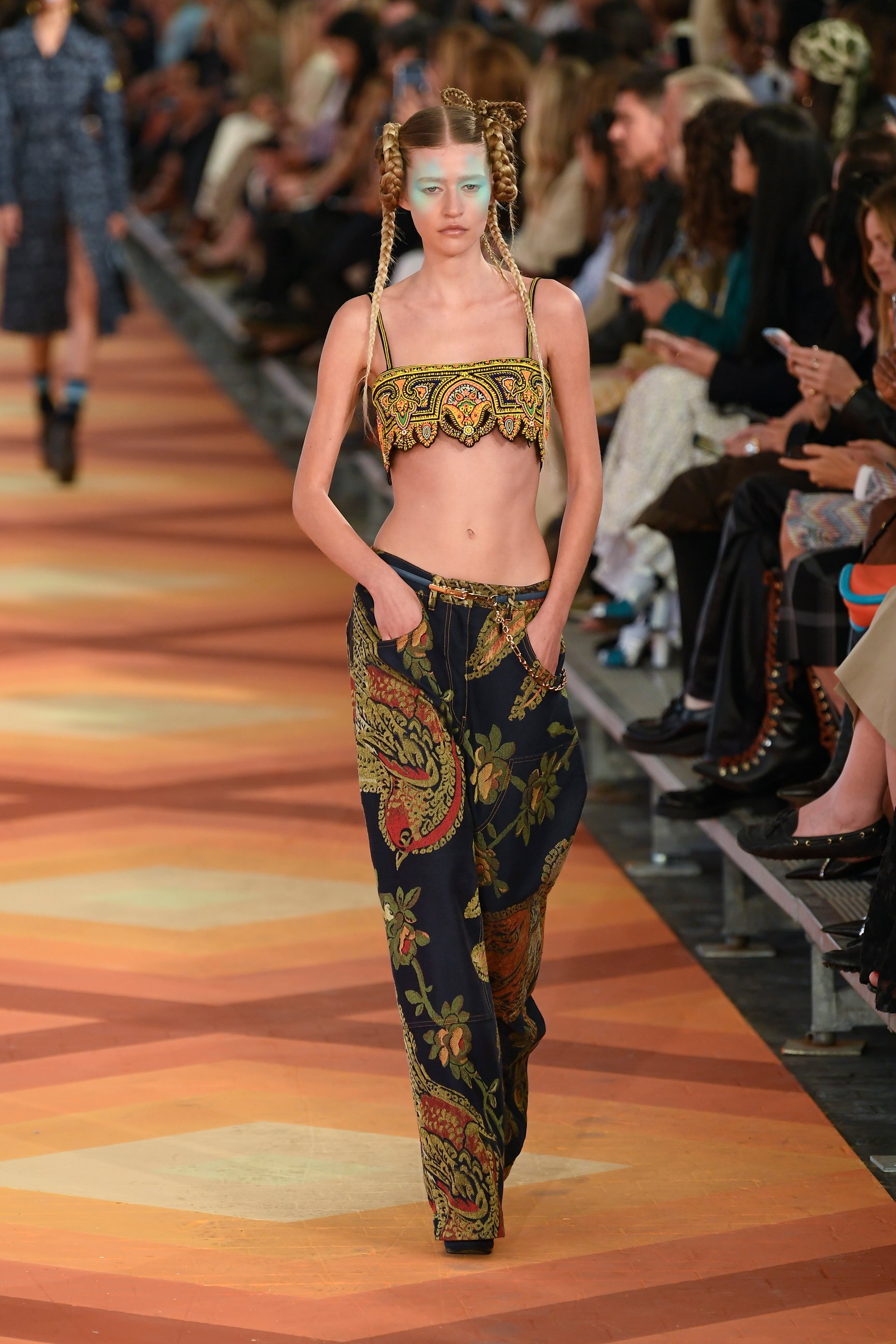 クロップトップやショートパンツ、ミニドレスに合わせたソックスなど、若々しいスタイリングが印象的な今回のコレクション。だが、手染めのマルチカラーのカシミアやデニムのブロケードなど、ブランドが誇るテクニックやメイド・イン・イタリーならではの装飾主義は健在。マルコはメゾンの美学を踏襲しつつも、フレッシュなクリエイションで"新生エトロ"を世界にアピールした。