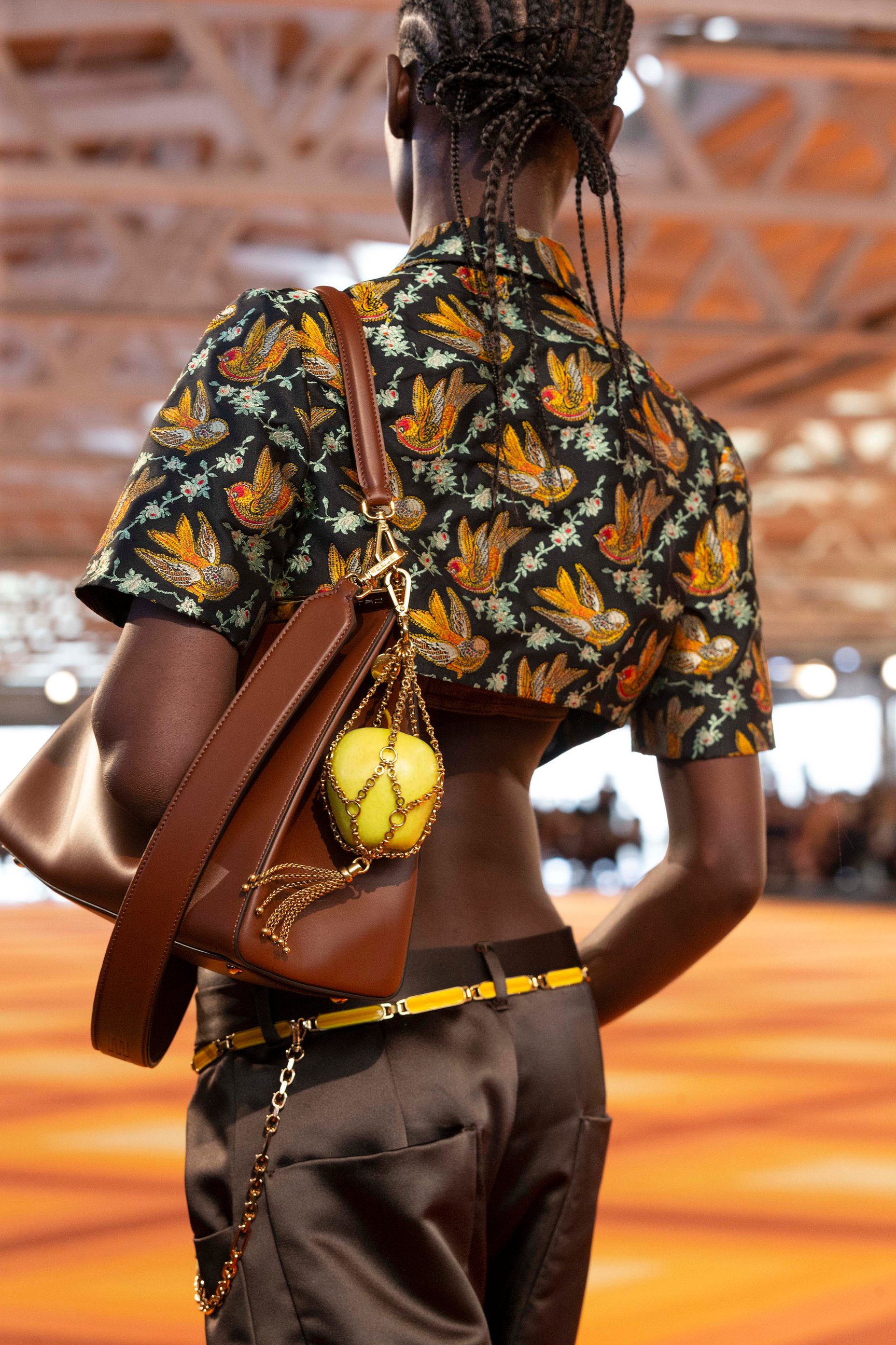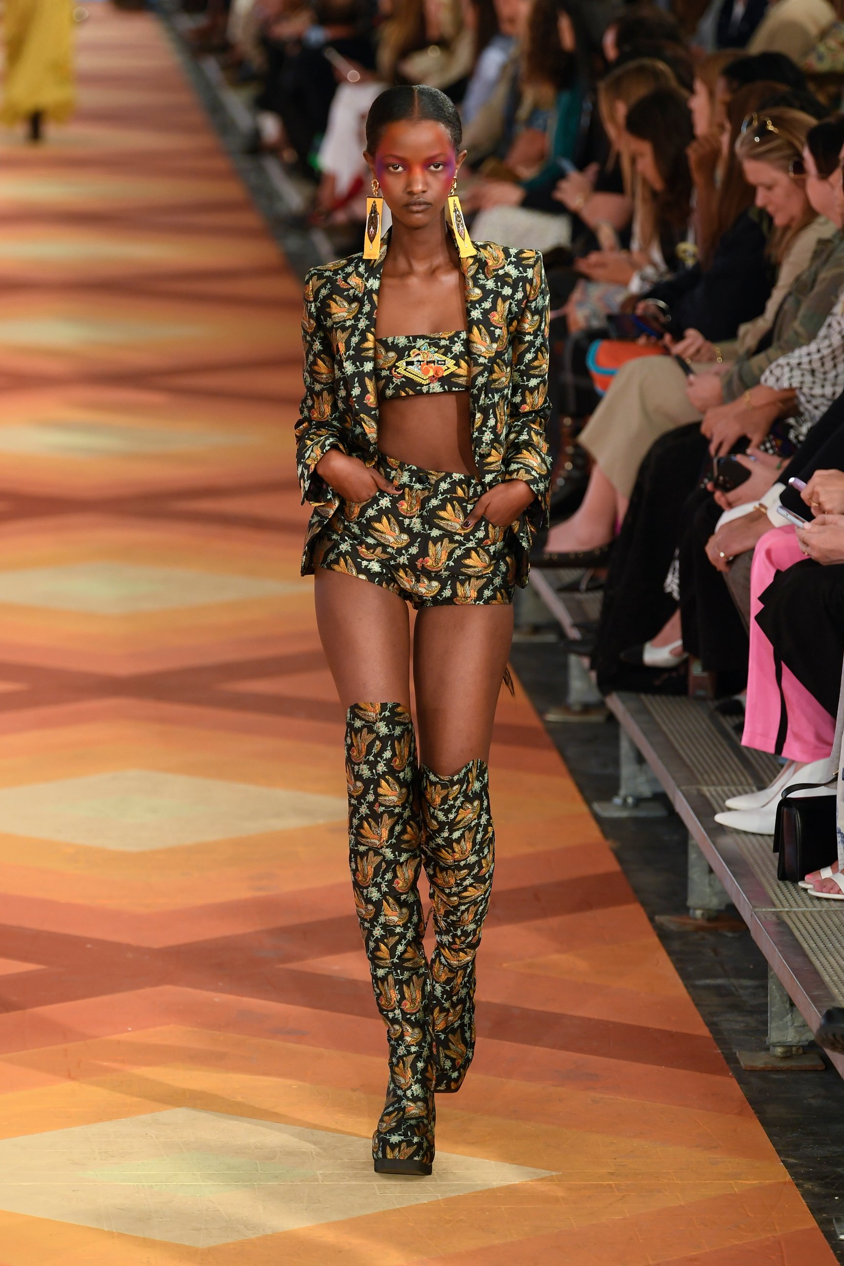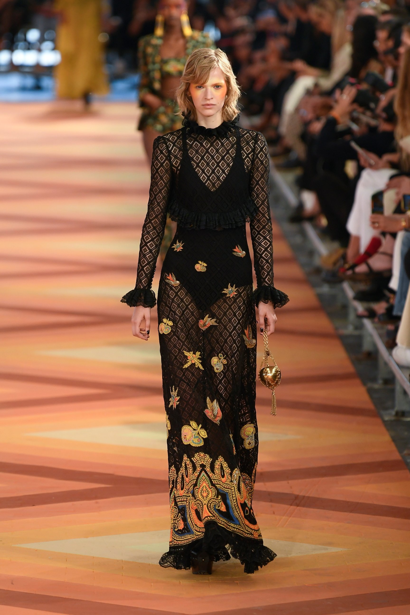 メゾンのシグネチャーだったペイズリー柄やボーホーシックなアイテムの代わりに登場したのは、贅沢なジャカードやインターシャ。エキゾチックな花や鳥、フルーツのモチーフが生地にあしらわれ、精巧な刺繍も目を引いた。また、アラジンスタイルの厚底サボやビッグサイズのフリンジピアスなど、多文化のミックス&マッチがフレッシュな魅力を引き立てている。