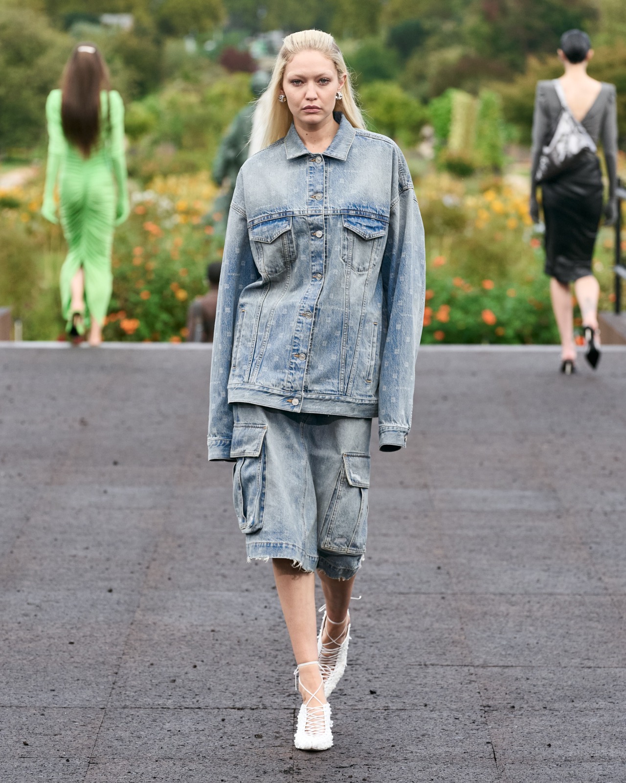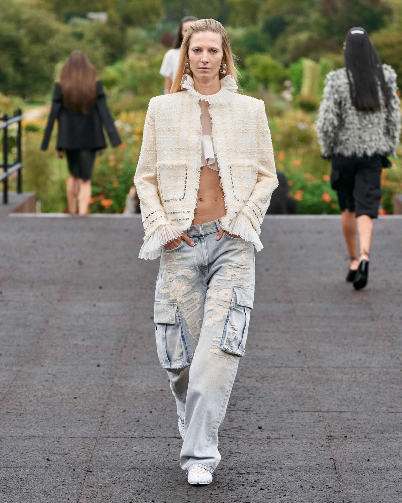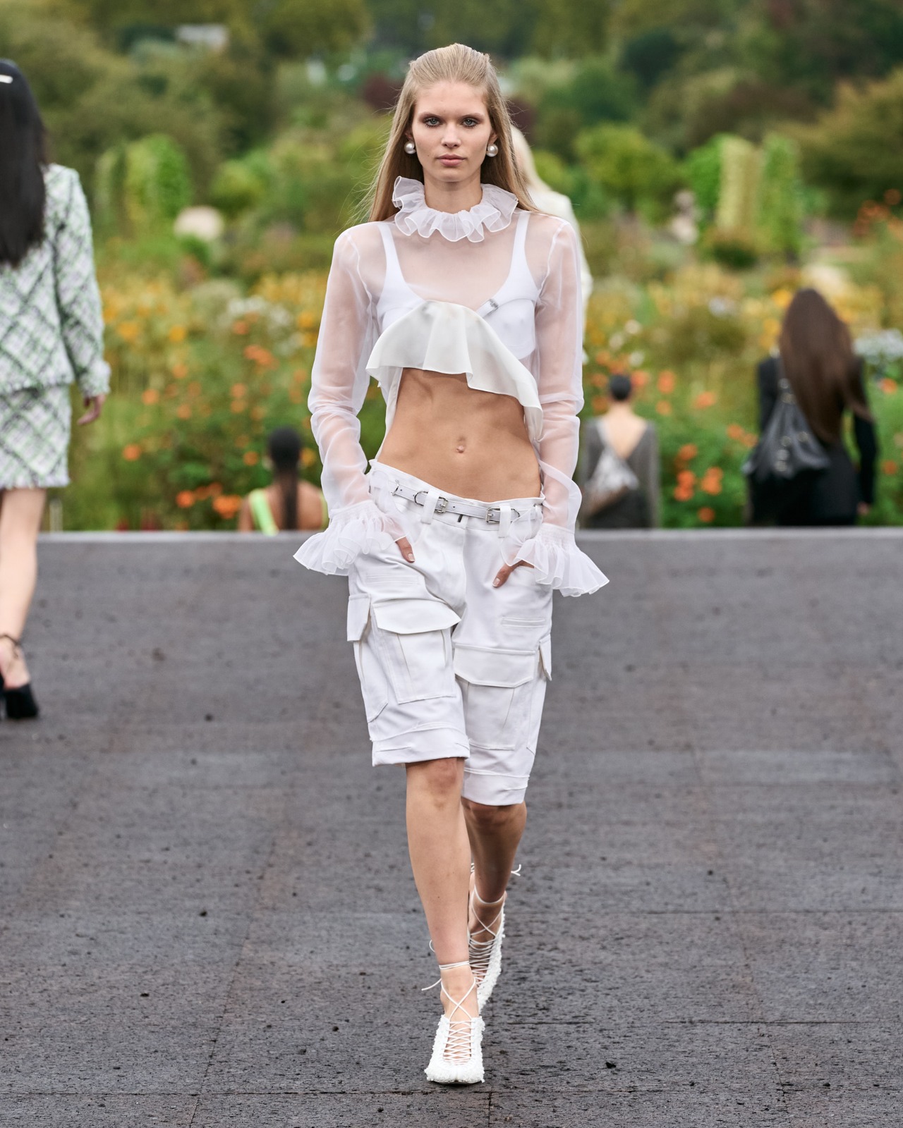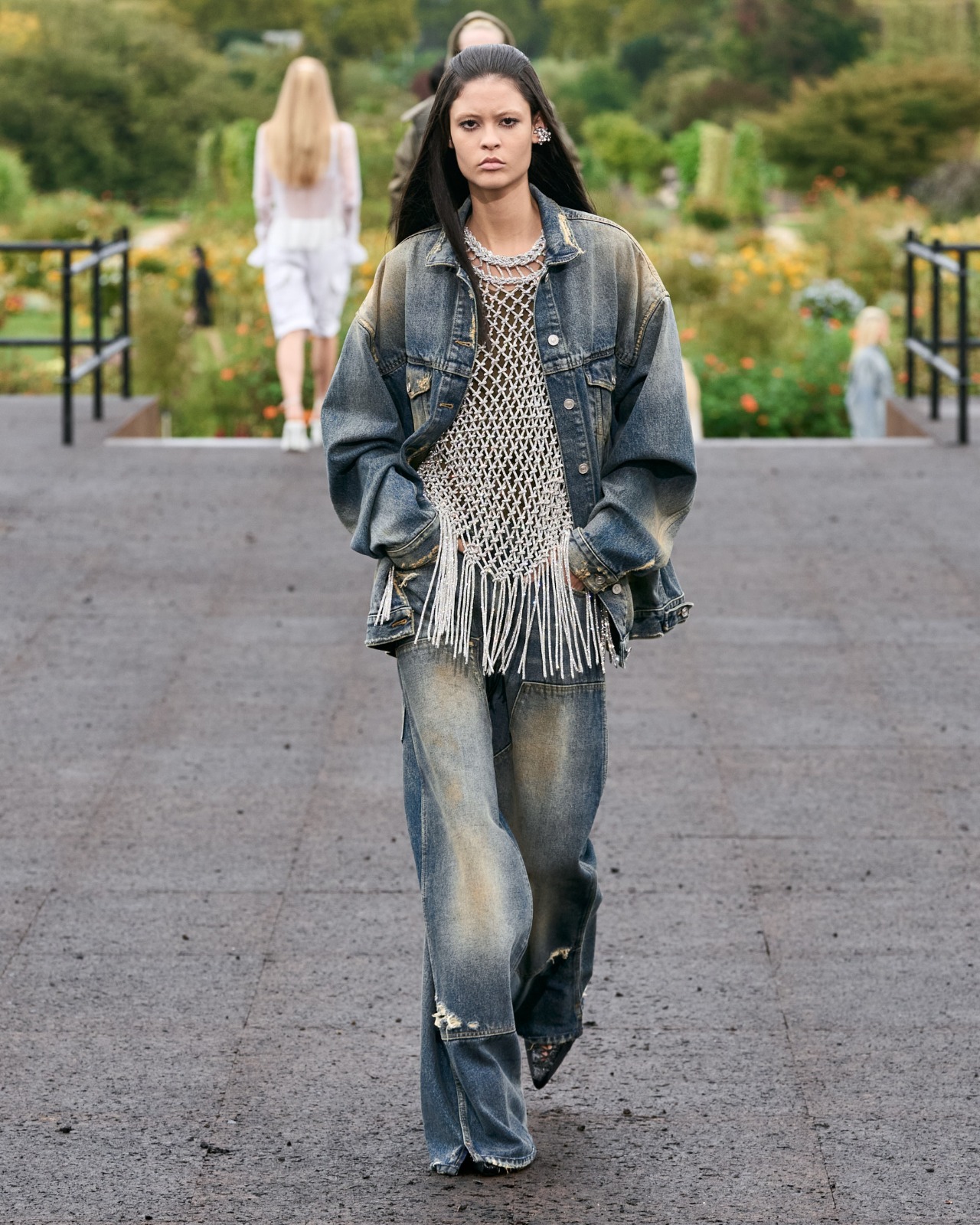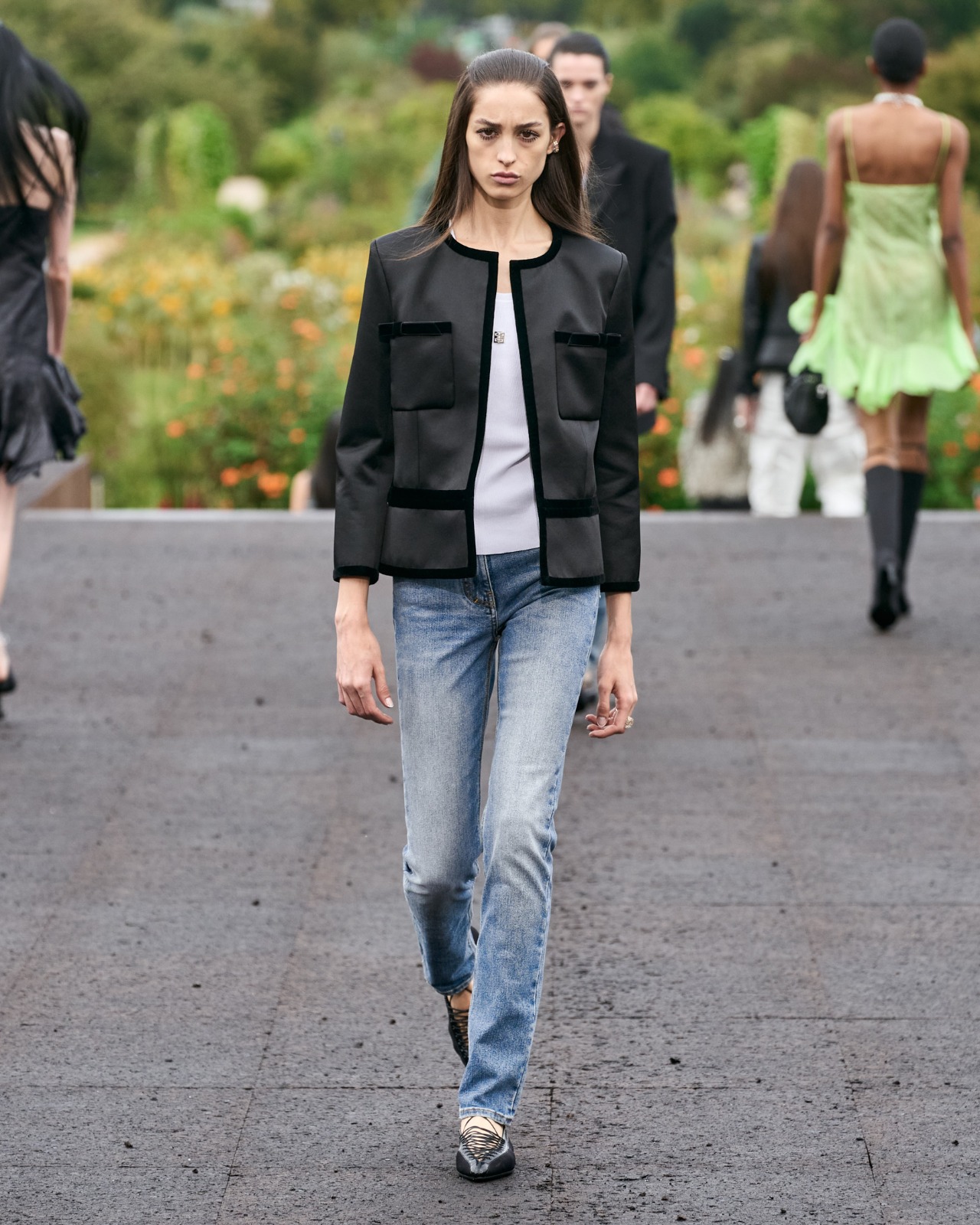 テーマは、コスモポリタンなドレスコードの「異文化交流」。かつてメゾンの創設者ユベール・ド・ジバンシィ(Hubert de Givenchy)がアメリカ映画界に貢献をしたのと同じように、パリとロサンゼルスが発信する異なるスタイルの融合を試みた。モデルたちは、フェミニンなフリルトップスにカットオフのローライズデニムを合わせて登場。また、ツイードで仕立てたカーゴパンツといった、一着で異文化の融合を感じさせるアイテムも。